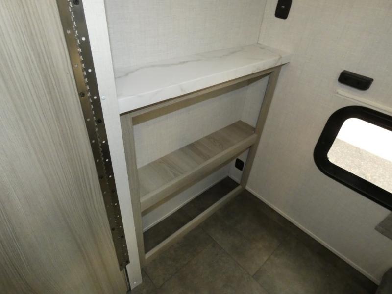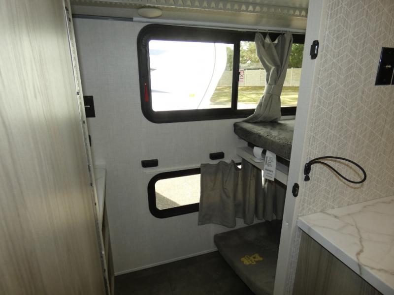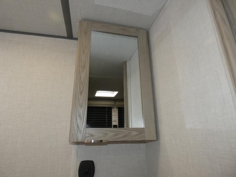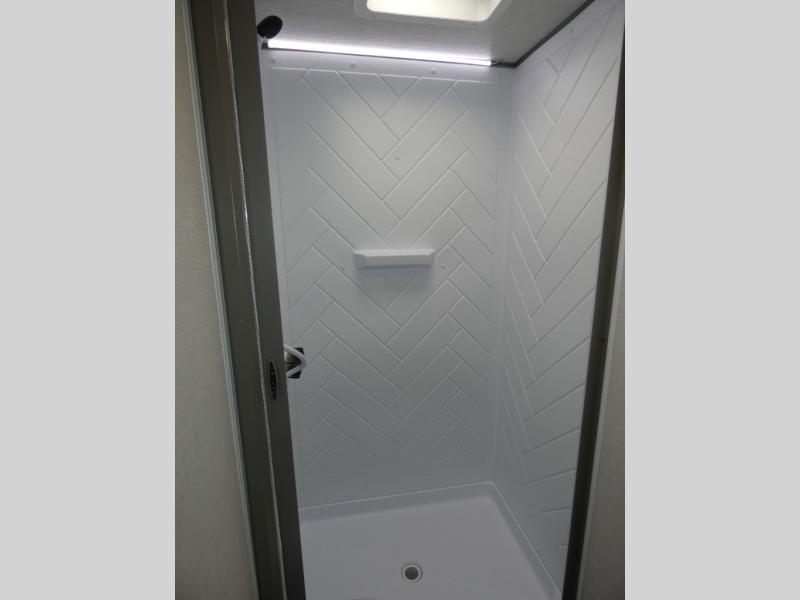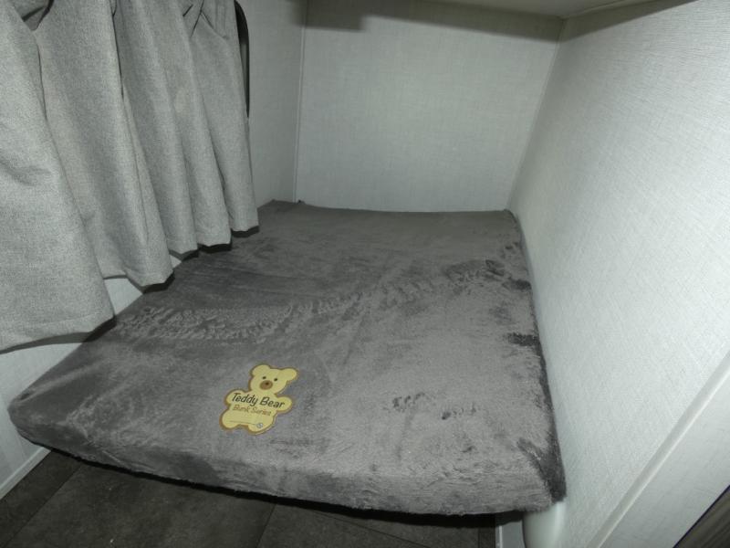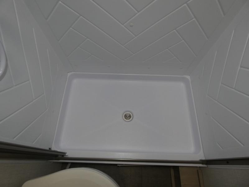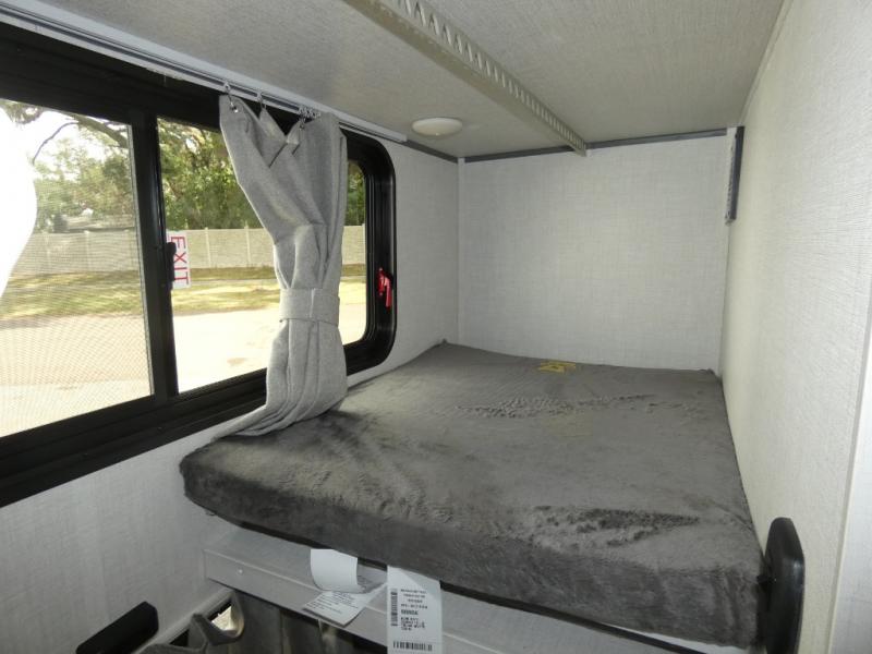 Perfect for your family, this single slide with split bunk and queen bed provides your family comfortable sleeping for four, and the slide adds a bit more interior space in camp. The split bunk is located behind the spice rack door and TV for your entertainment and cooking needs. Speaking of cooking, you can prepare your best home cooked meals with the cooktop, and store any leftovers in the dual swinging 12V refrigerator. Relax each night in the theater seating and freshen up in the rear corner bathroom each morning which features a skylight over the shower for more natural lighting.