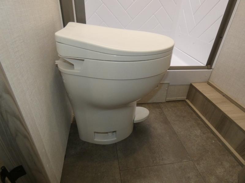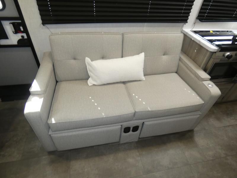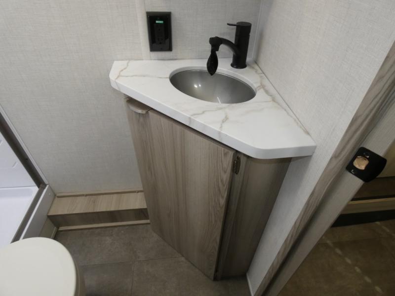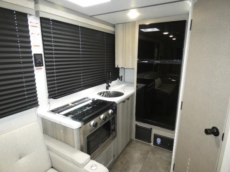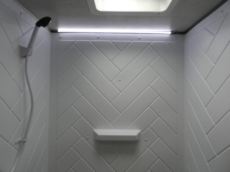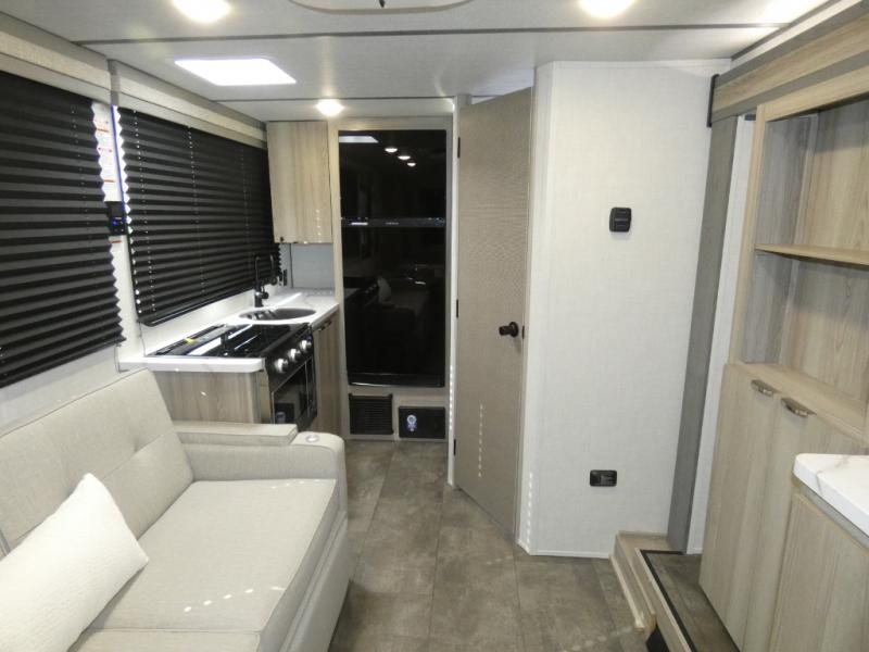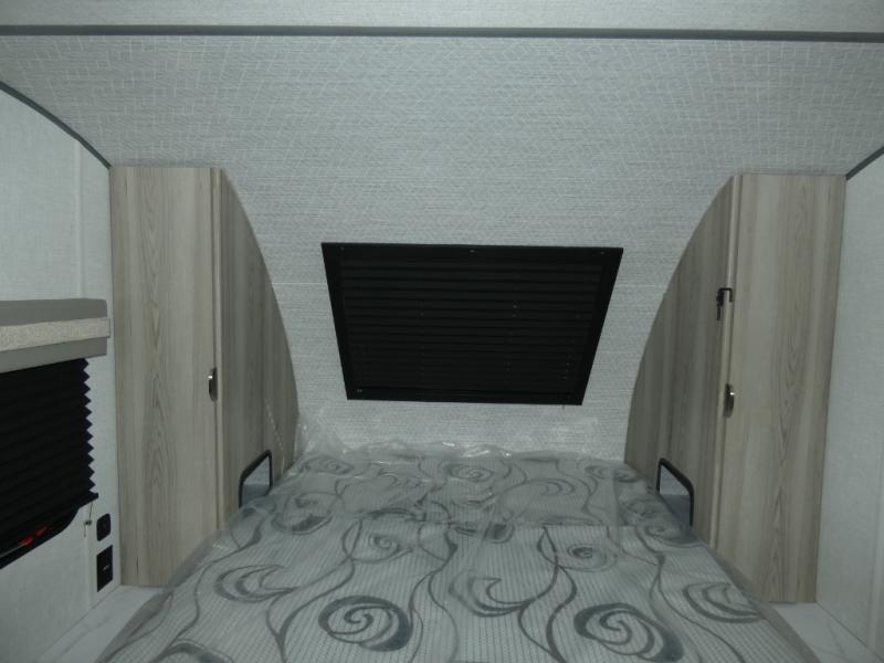 Perfect for your family, this single slide with split bunk and queen bed provides your family comfortable sleeping for four, and the slide adds a bit more interior space in camp. The split bunk is located behind the spice rack door and TV for your entertainment and cooking needs. Speaking of cooking, you can prepare your best home cooked meals with the cooktop, and store any leftovers in the dual swinging 12V refrigerator. Relax each night in the theater seating and freshen up in the rear corner bathroom each morning which features a skylight over the shower for more natural lighting.