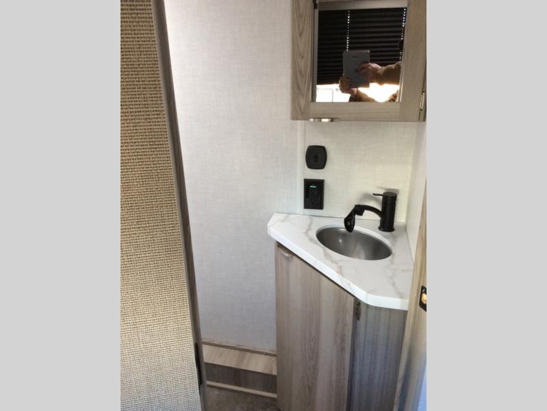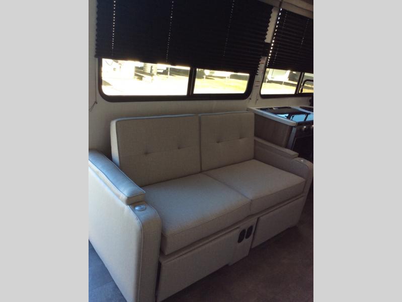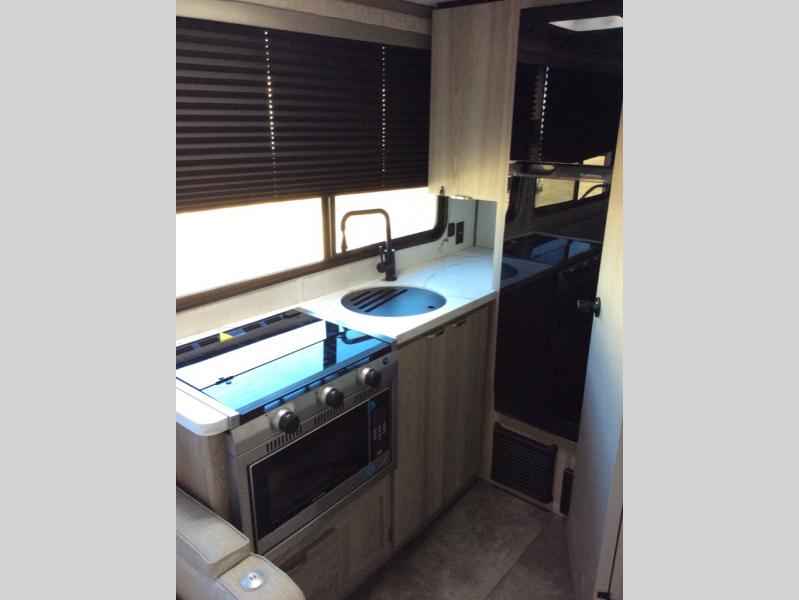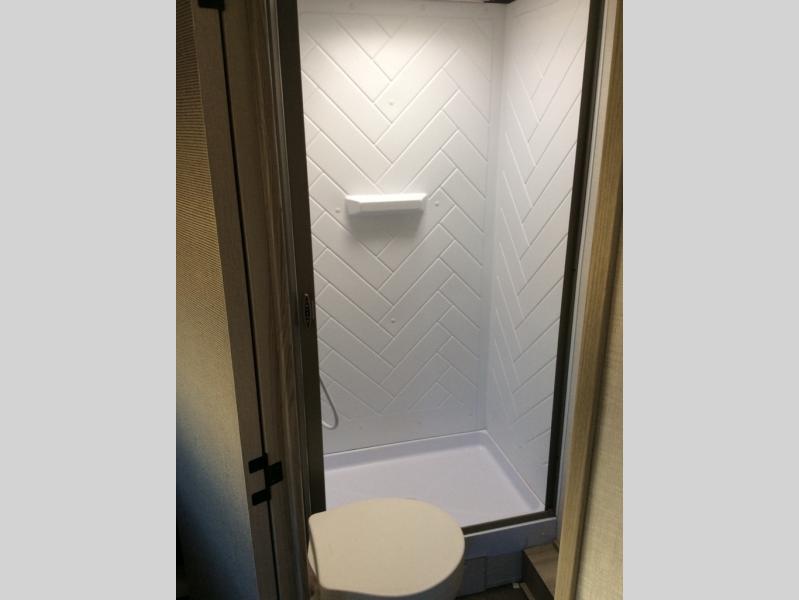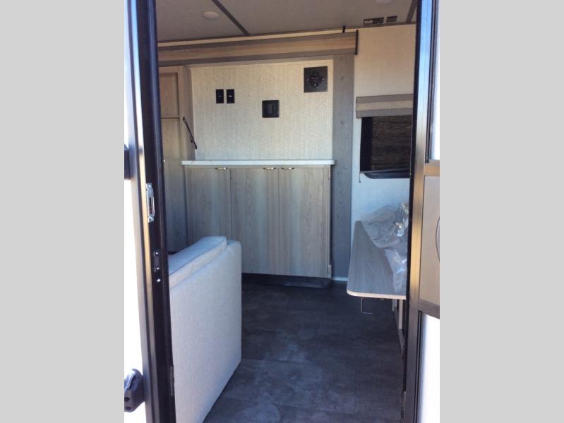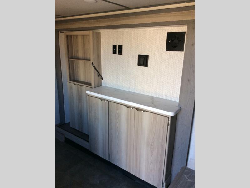 Perfect for your family, this single slide with split bunk and queen bed provides your family comfortable sleeping for four, and the slide adds a bit more interior space in camp. The split bunk is located behind the spice rack door and TV for your entertainment and cooking needs. Speaking of cooking, you can prepare your best home cooked meals with the cooktop, and store any leftovers in the dual swinging 12V refrigerator. Relax each night in the theater seating and freshen up in the rear corner bathroom each morning which features a skylight over the shower for more natural lighting.