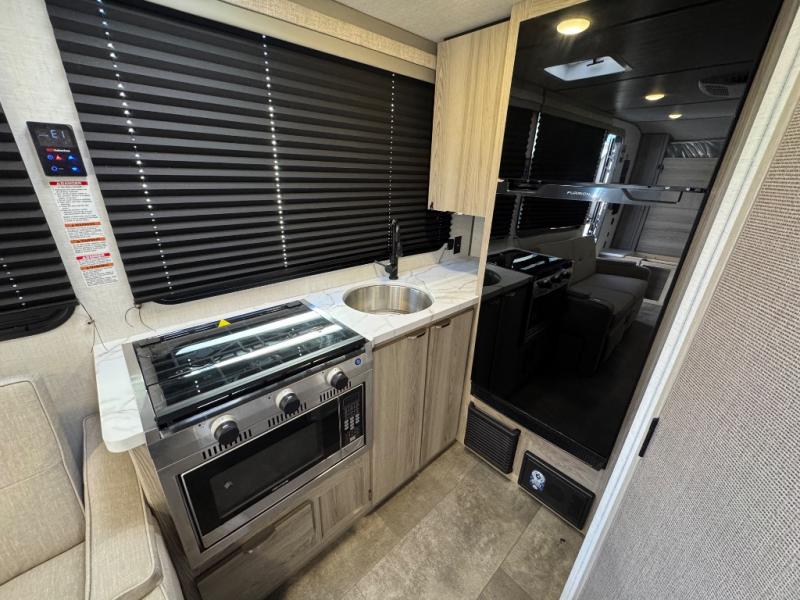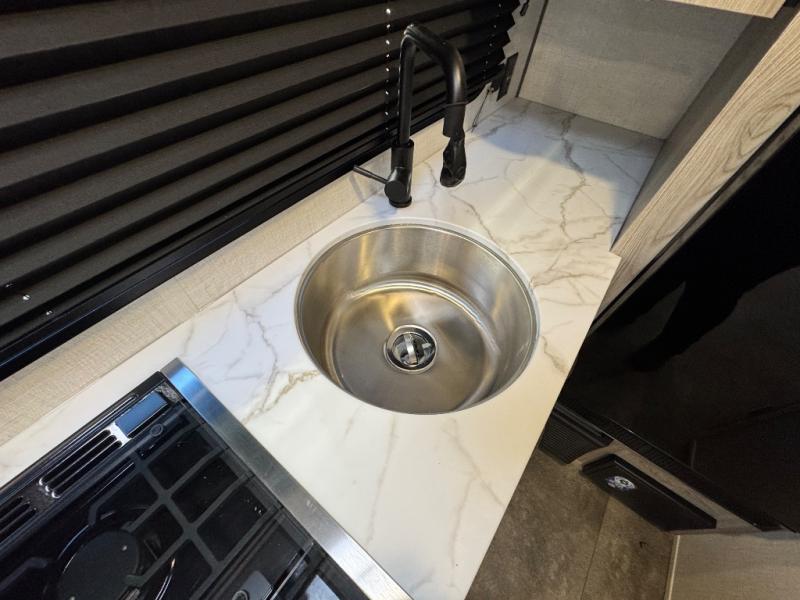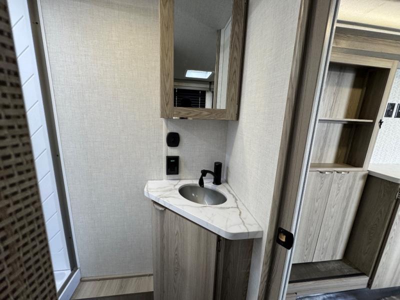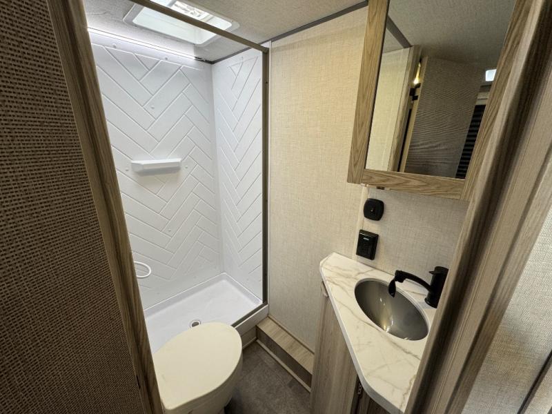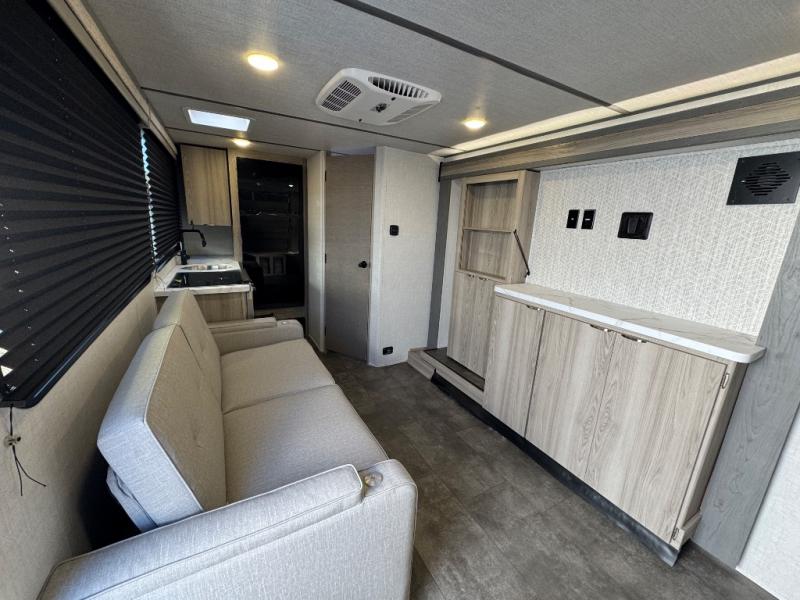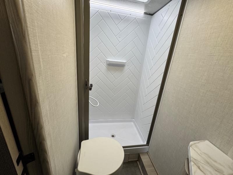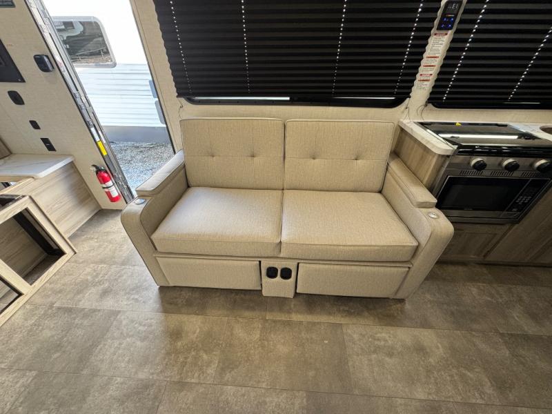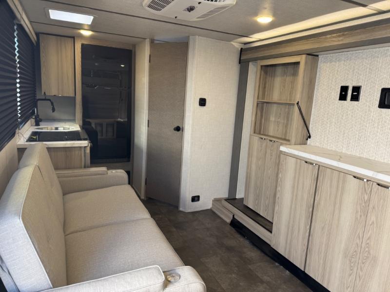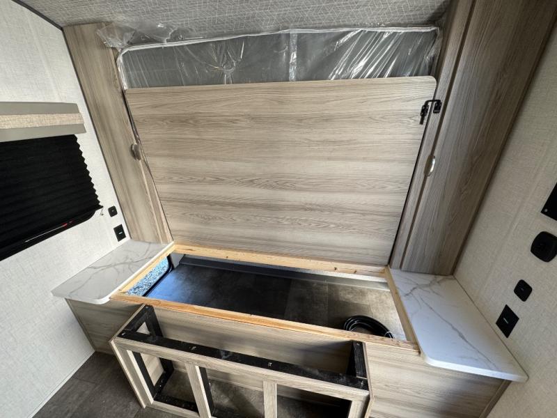 Perfect for your family, this single slide with split bunk and queen bed provides your family comfortable sleeping for four, and the slide adds a bit more interior space in camp. The split bunk is located behind the spice rack door and TV for your entertainment and cooking needs. Speaking of cooking, you can prepare your best home cooked meals with the cooktop, and store any leftovers in the dual swinging 12V refrigerator. Relax each night in the theater seating and freshen up in the rear corner bathroom each morning which features a skylight over the shower for more natural lighting.