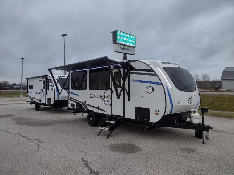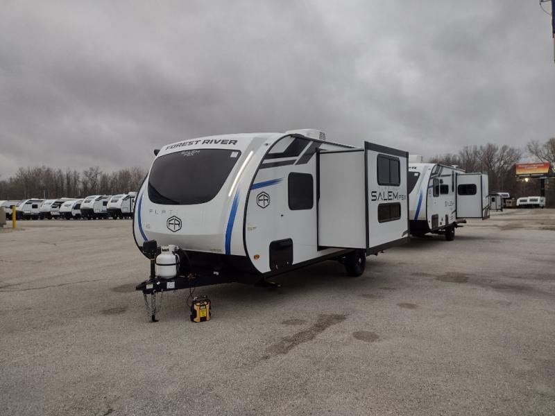 The Forest River Salem FSX travel trailers and toy hauler travel trailers are ultra comfortable and lightweight, perfect for first time or seasoned campers alike! You will love how easy it will be to relax with residential features that will make your space feel just like home, and the durable construction means you can enjoy your RV for years to come. There are a wide variety of floorplans to choose from, including couple's trailers, bunk models, and toy haulers, all with full bath and kitchen amenities and plenty of storage for all your gear!