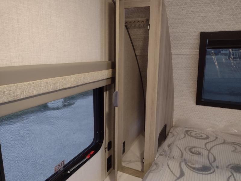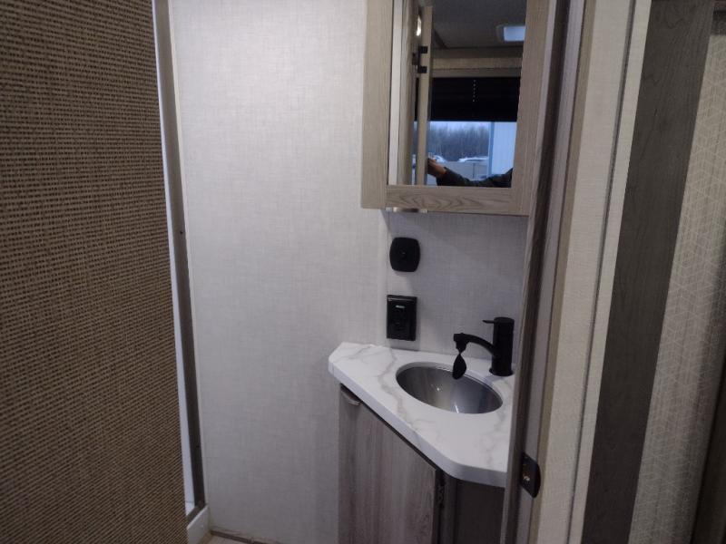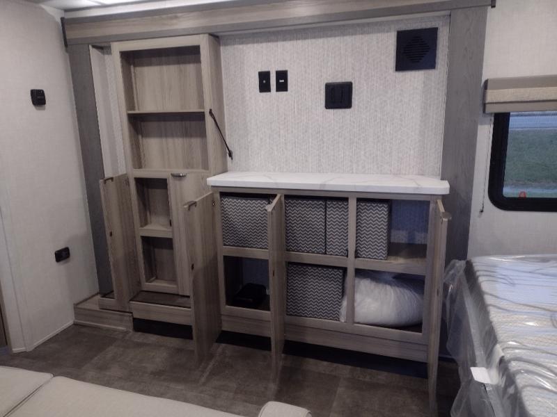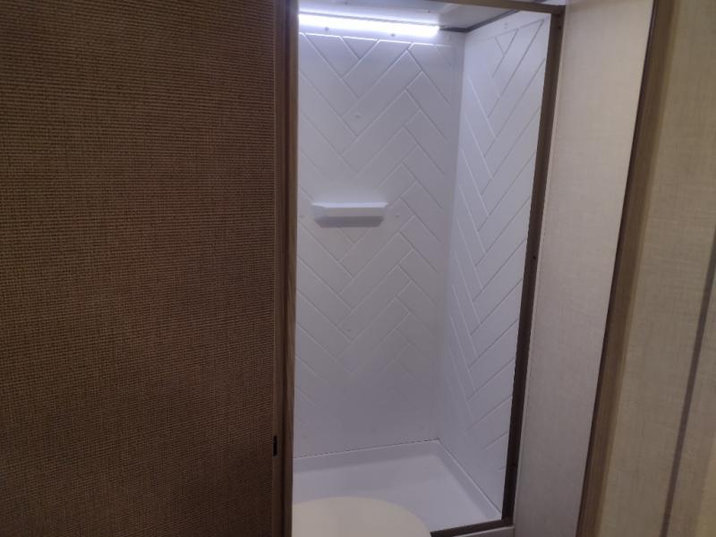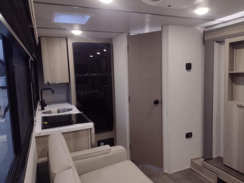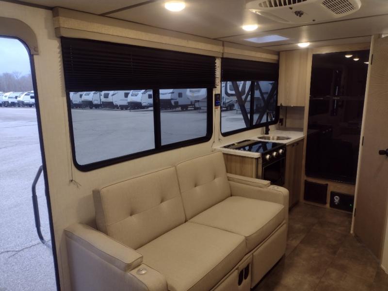 Perfect for your family, this single slide with split bunk and queen bed provides your family comfortable sleeping for four, and the slide adds a bit more interior space in camp. The split bunk is located behind the spice rack door and TV for your entertainment and cooking needs. Speaking of cooking, you can prepare your best home cooked meals with the cooktop, and store any leftovers in the dual swinging 12V refrigerator. Relax each night in the theater seating and freshen up in the rear corner bathroom each morning which features a skylight over the shower for more natural lighting.