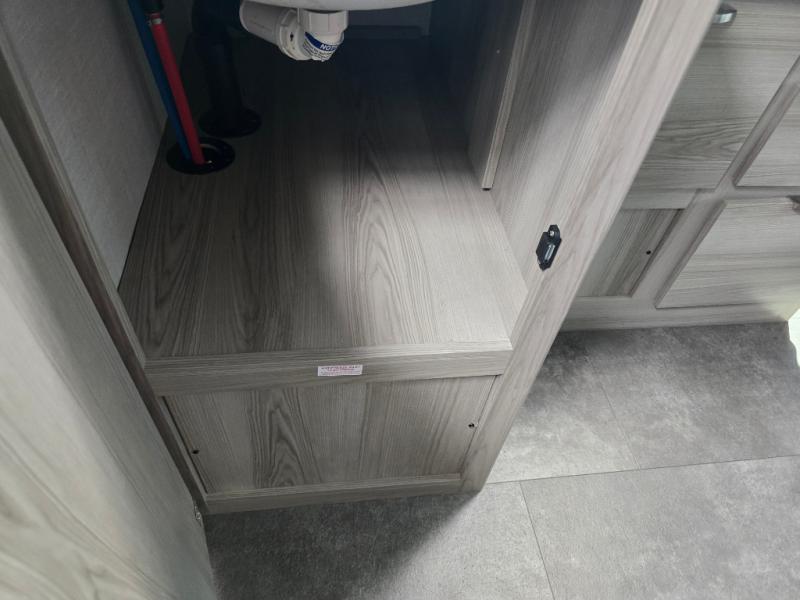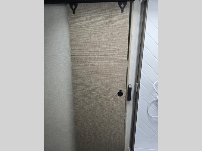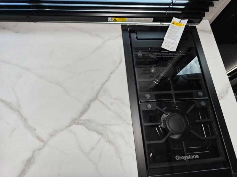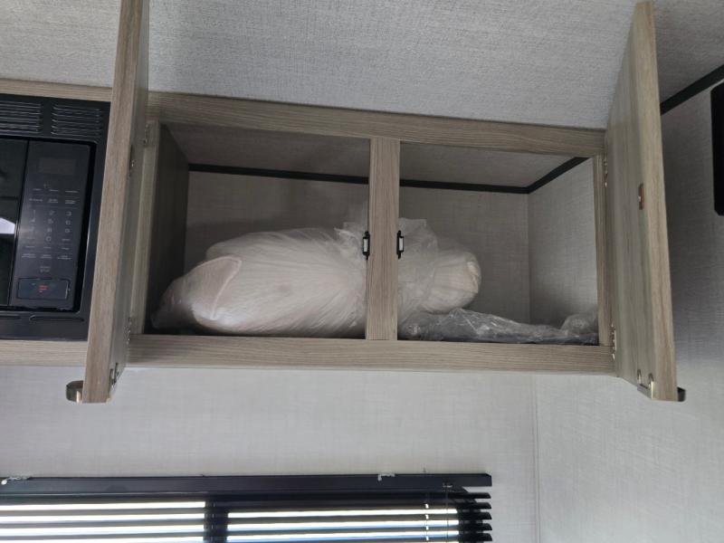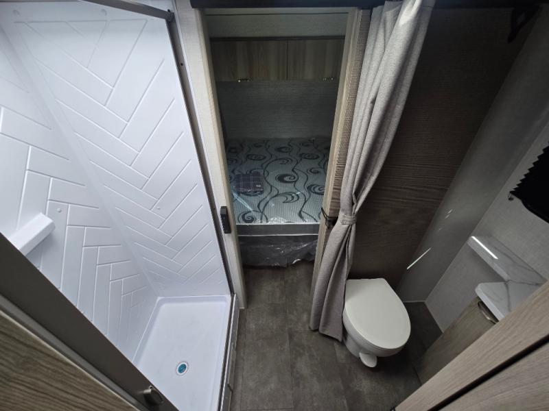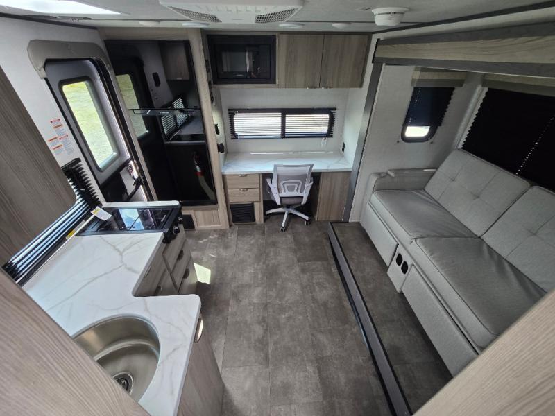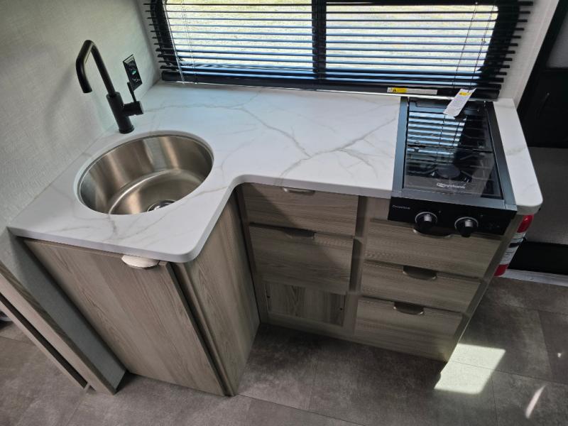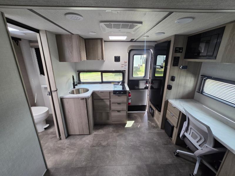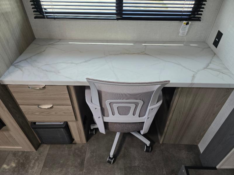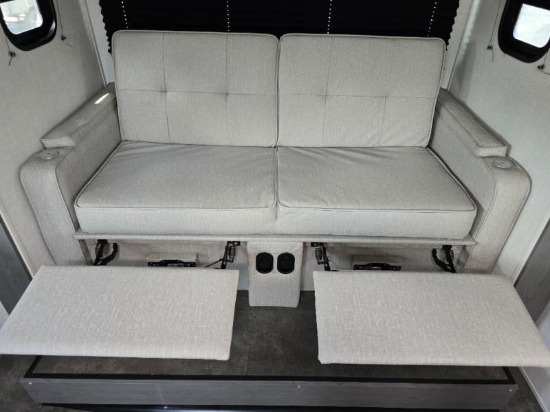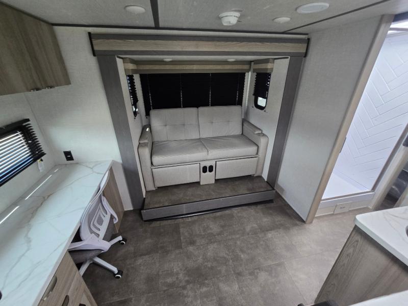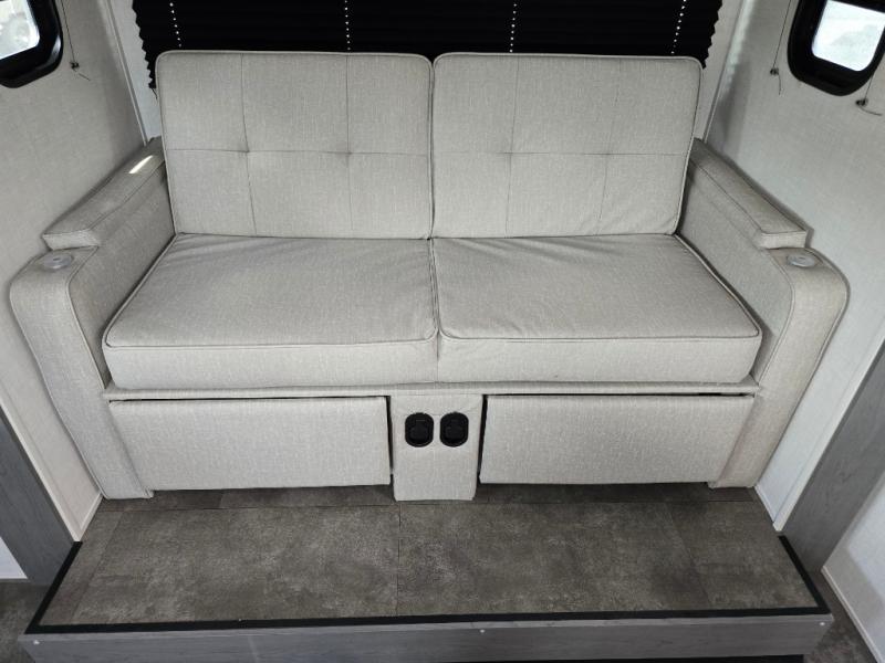 You're going to love every minute spent in this couple's trailer. The queen bed in the front private bedroom will provide a great night's rest, and there are dual wardrobes to easily get dressed in the morning. Head to the kitchen through the bath, then prepare eggs and bacon on the two burner cooktop. There is theater seating here to enjoy your coffee at each morning, or you may want to get some work done at the mobile workstation!