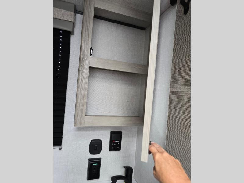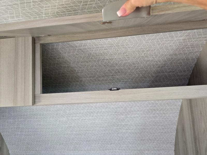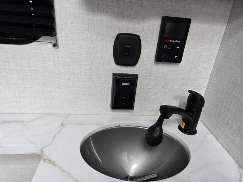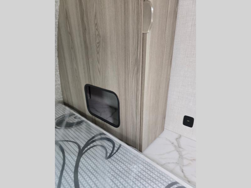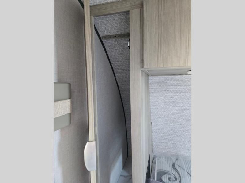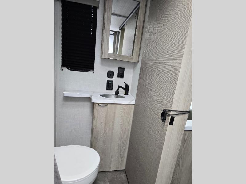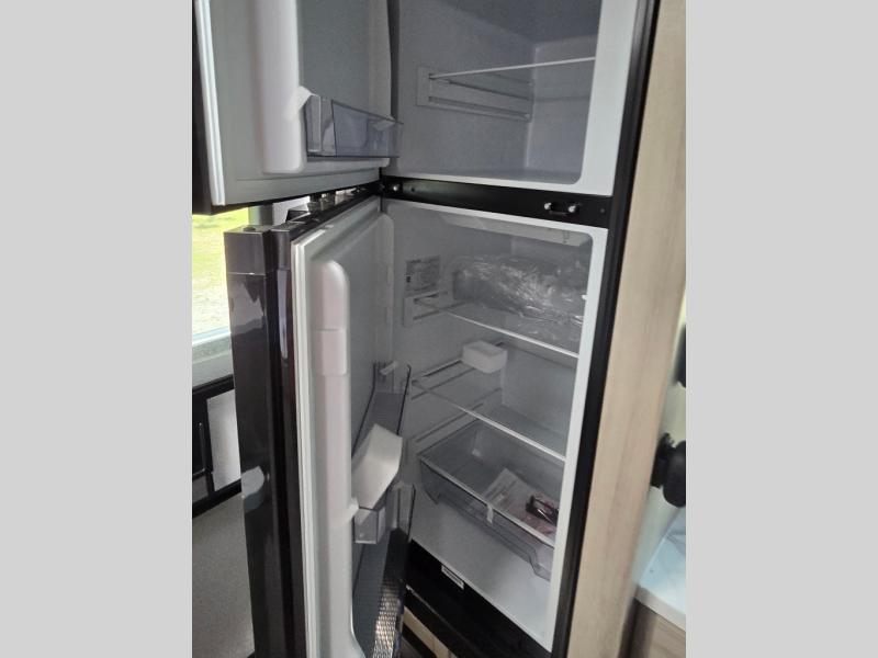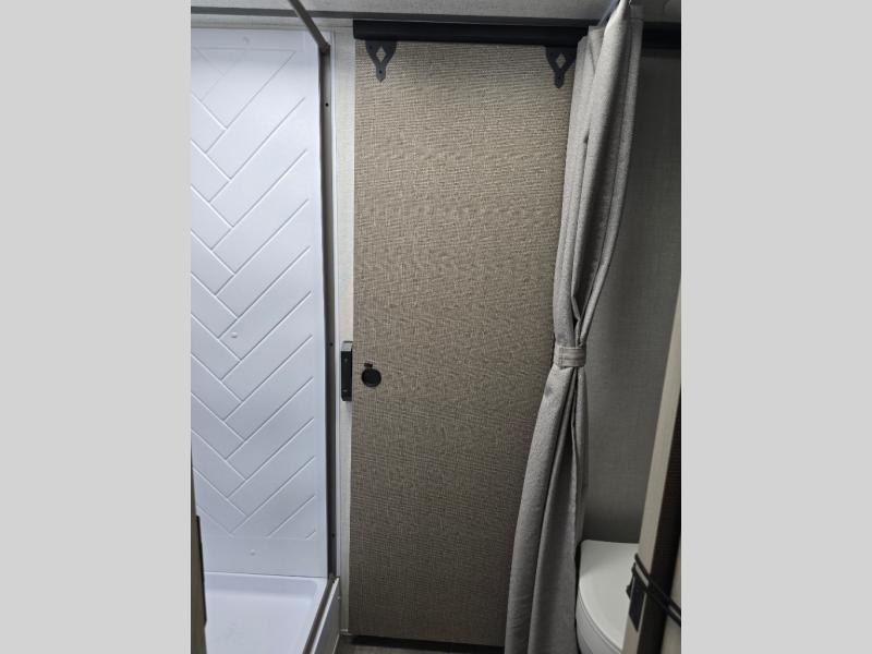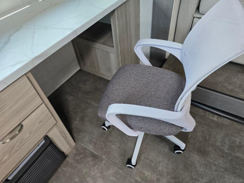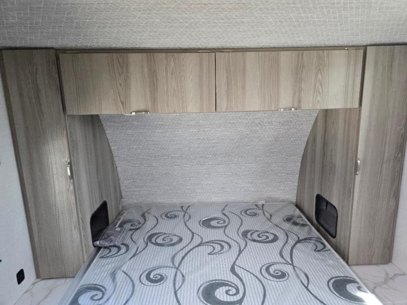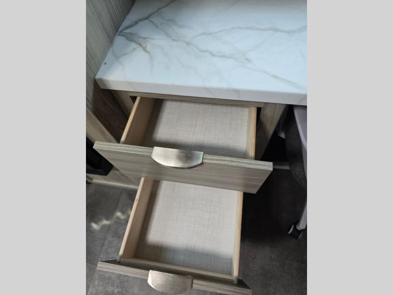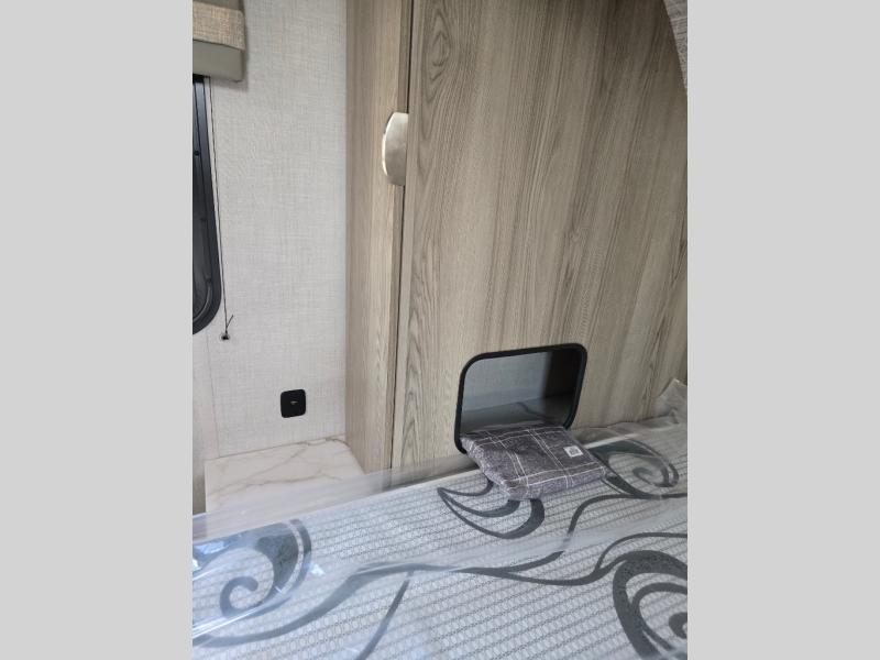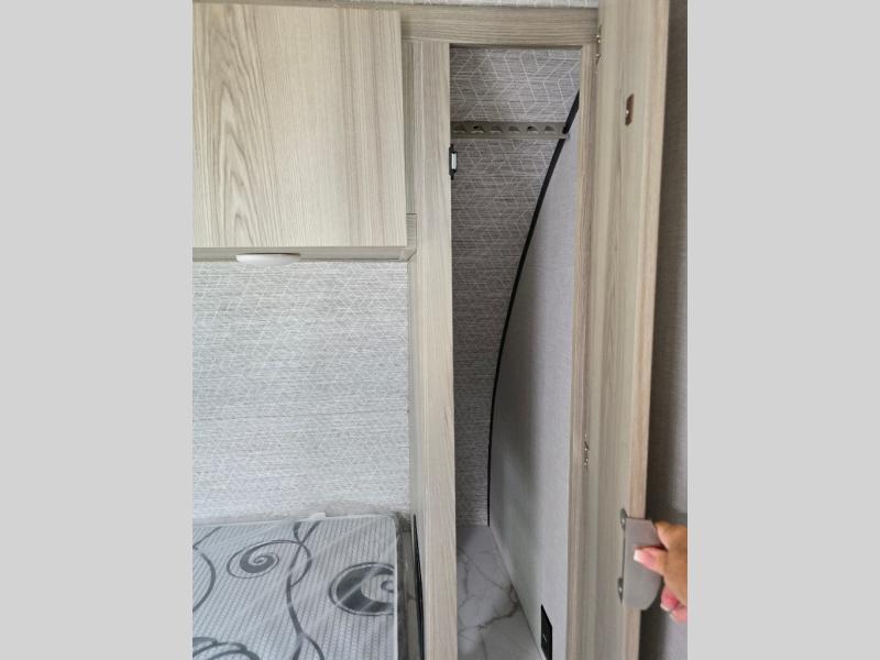 You're going to love every minute spent in this couple's trailer. The queen bed in the front private bedroom will provide a great night's rest, and there are dual wardrobes to easily get dressed in the morning. Head to the kitchen through the bath, then prepare eggs and bacon on the two burner cooktop. There is theater seating here to enjoy your coffee at each morning, or you may want to get some work done at the mobile workstation!