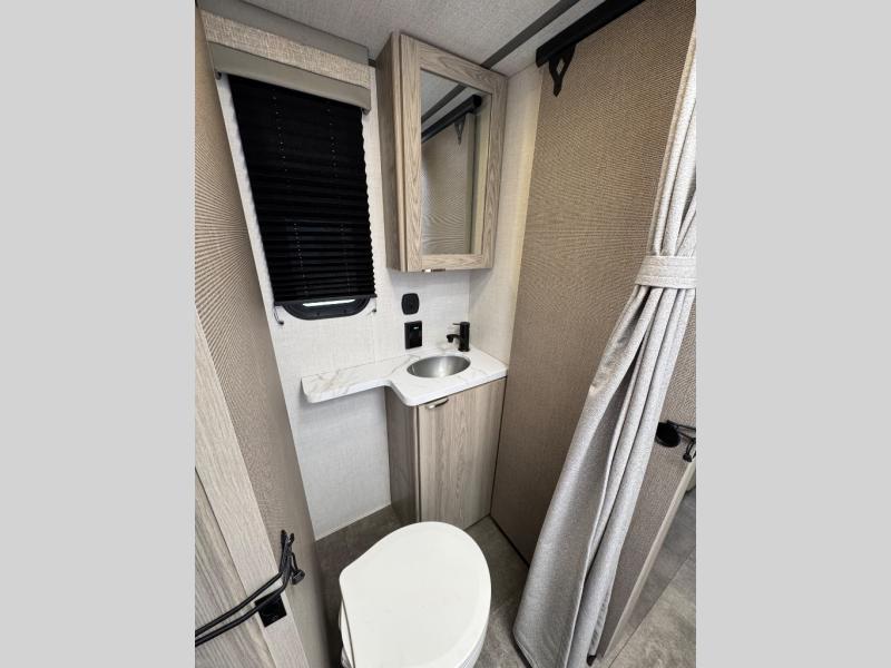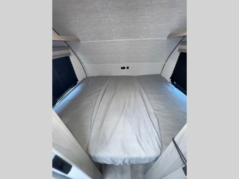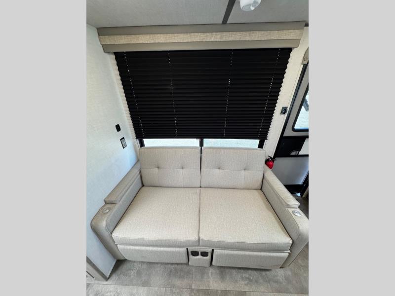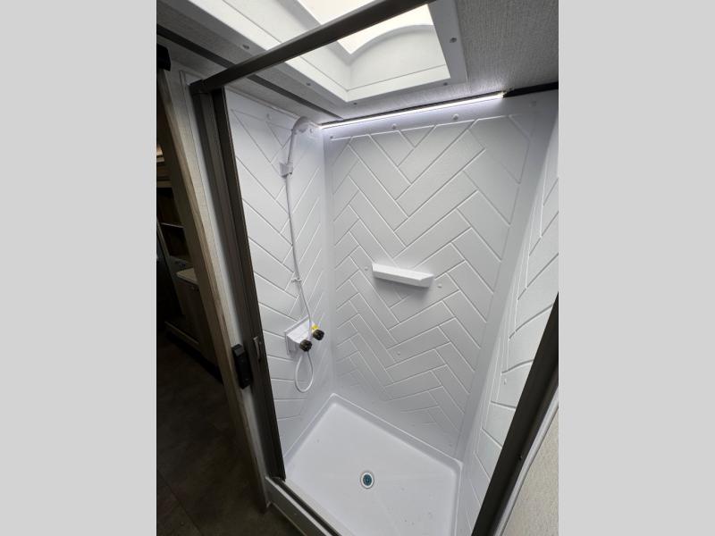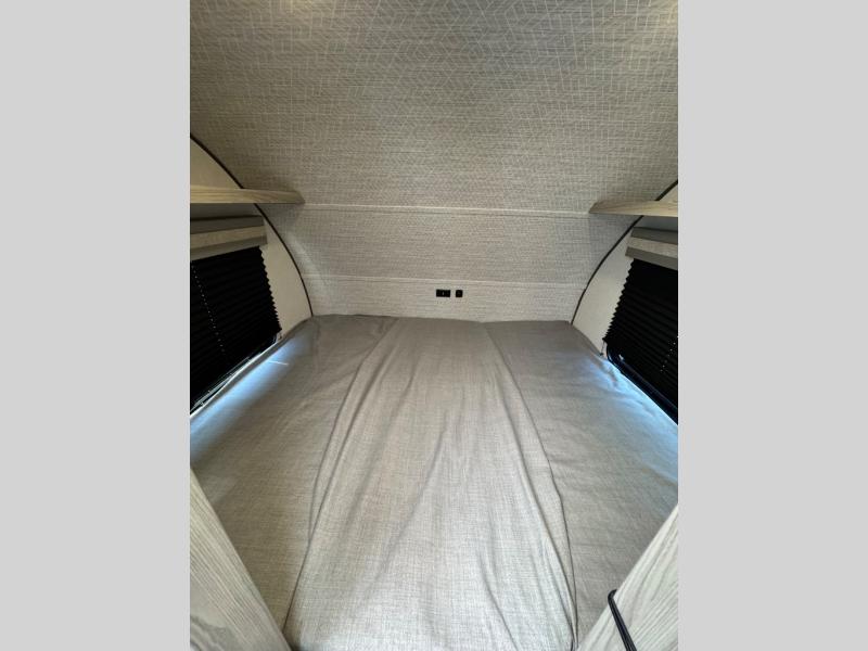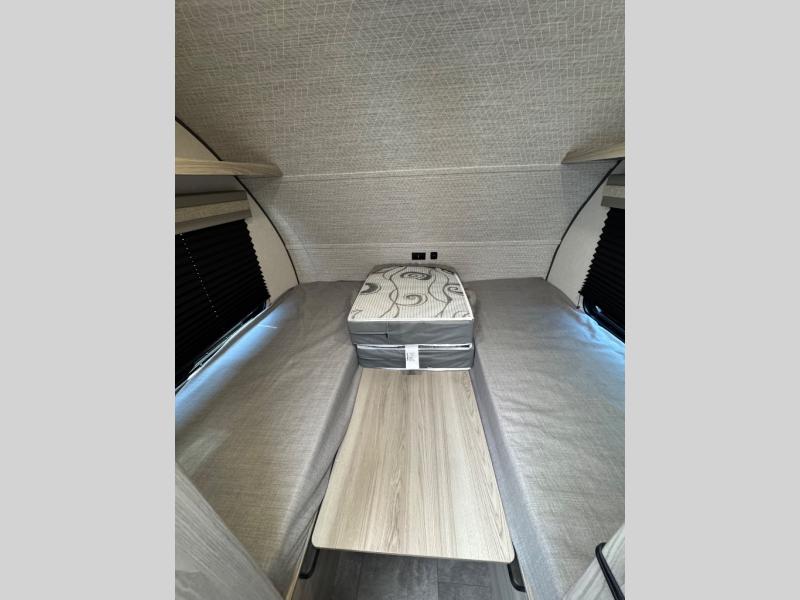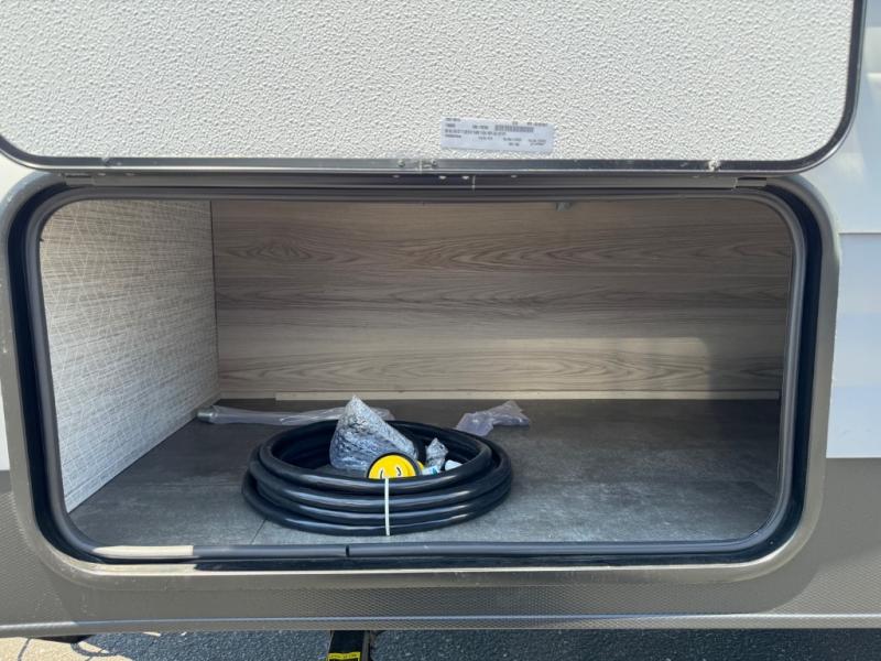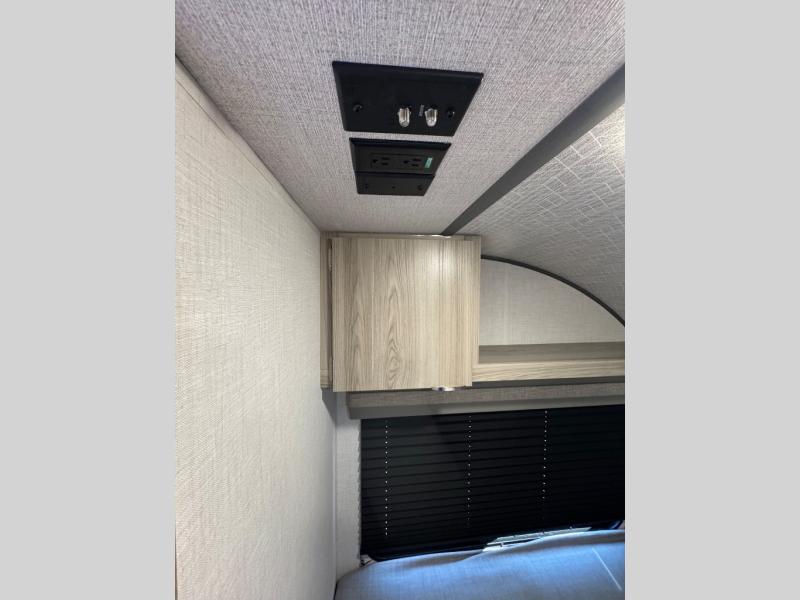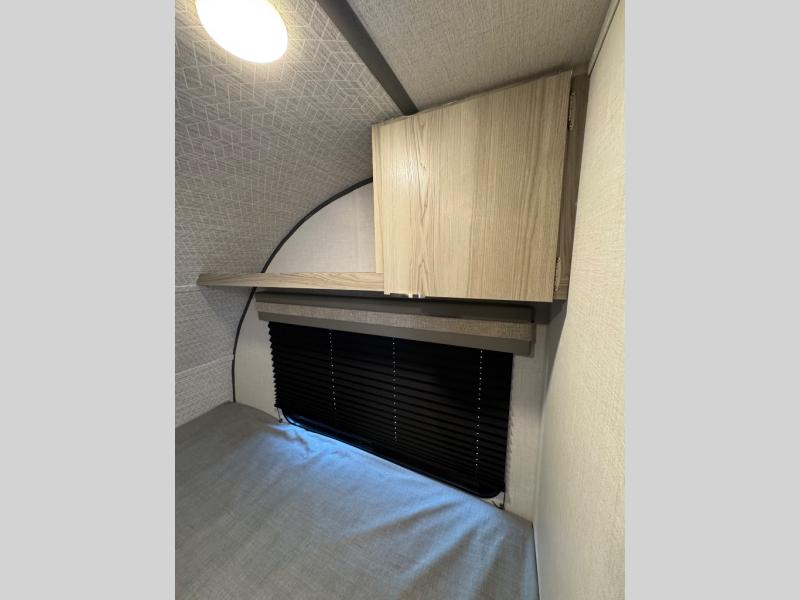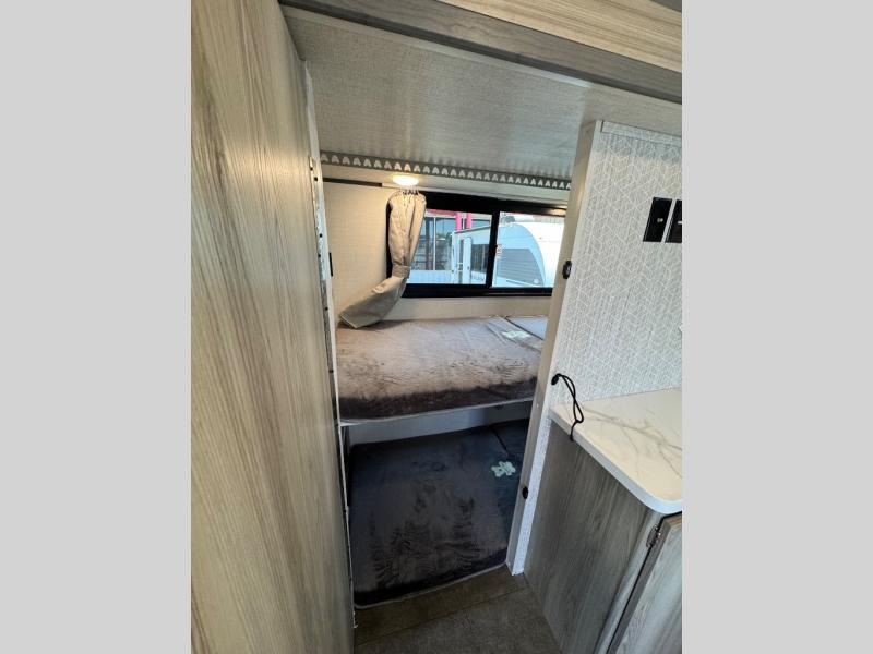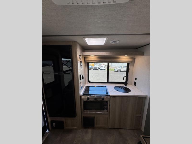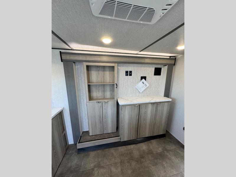This compact travel trailer features a front bedroom with twin beds, or you can convert them to a king-size bed, depending on your needs. The slide out in the main living area features a split bunk bed hidden behind a spice door. There is also theater seating here for a place to relax, and everyone will have easy access to the walk-thru bath. And don't overlook the rear kitchen with all the appliances needed to create your best meals!
