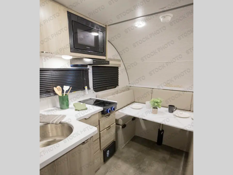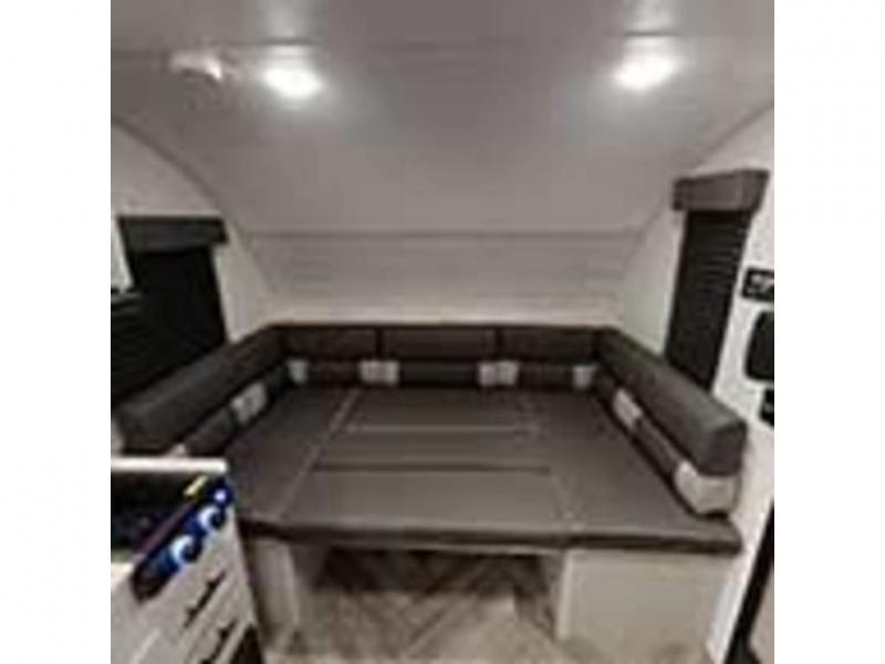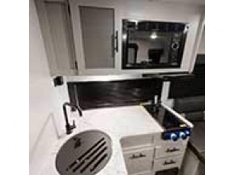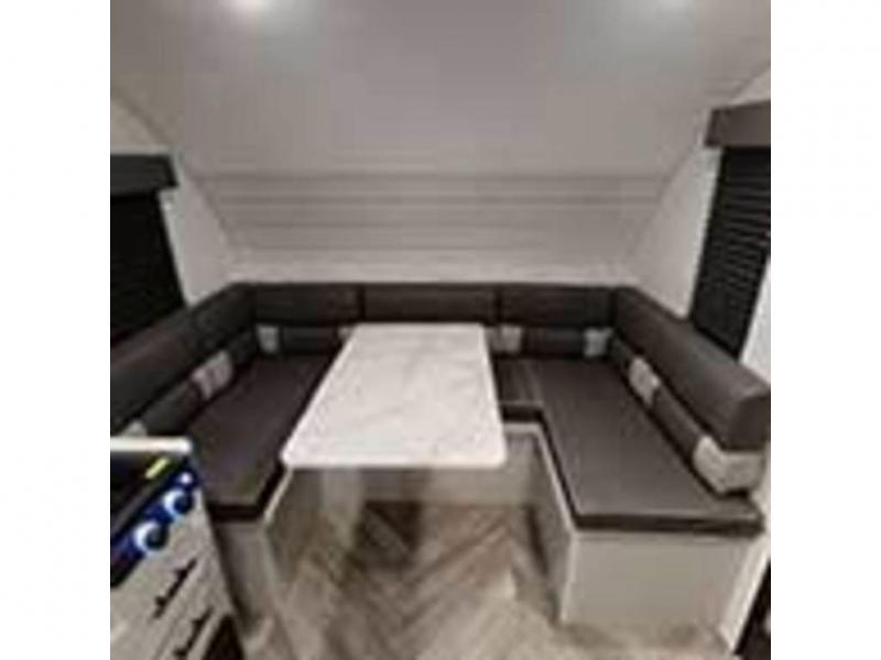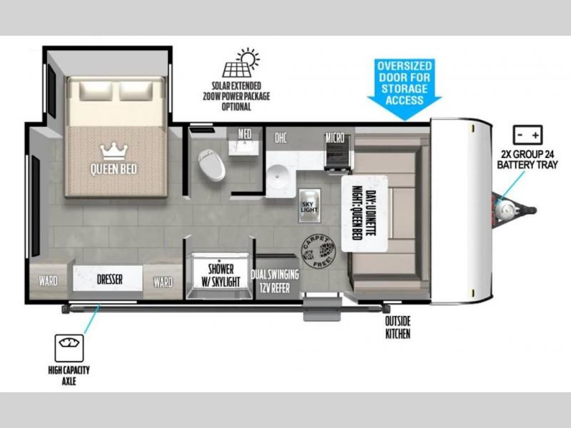 This travel trailer is perfect for couples who want to explore the great outdoors together! There is a rear private bedroom with a queen bed slide for more interior space, a dresser and wardrobes on either side of it for your clothes. Plus, it enters right into the split style bathroom which will come in handy when one person wants to freshen up in the shower while another uses the private toilet and sink. You can prepare your best home cooked meals with the two burner cooktop then enjoy it at the front U-shaped dinette which can also transform into an extra sleeping space. Enjoy making pancakes on the outdoor kitchen under the 15' power awning!