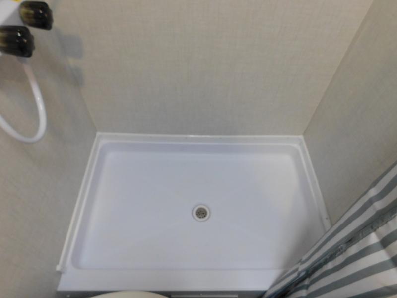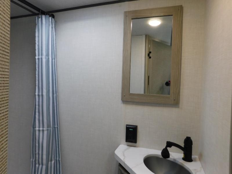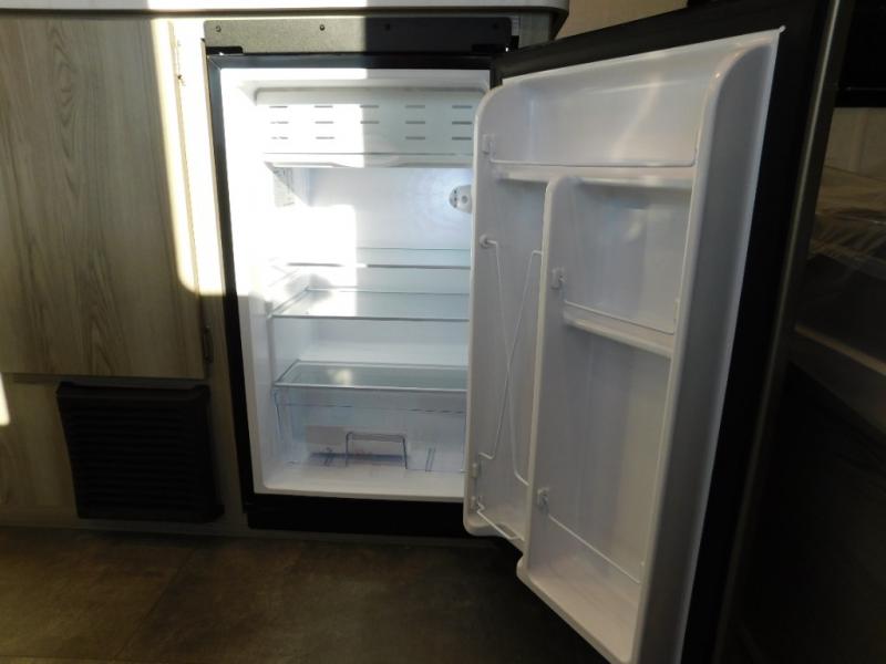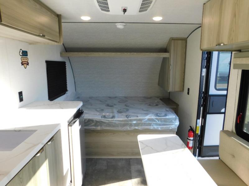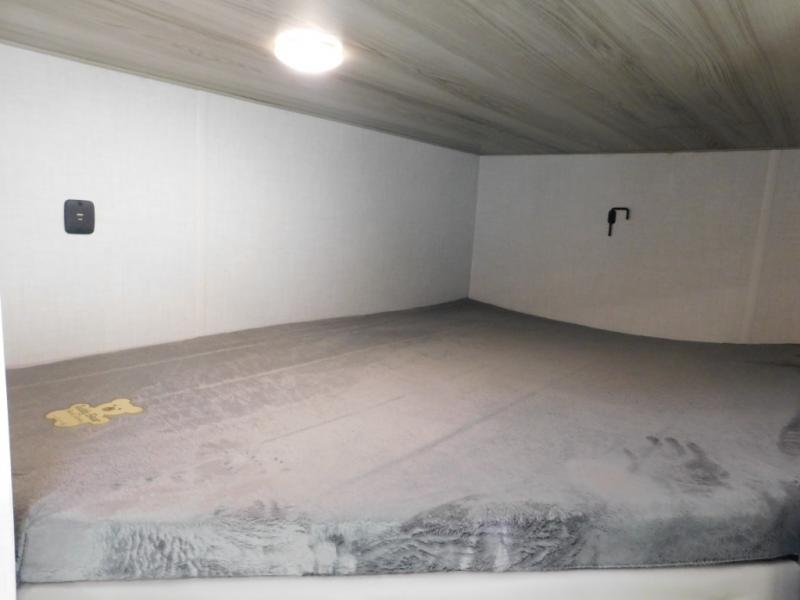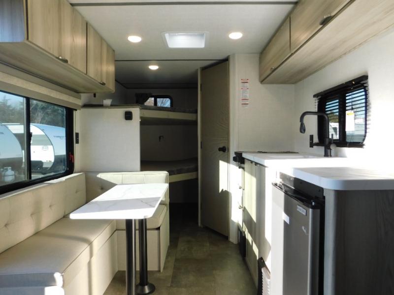 The double-size bunks with storage will be a big selling point in this travel trailer! While your guests take the bunks, you can have the front queen bed all to yourselves, and there is a wardrobe to keep your things organized. A two burner cooktop and microwave will let you make meals each day, and you can dine at the open lounge with a table.