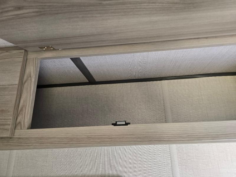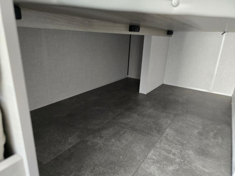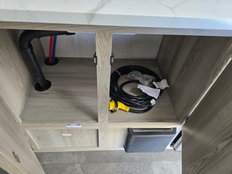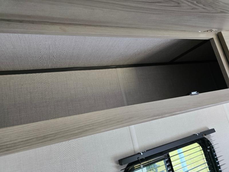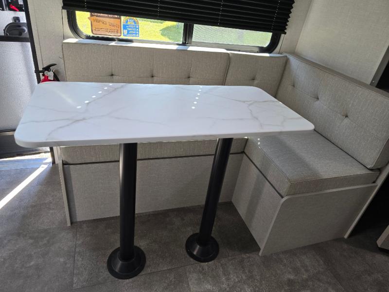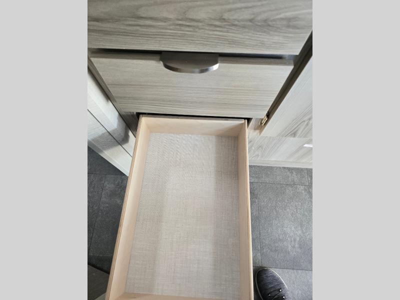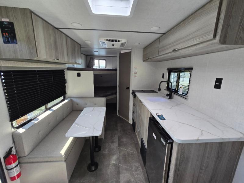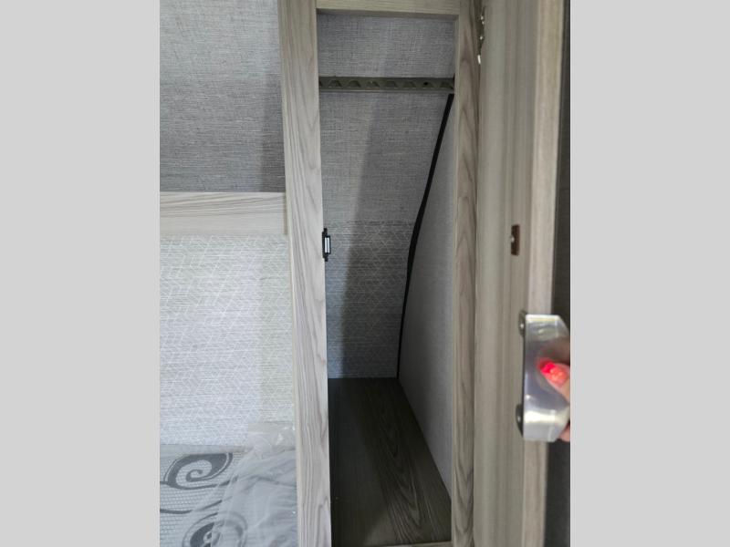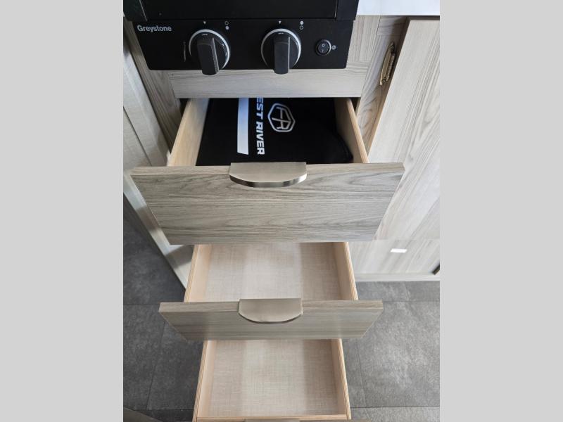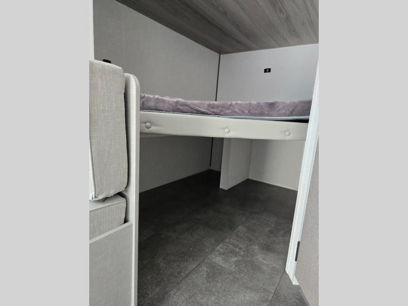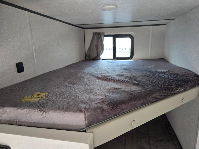 The double-size bunks with storage will be a big selling point in this travel trailer! While your guests take the bunks, you can have the front queen bed all to yourselves, and there is a wardrobe to keep your things organized. A two burner cooktop and microwave will let you make meals each day, and you can dine at the open lounge with a table.