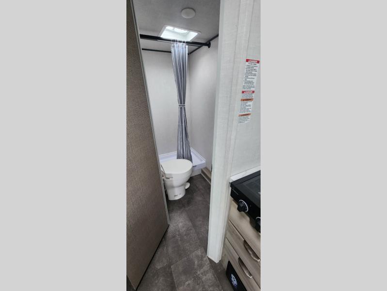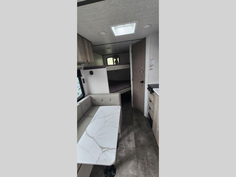 The double-size bunks with storage will be a big selling point in this travel trailer! While your guests take the bunks, you can have the front queen bed all to yourselves, and there is a wardrobe to keep your things organized. A two burner cooktop and microwave will let you make meals each day, and you can dine at the open lounge with a table.