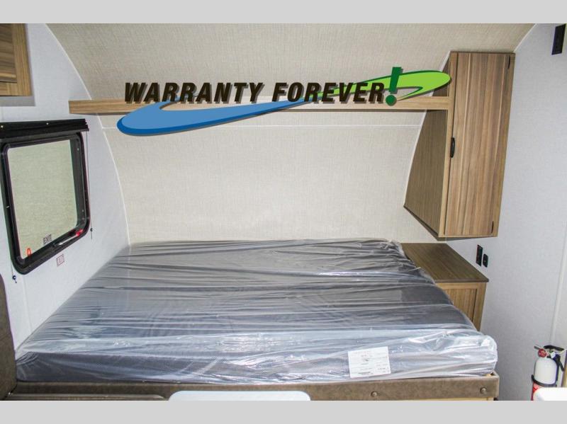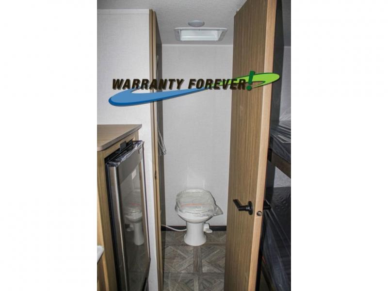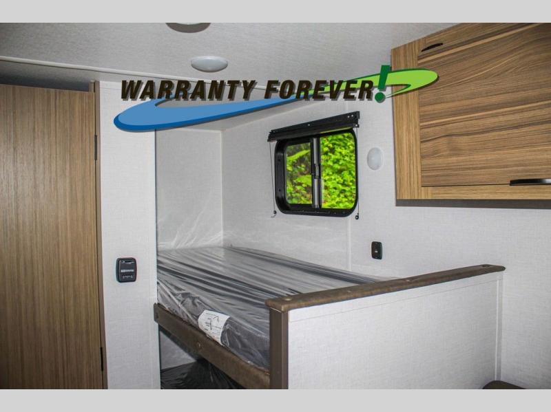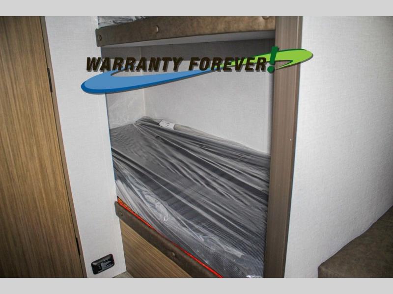 Pack your bags and head for the lake with this travel trailer in tow! Since you won't be sleeping in a tent on an air mattress, you'll love having the front queen bed for a great night's rest, and the wardrobe at the foot of the bed will keep your clothes organized. There are bunk beds in the back plus a private bath with a toilet and shower so you can freshen up each day. This model also includes a sofa that will double as seating and extra sleeping space; how convenient!