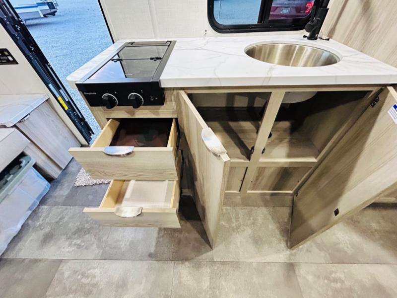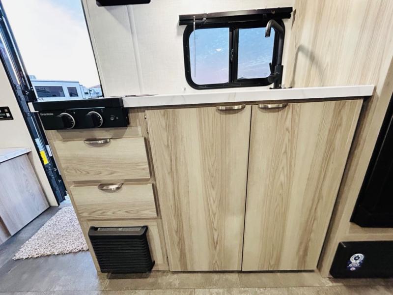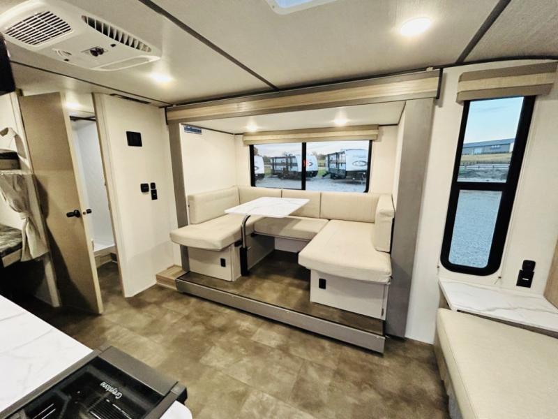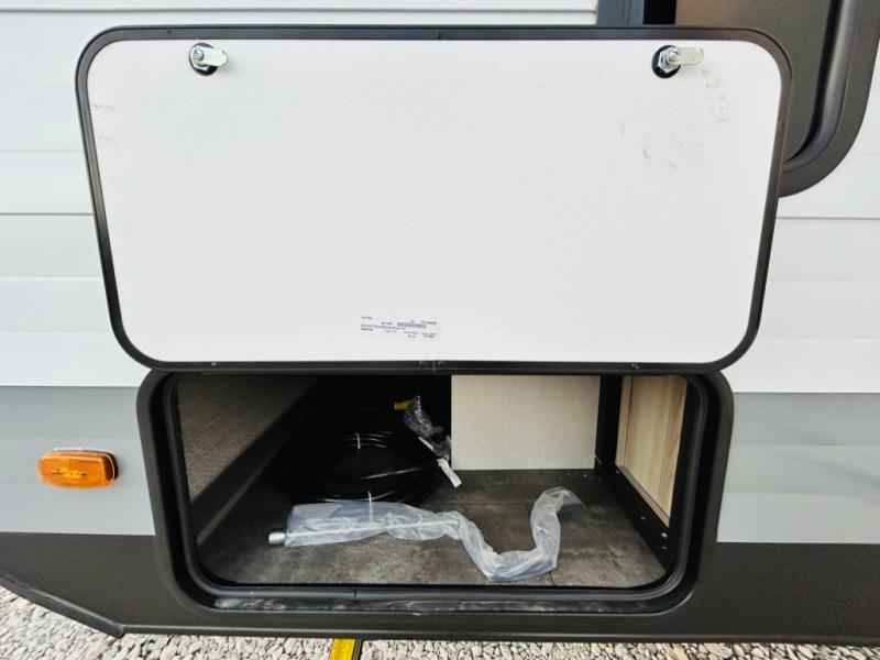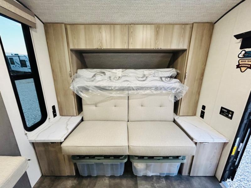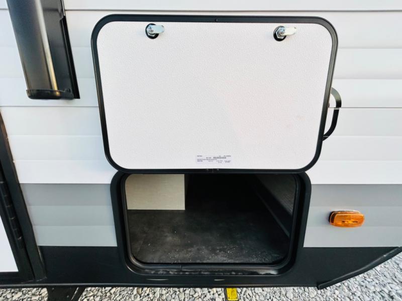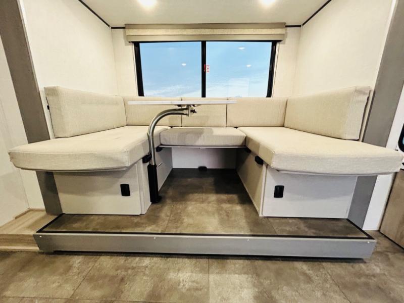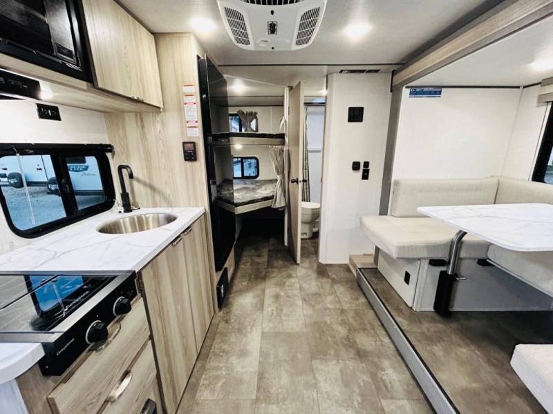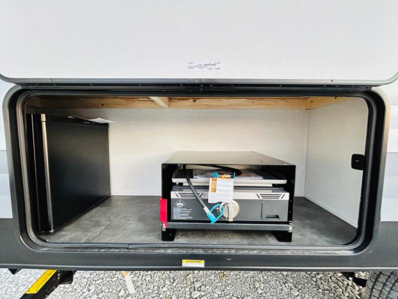 Start camping the right way in this travel trailer! It features a front Murphy bed that will double as your seating and sleeping space each day. The corner set of double-size bunk beds come with storage to keep things out of the way and are conveniently next to the rear corner bathroom with a shower with a skylight to freshen up in each morning. You can prepare your best home cooked meals indoors with the two burner cooktop or head to the outside kitchen to fry up some burgers while breathing in some fresh air. Enjoy your meals, play card games, and even sleep at the U-shaped dinette slide. You will also appreciate the outside shower and the exterior full pass-through storage for camp gear!