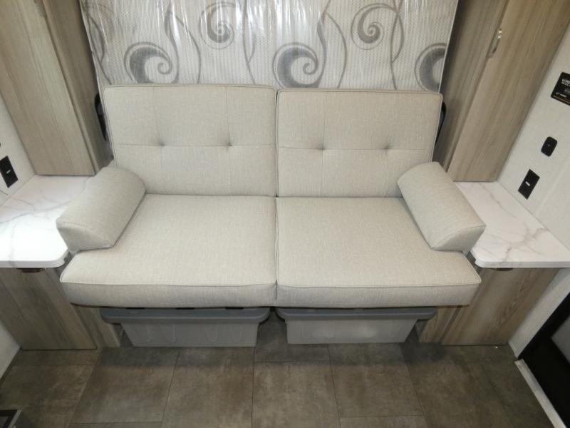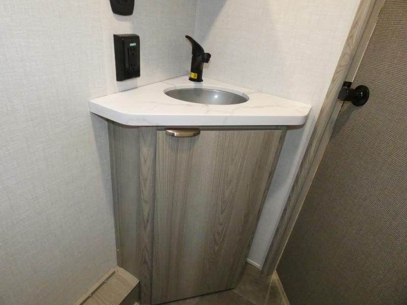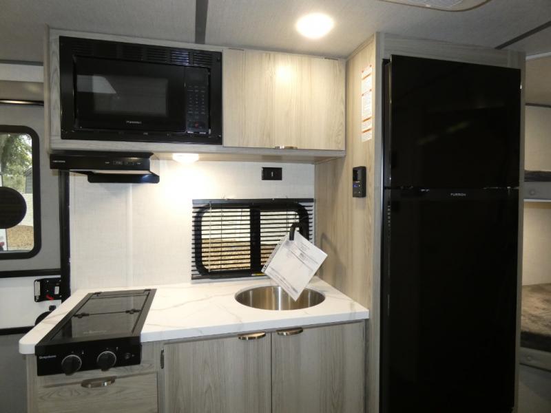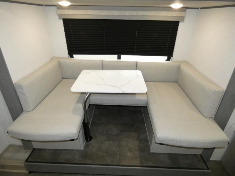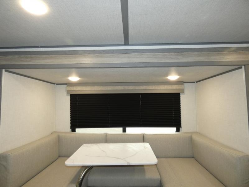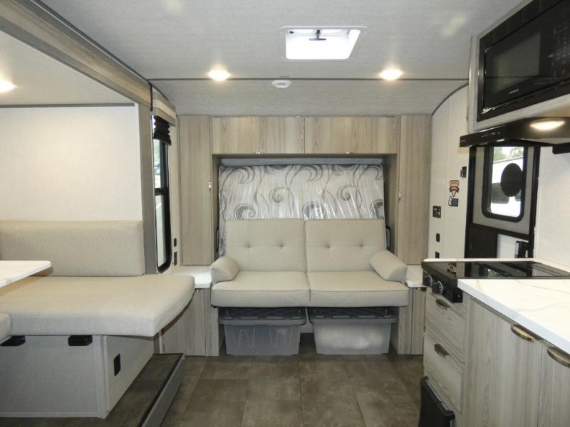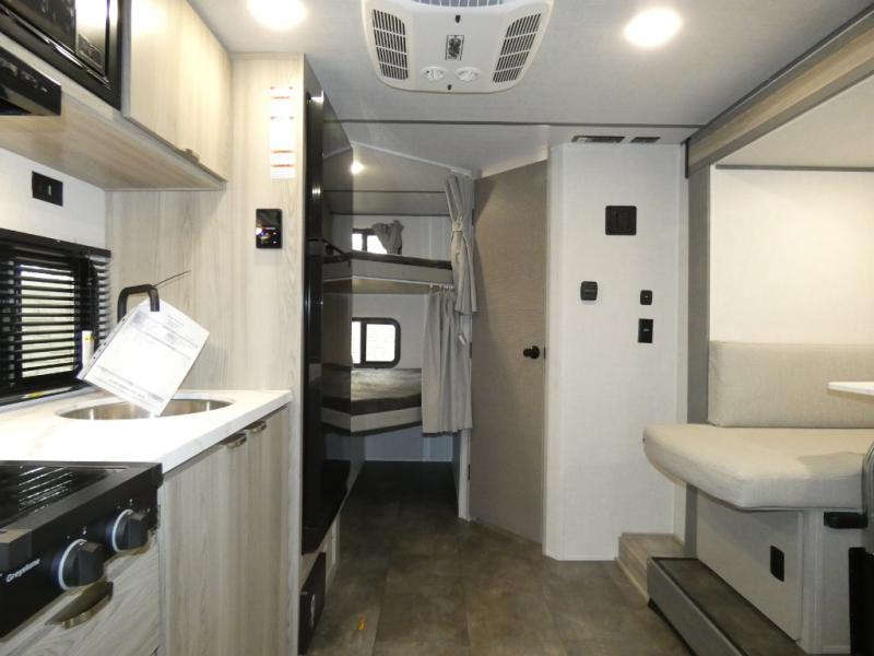 Start camping the right way in this travel trailer! It features a front Murphy bed that will double as your seating and sleeping space each day. The corner set of double-size bunk beds come with storage to keep things out of the way and are conveniently next to the rear corner bathroom with a shower with a skylight to freshen up in each morning. You can prepare your best home cooked meals indoors with the two burner cooktop or head to the outside kitchen to fry up some burgers while breathing in some fresh air. Enjoy your meals, play card games, and even sleep at the U-shaped dinette slide. You will also appreciate the outside shower and the exterior full pass-through storage for camp gear!