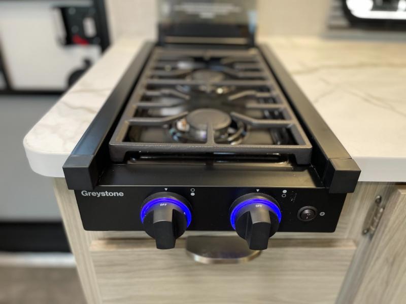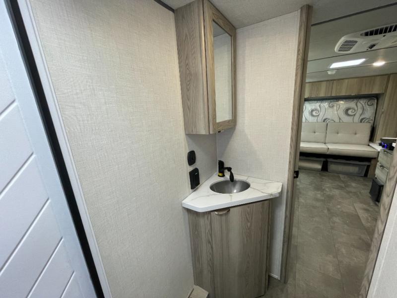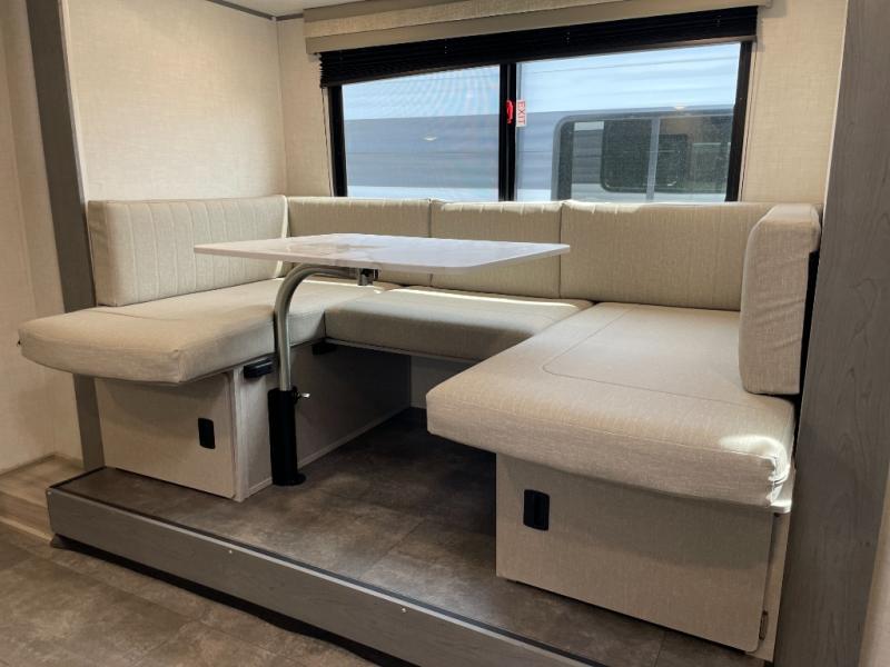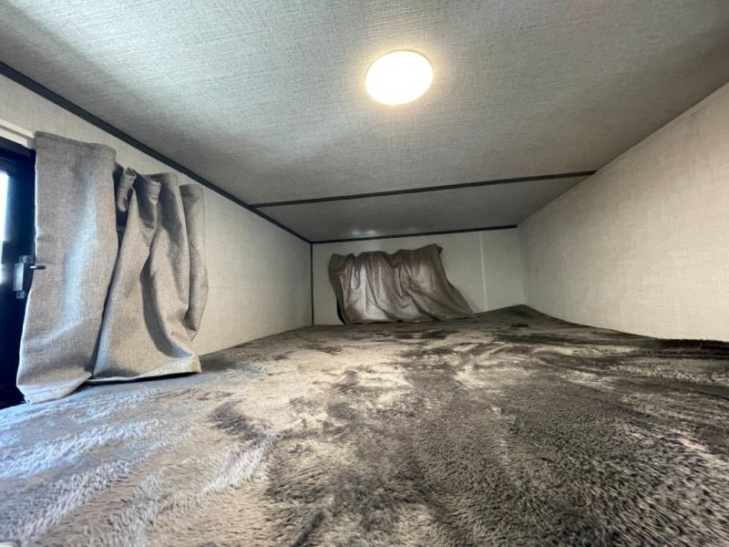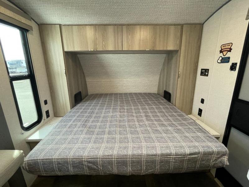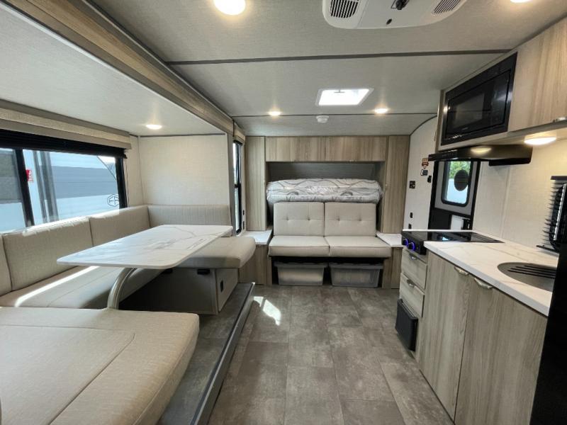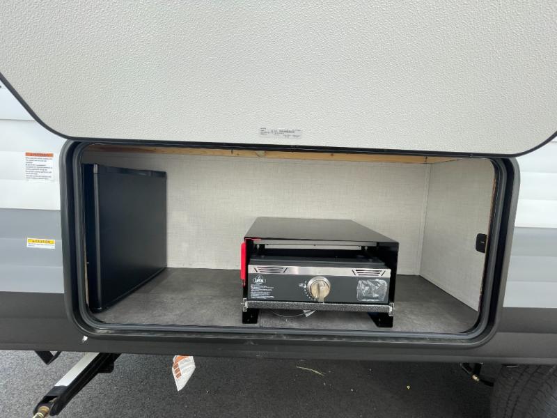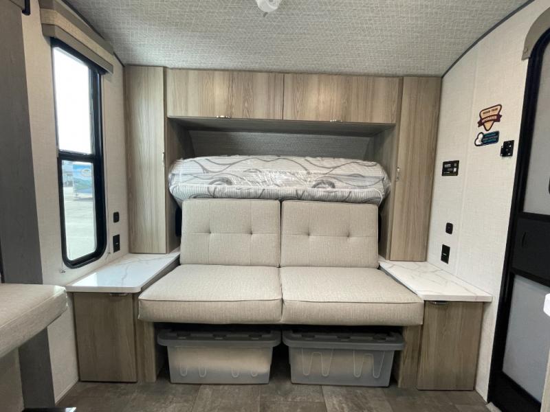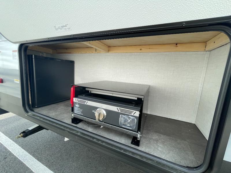 Start camping the right way in this travel trailer! It features a front Murphy bed that will double as your seating and sleeping space each day. The corner set of double-size bunk beds come with storage to keep things out of the way and are conveniently next to the rear corner bathroom with a shower with a skylight to freshen up in each morning. You can prepare your best home cooked meals indoors with the two burner cooktop or head to the outside kitchen to fry up some burgers while breathing in some fresh air. Enjoy your meals, play card games, and even sleep at the U-shaped dinette slide. You will also appreciate the outside shower and the exterior full pass-through storage for camp gear!