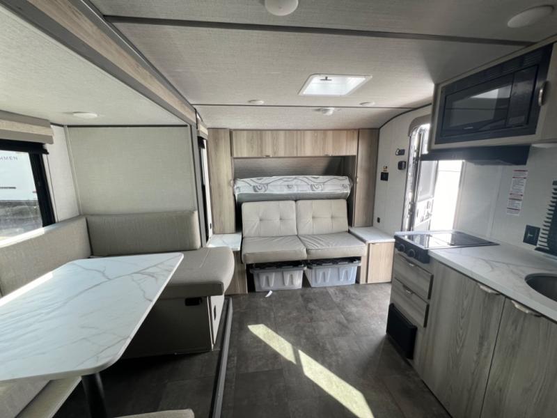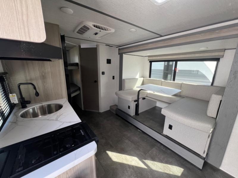 Start camping the right way in this travel trailer! It features a front Murphy bed that will double as your seating and sleeping space each day. The corner set of double-size bunk beds come with storage to keep things out of the way and are conveniently next to the rear corner bathroom with a shower with a skylight to freshen up in each morning. You can prepare your best home cooked meals indoors with the two burner cooktop or head to the outside kitchen to fry up some burgers while breathing in some fresh air. Enjoy your meals, play card games, and even sleep at the U-shaped dinette slide. You will also appreciate the outside shower and the exterior full pass-through storage for camp gear!