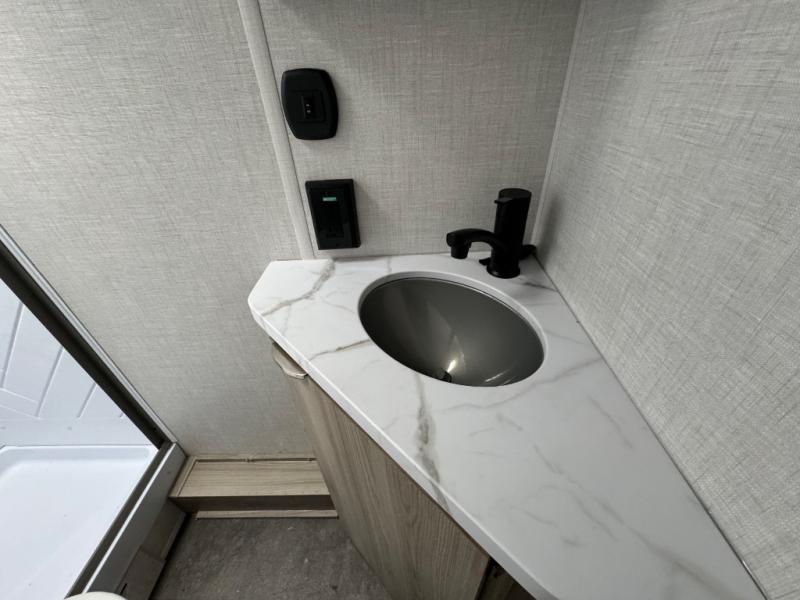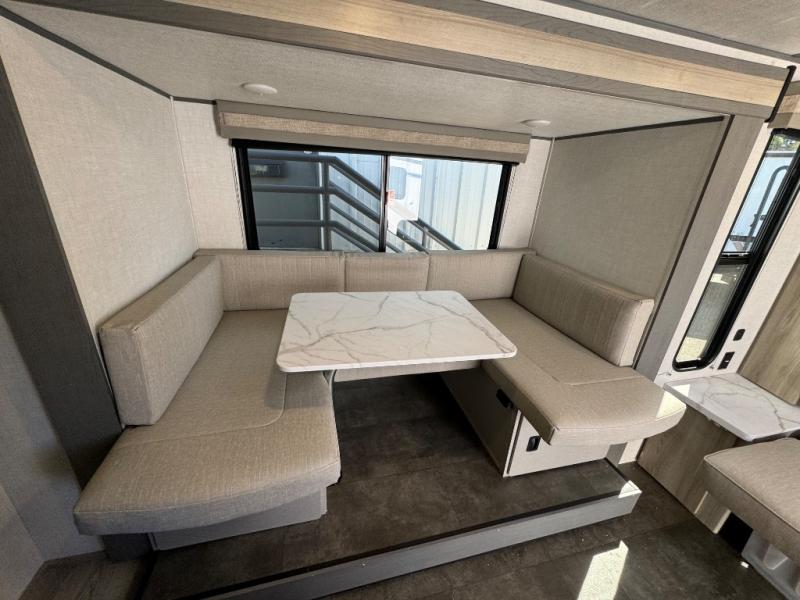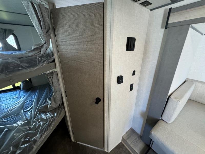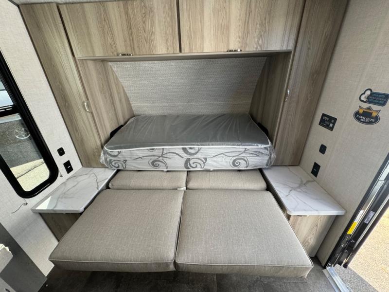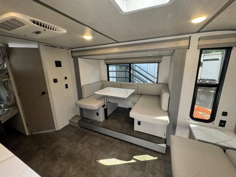 Start camping the right way in this travel trailer! It features a front Murphy bed that will double as your seating and sleeping space each day. The corner set of double-size bunk beds come with storage to keep things out of the way and are conveniently next to the rear corner bathroom with a shower with a skylight to freshen up in each morning. You can prepare your best home cooked meals indoors with the two burner cooktop or head to the outside kitchen to fry up some burgers while breathing in some fresh air. Enjoy your meals, play card games, and even sleep at the U-shaped dinette slide. You will also appreciate the outside shower and the exterior full pass-through storage for camp gear!