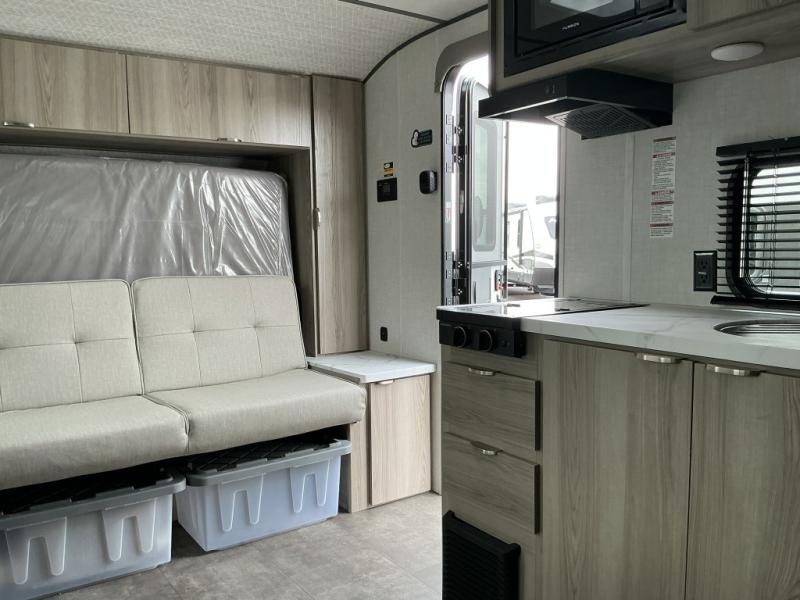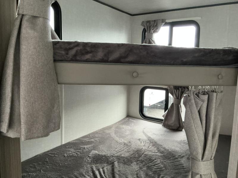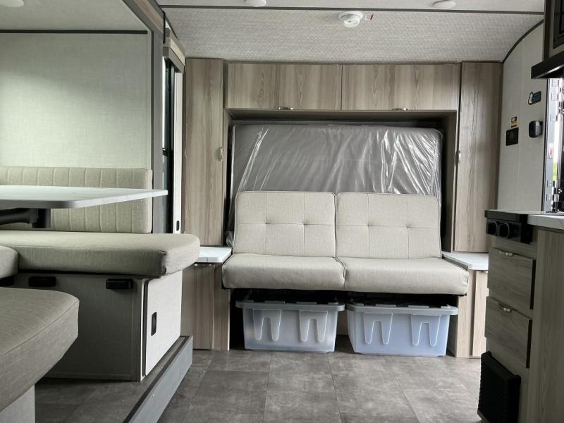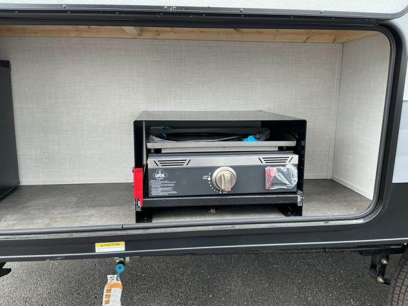 Start camping the right way in this travel trailer! It features a front Murphy bed that will double as your seating and sleeping space each day. The corner set of double-size bunk beds come with storage to keep things out of the way and are conveniently next to the rear corner bathroom with a shower with a skylight to freshen up in each morning. You can prepare your best home cooked meals indoors with the two burner cooktop or head to the outside kitchen to fry up some burgers while breathing in some fresh air. Enjoy your meals, play card games, and even sleep at the U-shaped dinette slide. You will also appreciate the outside shower and the exterior full pass-through storage for camp gear!