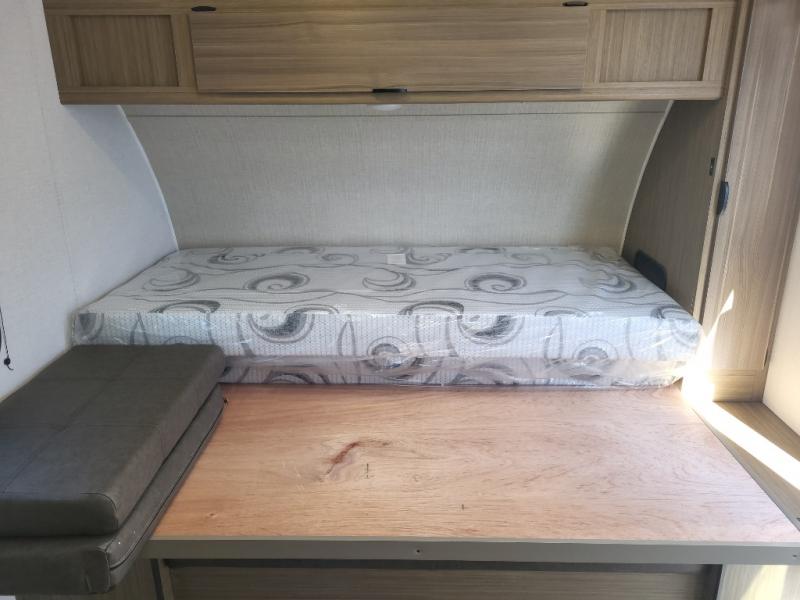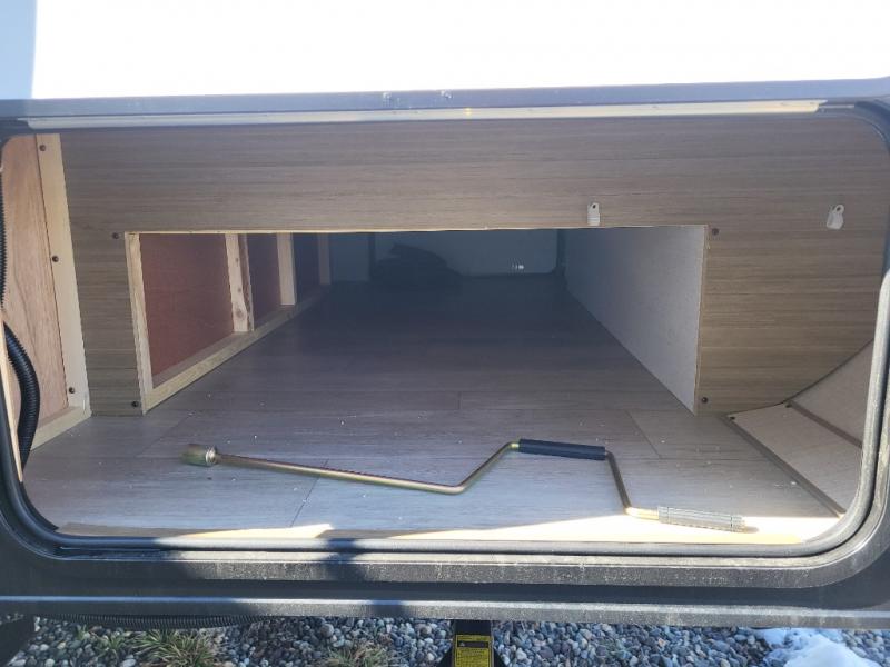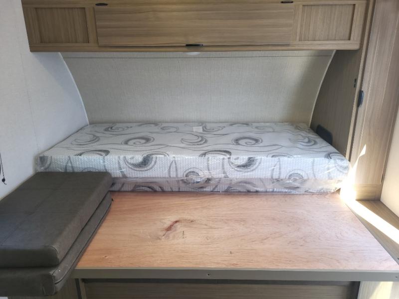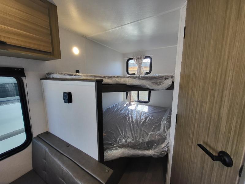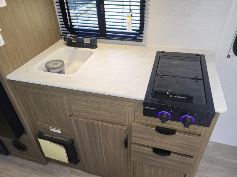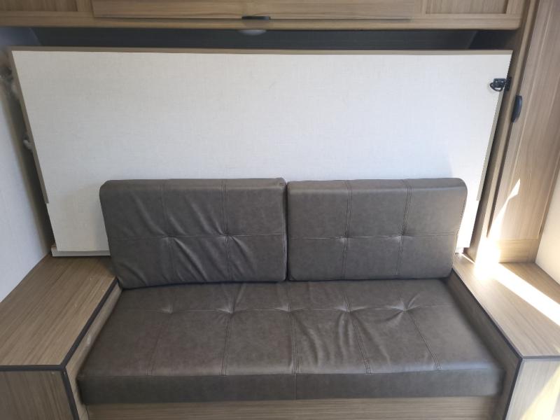 Comfort and convenience will be found in this travel trailer! From the set of double bed bunks to the front Murphy bed that offers sofa seating during the day and a queen bed to sleep on at night. Everyone can freshen up in the rear corner bathroom with the shower. The kitchen has everything you need to prepare your best home cooked meals and you can enjoy them at the booth dinette with a window to look out at your beautiful scenery. There is even an outside kitchen with a griddle and mini fridge so you can cook in the great outdoors. With an exterior full pass-through storage area, you can bring all of your outdoor gear!