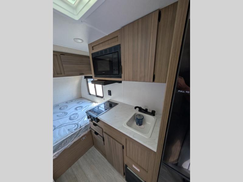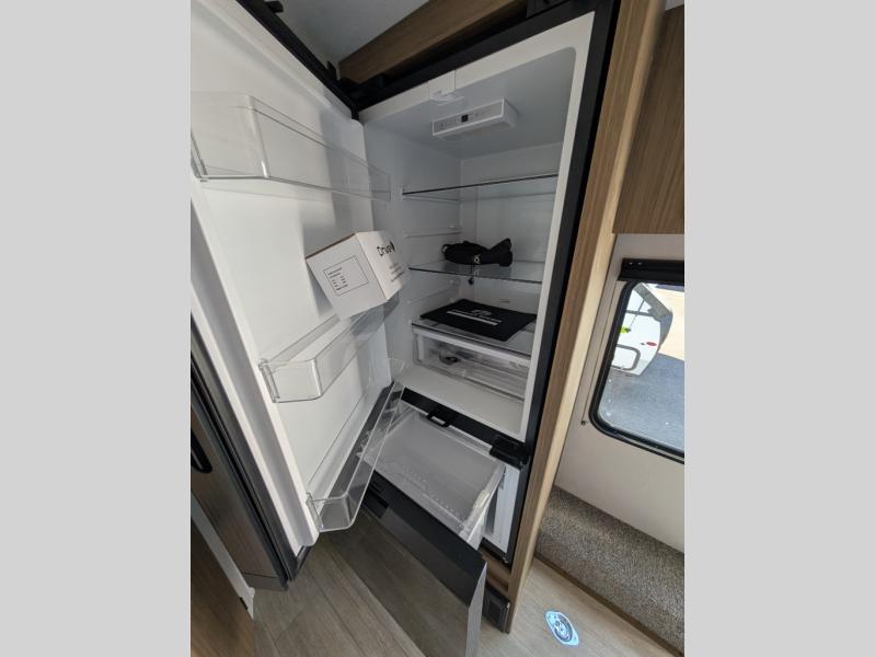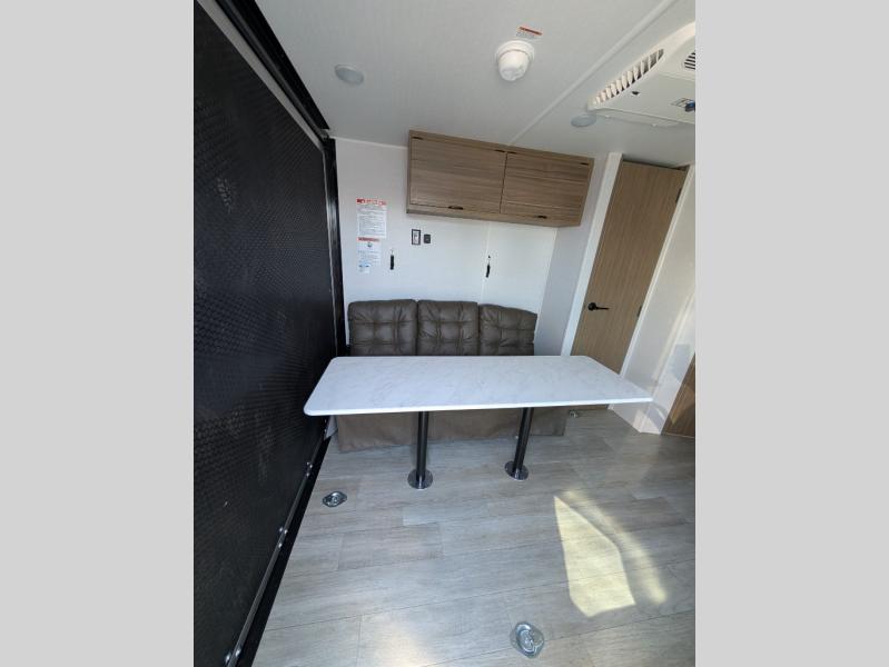 You don't have to leave your favorite off-road toys home with this toy hauler! They can easily be loaded with the 82" x 75" 3,000 lb. ramp door, and stored in the 13' 5" total garage length when you utilize the space to the front bed. Once you have arrived, you can set up the flip down sofa with removable table, unpack the pass-through storage, and grab a snack from the walk-in pantry. The private bathroom has a shower to freshen up in each morning. Prepare your best meals with the two burner cooktop and store any leftovers in the refrigerator. Get a good night's rest on the front queen bed, and store your belongings in the overhead cabinet.