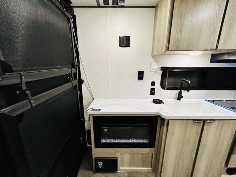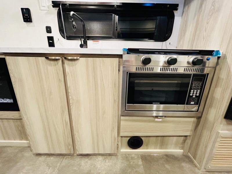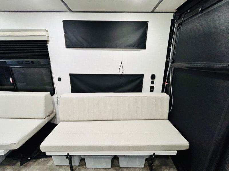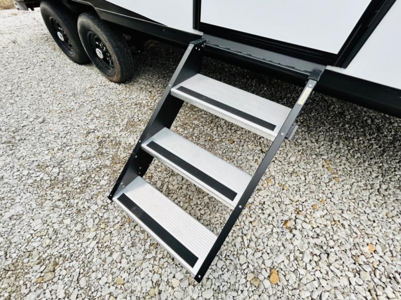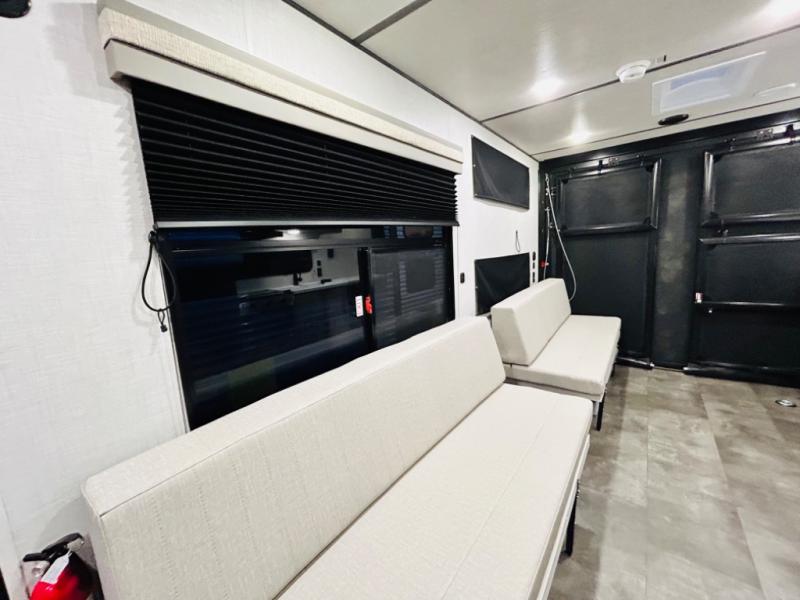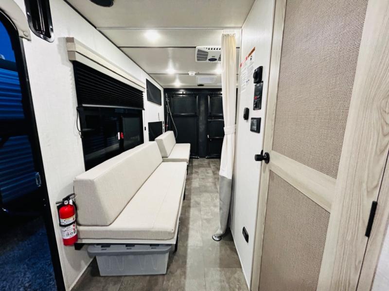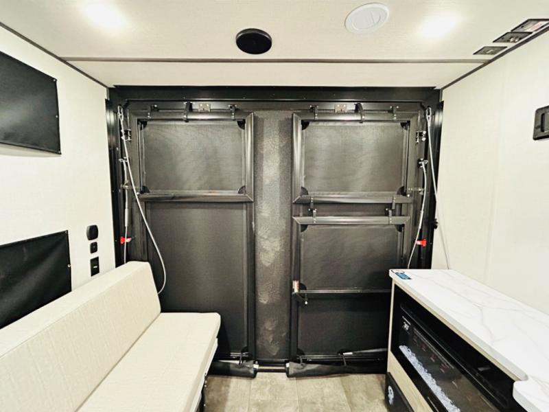 There is plenty of room in this toy hauler for your off-road toys and to comfortably live at the campsite! The 3,000 lb. ramp door makes it easy to load your toys, the 1,500 lb. tie downs will keep them securely in place, and the party patio with 1,500 lb. max weight capacity is the perfect place to socialize together and share stories. Keep your bellies full with the two burner cooktop and your perishables fresh with the dual swinging 12V refrigerator. Everyone will have a comfortable place to sleep between the two 30" x 72" sofa sleepers and the front queen bed with a shelf above and wardrobe to keep your clothes looking nice, plus there are USB ports to keep your electronics at 100%. Freshen up each morning in the full bathroom with the shower with a skylight above for natural lighting!