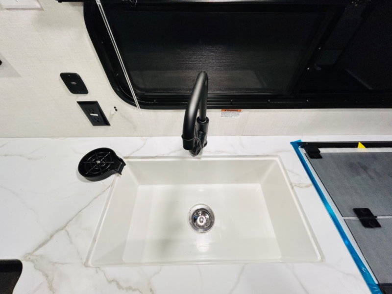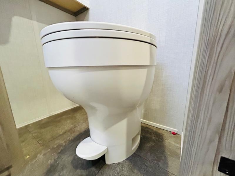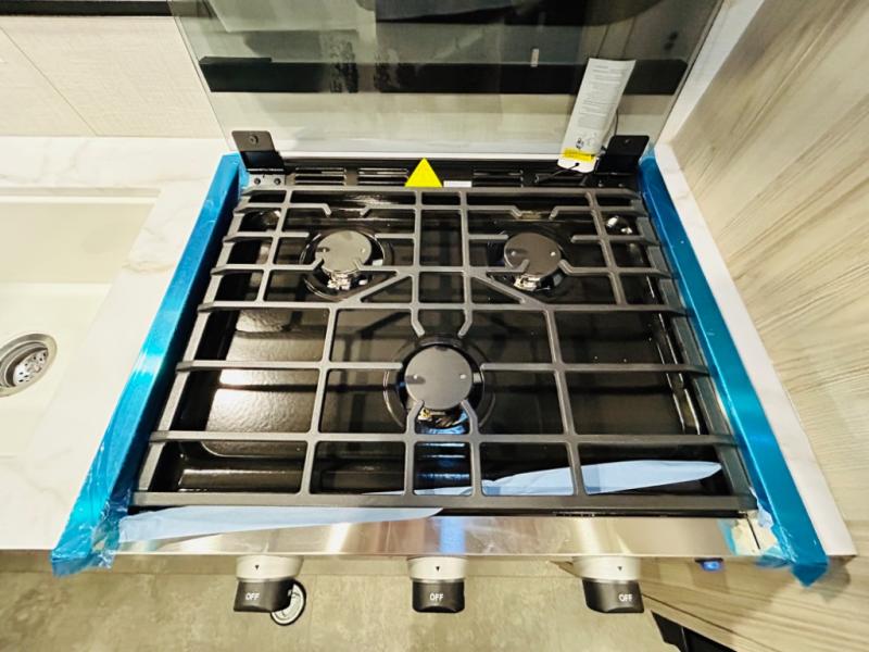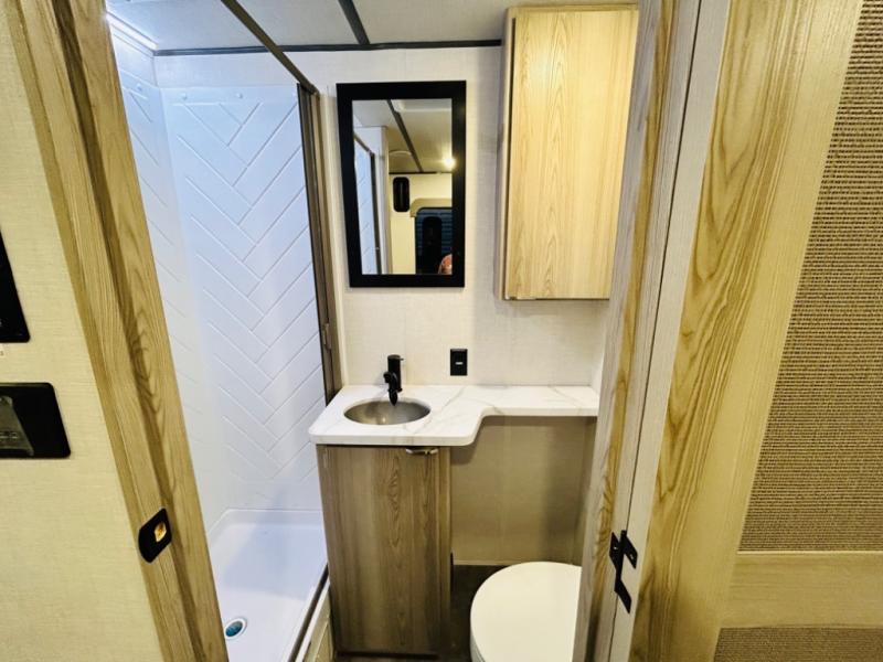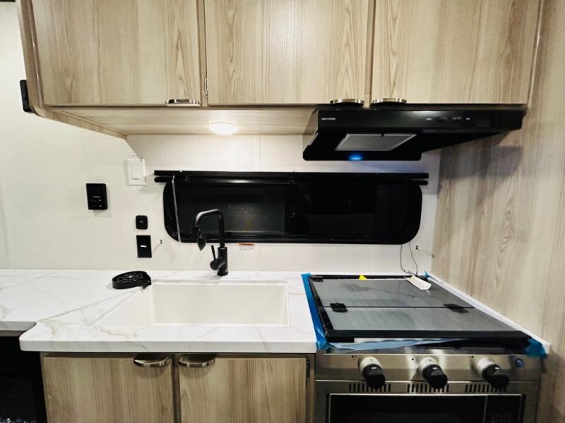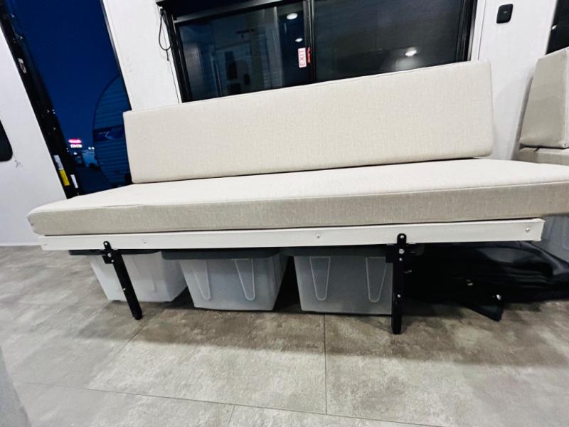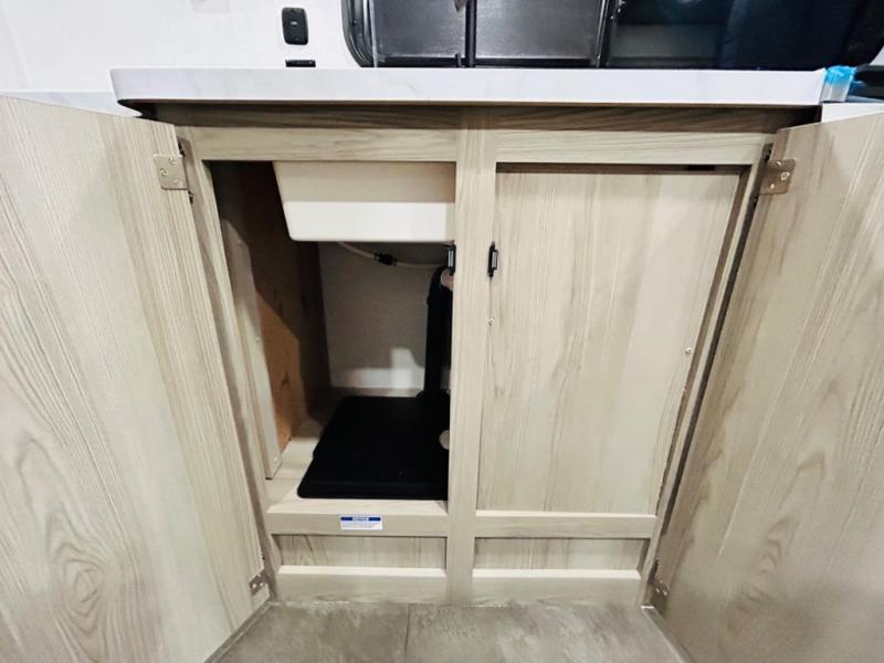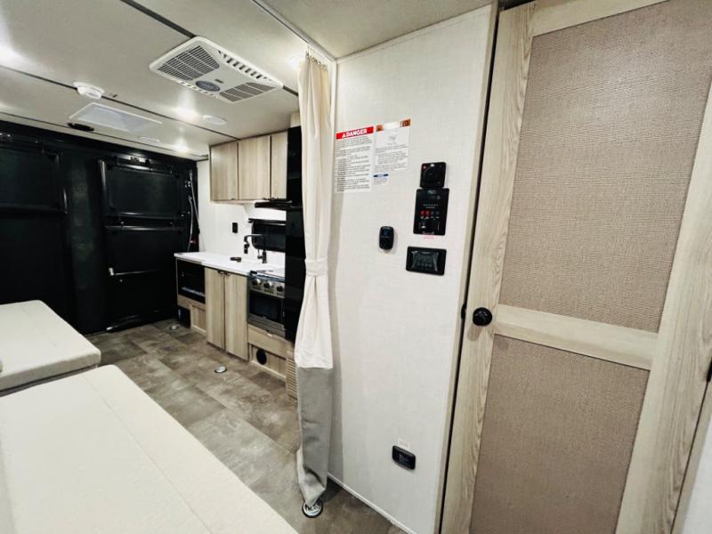 There is plenty of room in this toy hauler for your off-road toys and to comfortably live at the campsite! The 3,000 lb. ramp door makes it easy to load your toys, the 1,500 lb. tie downs will keep them securely in place, and the party patio with 1,500 lb. max weight capacity is the perfect place to socialize together and share stories. Keep your bellies full with the two burner cooktop and your perishables fresh with the dual swinging 12V refrigerator. Everyone will have a comfortable place to sleep between the two 30" x 72" sofa sleepers and the front queen bed with a shelf above and wardrobe to keep your clothes looking nice, plus there are USB ports to keep your electronics at 100%. Freshen up each morning in the full bathroom with the shower with a skylight above for natural lighting!
