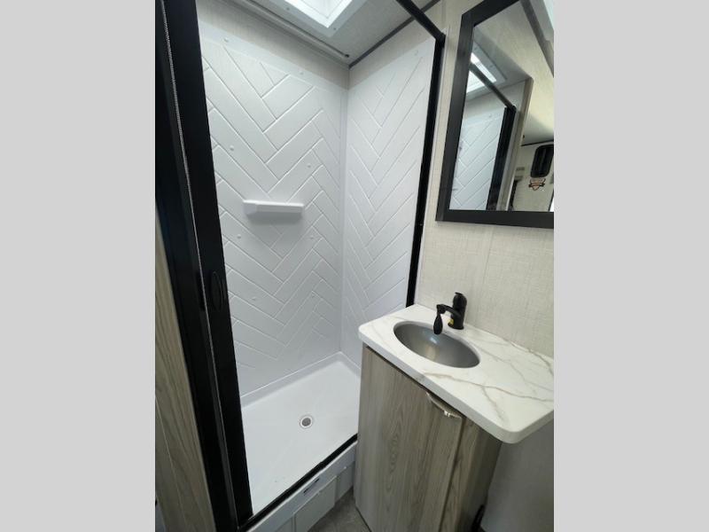 There is plenty of room in this toy hauler for your off-road toys and to comfortably live at the campsite! The 3,000 lb. ramp door makes it easy to load your toys, the 1,500 lb. tie downs will keep them securely in place, and the party patio with 1,500 lb. max weight capacity is the perfect place to socialize together and share stories. Keep your bellies full with the two burner cooktop and your perishables fresh with the 12V refrigerator. Everyone will have a comfortable place to sleep between the two 30" x 72" sofa sleepers and the front queen bed with a shelf above and wardrobe to keep your clothes looking nice, plus there are USB ports to keep your electronics at 100%. Freshen up each morning in the full bathroom with the shower with a skylight above for natural lighting!