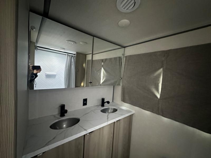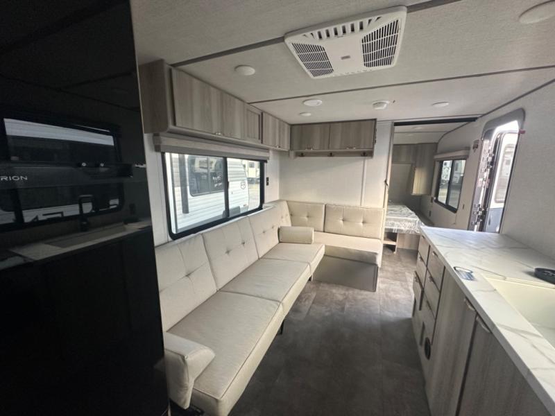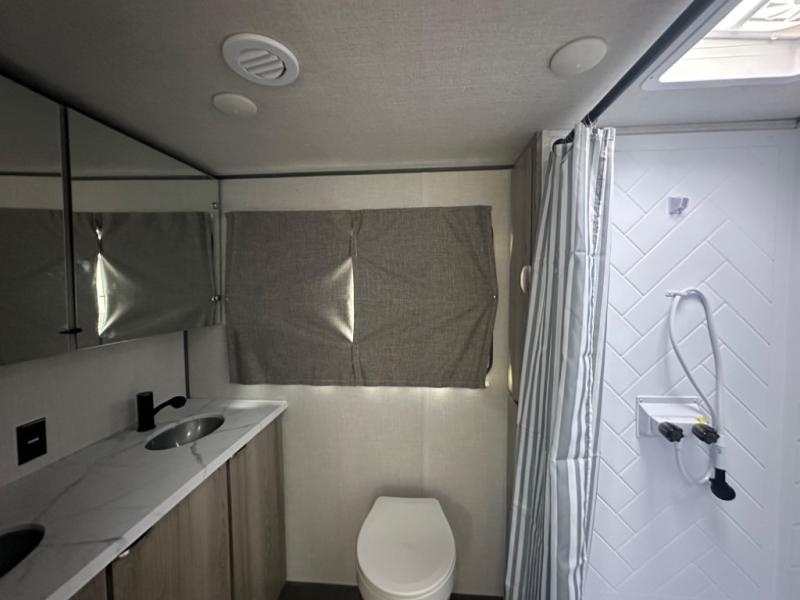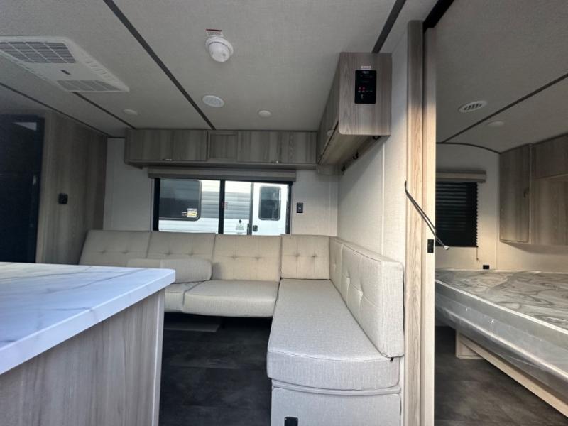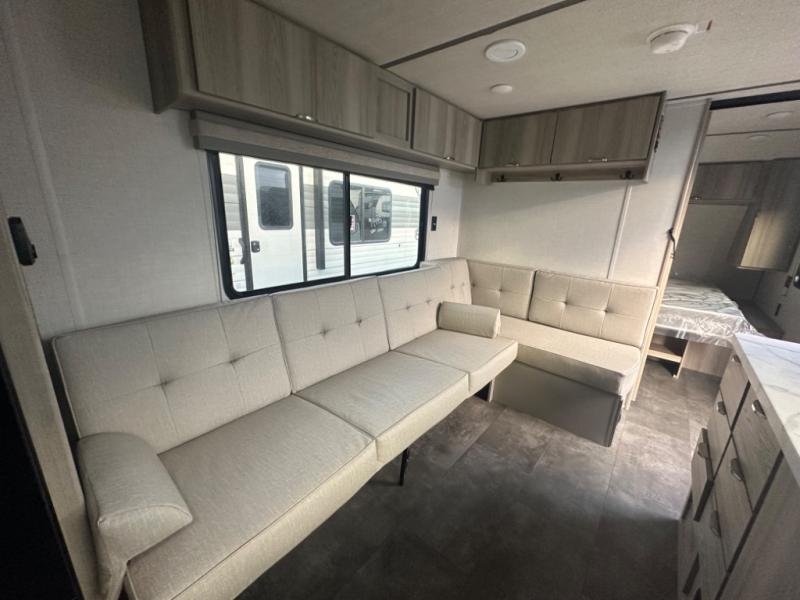 Camping is made easy in this travel trailer with at-home comforts! You'll have the front private bedroom with a king bed all to yourselves, and there are dual bedroom wardrobes to keep your space neat and clean. Any additional guests can sleep on the super lounge with a removable table. You will appreciate the full rear bath complete with a linen closet and dual bath sinks so you both can get ready for bed at once. And a full kitchen lets you whip up your best meals!