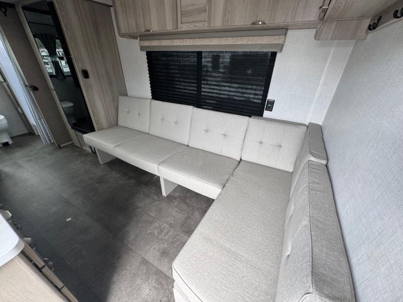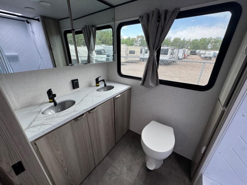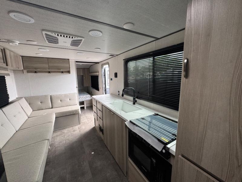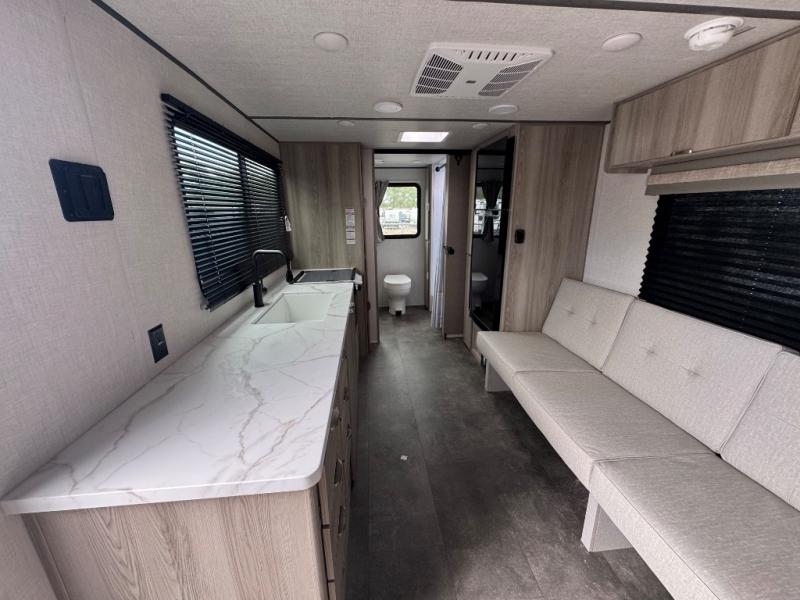Camping is made easy in this travel trailer with at-home comforts! You'll have the front private bedroom with a king bed all to yourselves, and there are dual bedroom wardrobes to keep your space neat and clean. Any additional guests can sleep on the super lounge with a removable table. You will appreciate the full rear bath complete with a linen closet and dual bath sinks so you both can get ready for bed at once. And a full kitchen lets you whip up your best meals!