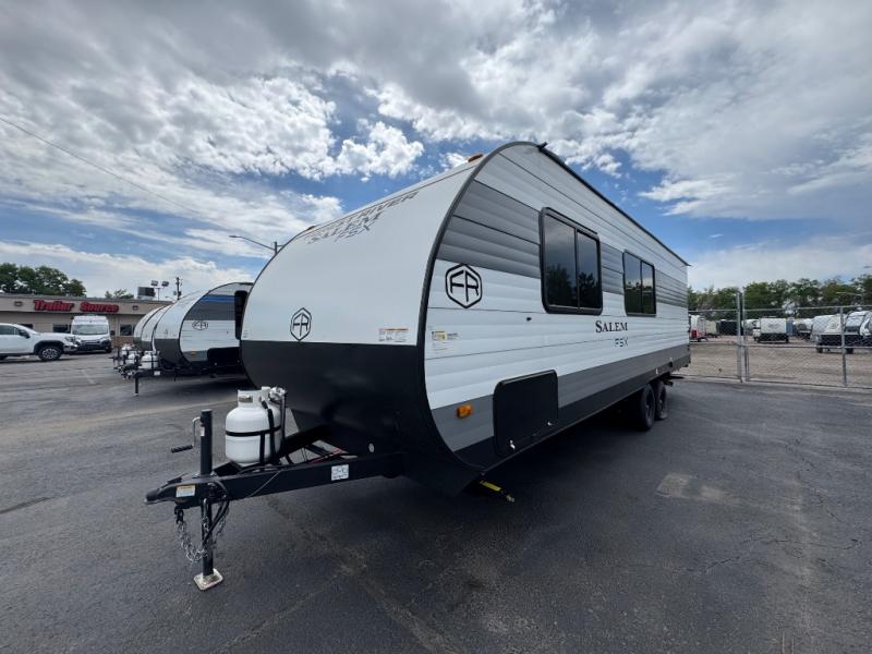 The Forest River Salem FSX travel trailers and toy hauler travel trailers are ultra comfortable and lightweight, perfect for first time or seasoned campers alike! You will love how easy it will be to relax with residential features that will make your space feel just like home, and the durable construction means you can enjoy your RV for years to come. There are a wide variety of floorplans to choose from, including couple's trailers, bunk models, and toy haulers, all with full bath and kitchen amenities and plenty of storage for all your gear!