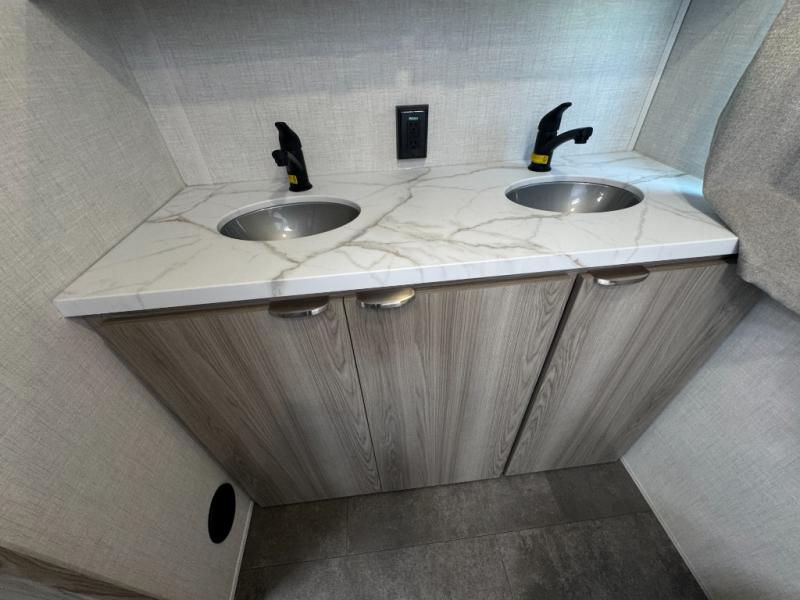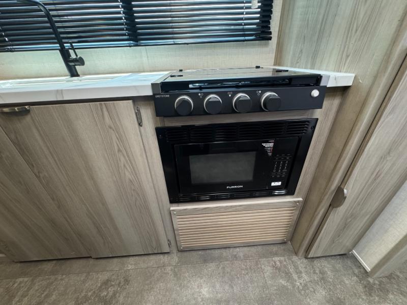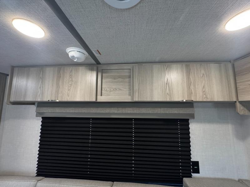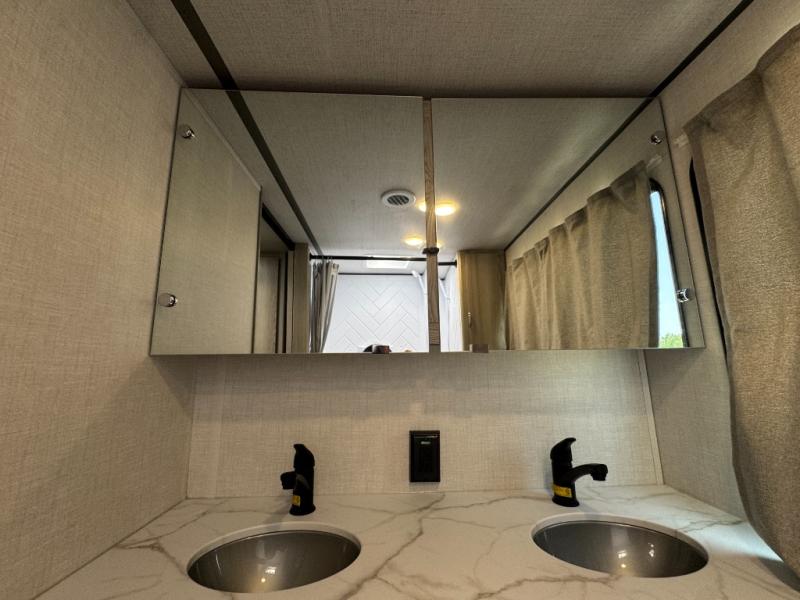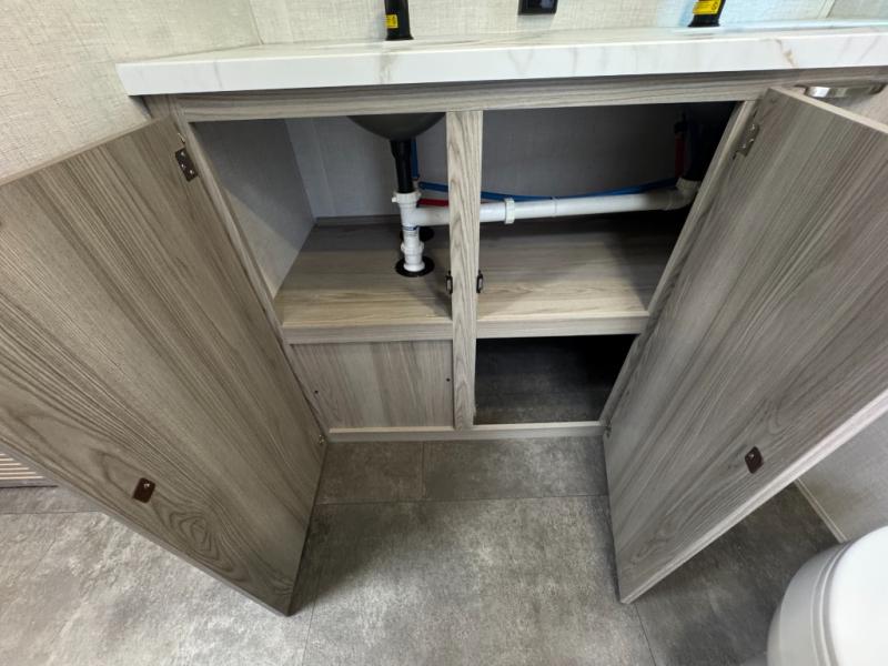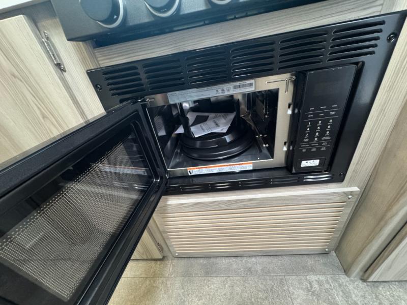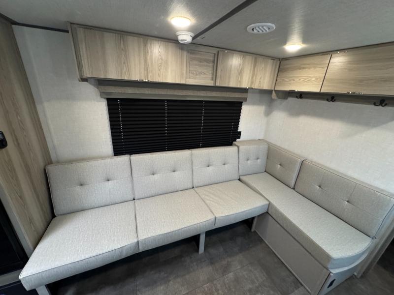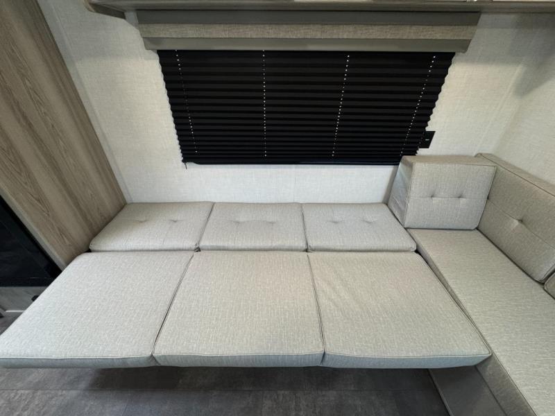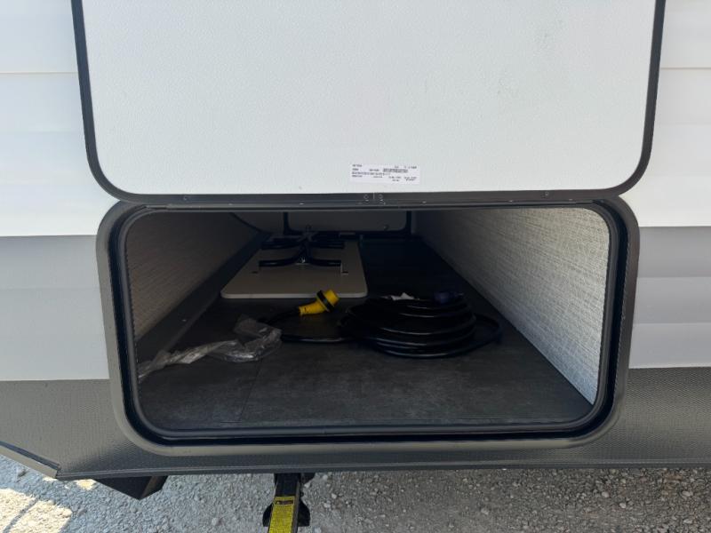 Camping is made easy in this travel trailer with at-home comforts! You'll have the front private bedroom with a king bed all to yourselves, and there are dual bedroom wardrobes to keep your space neat and clean. Any additional guests can sleep on the super lounge with a removable table. You will appreciate the full rear bath complete with a linen closet and dual bath sinks so you both can get ready for bed at once. And a full kitchen lets you whip up your best meals!