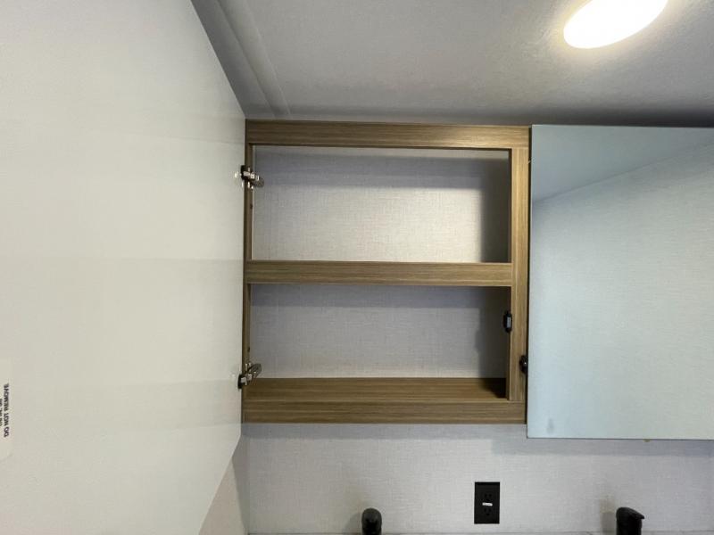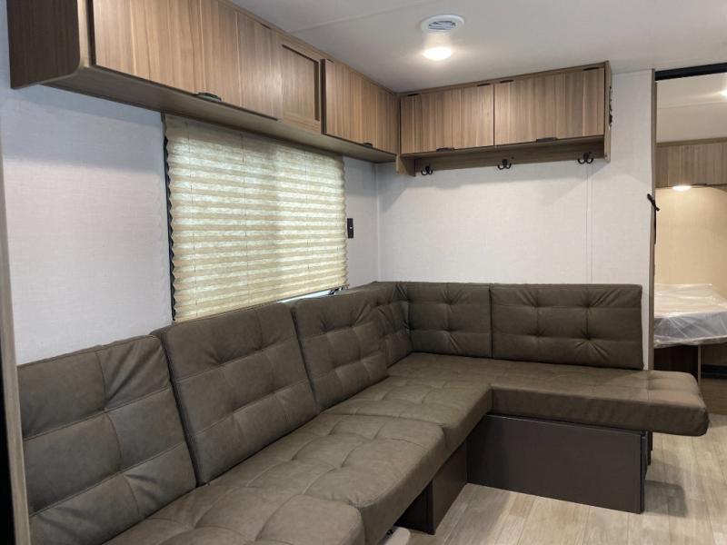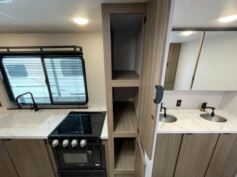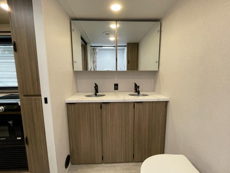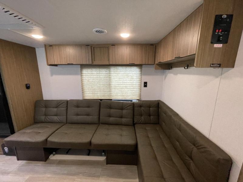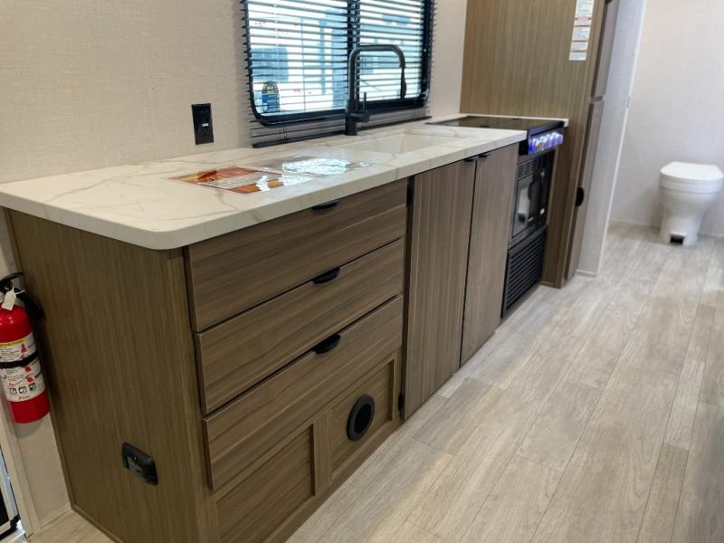 Camping is made easy in this travel trailer with at-home comforts! You'll have the front private bedroom with a king bed all to yourselves, and there are dual bedroom wardrobes to keep your space neat and clean. Any additional guests can sleep on the super lounge with a removable table. You will appreciate the full rear bath complete with a linen closet and dual bath sinks so you both can get ready for bed at once. And a full kitchen lets you whip up your best meals!
