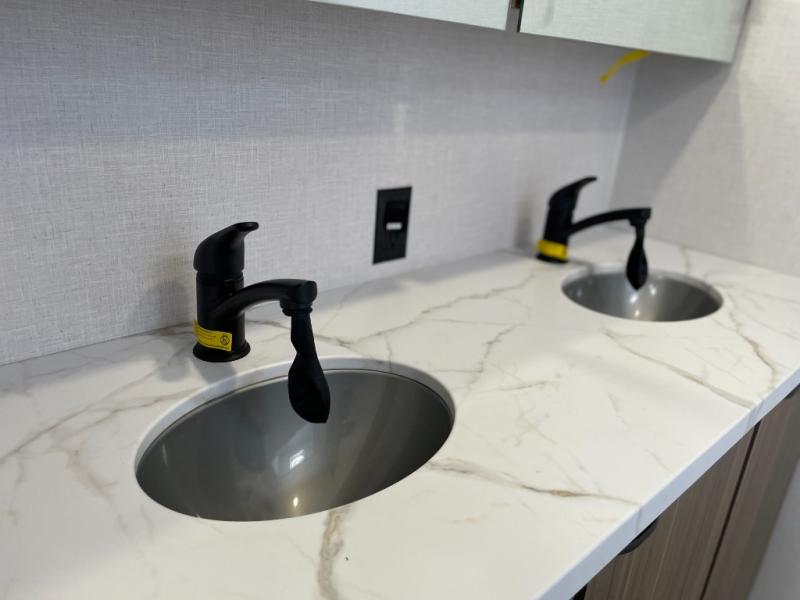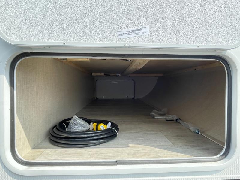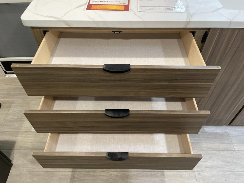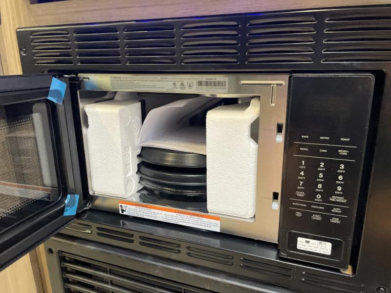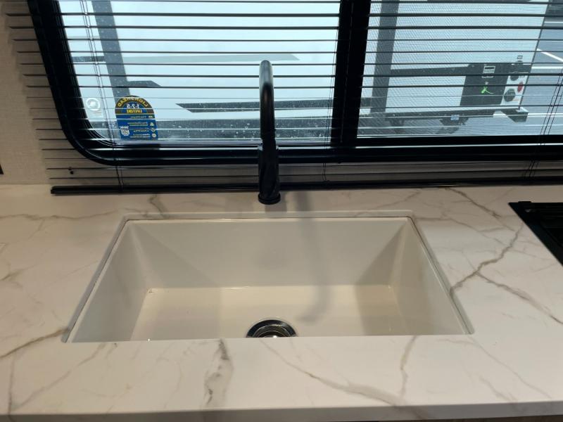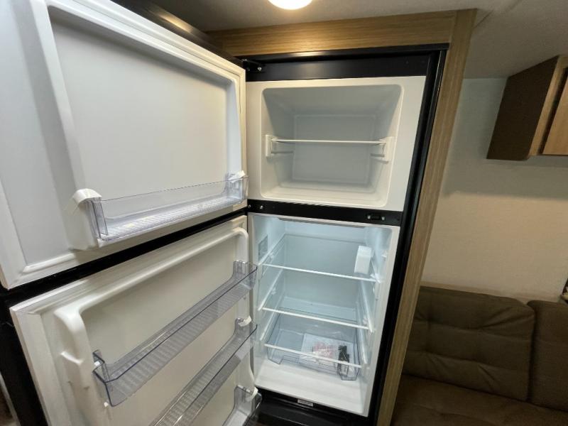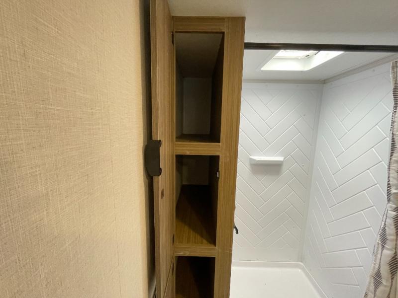 Camping is made easy in this travel trailer with at-home comforts! You'll have the front private bedroom with a king bed all to yourselves, and there are dual bedroom wardrobes to keep your space neat and clean. Any additional guests can sleep on the super lounge with a removable table. You will appreciate the full rear bath complete with a linen closet and dual bath sinks so you both can get ready for bed at once. And a full kitchen lets you whip up your best meals!