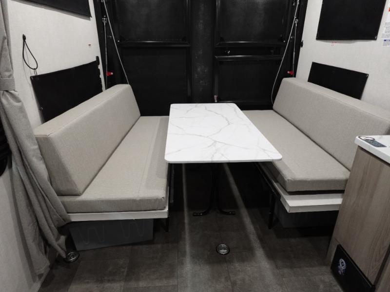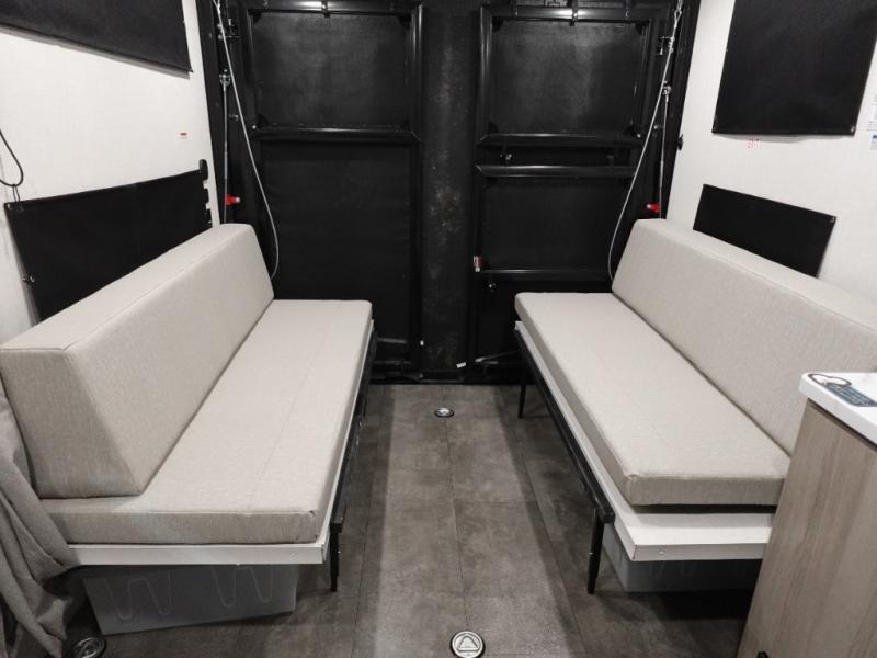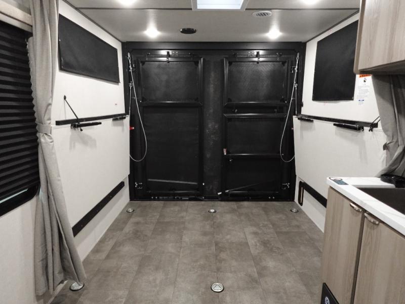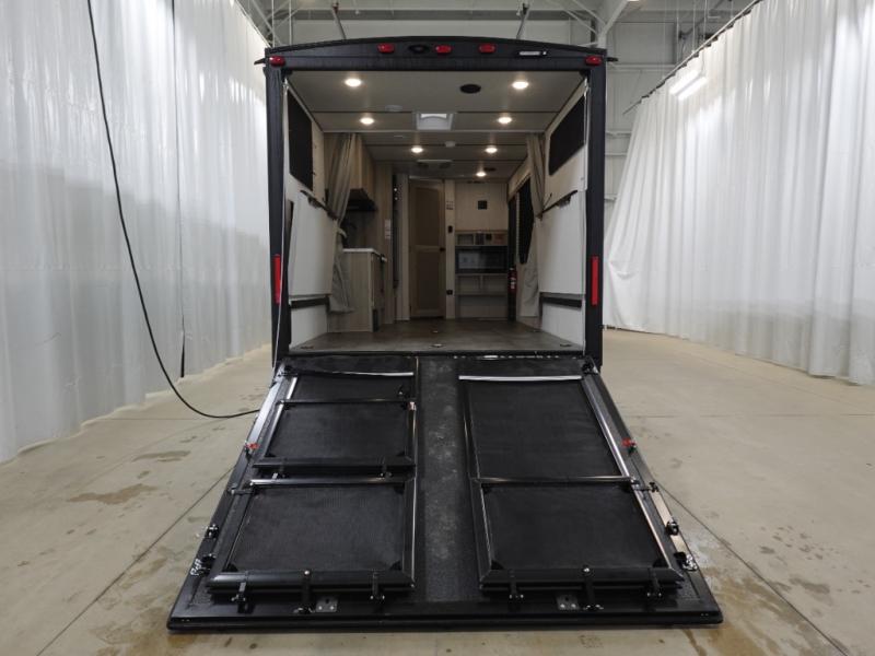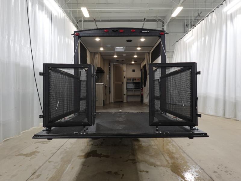 You will feel right at home in this toy hauler! The front private bedroom has a king bed to lay your head on at night with wardrobes on either side of it for your clothes. You even have access to the walk-through bathroom which has a neo-angled shower. Prepare your best home cooked meals with the 3-in-1 cooker with a convection oven and three burner cooktop, enjoy them at the opposing 30" x 72" sofa sleepers with a table in between, and store any leftovers in the 12V refrigerator. The 90" x 75", 3,000 lb. ramp door doubles as a party patio with a 1,500 lb. max weight capacity so you can invite your neighboring campers to join in on the fun!