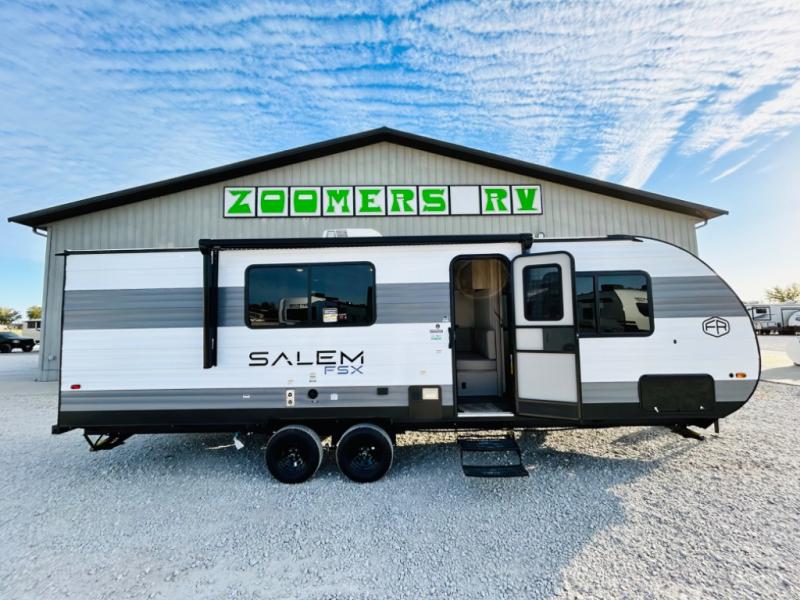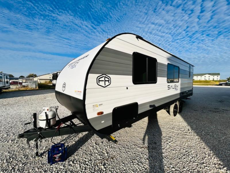 The Forest River Salem FSX travel trailers and toy hauler travel trailers are ultra comfortable and lightweight, perfect for first time or seasoned campers alike! You will love how easy it will be to relax with residential features that will make your space feel just like home, and the durable construction means you can enjoy your RV for years to come. There are a wide variety of floorplans to choose from, including couple's trailers, bunk models, and toy haulers, all with full bath and kitchen amenities and plenty of storage for all your gear!