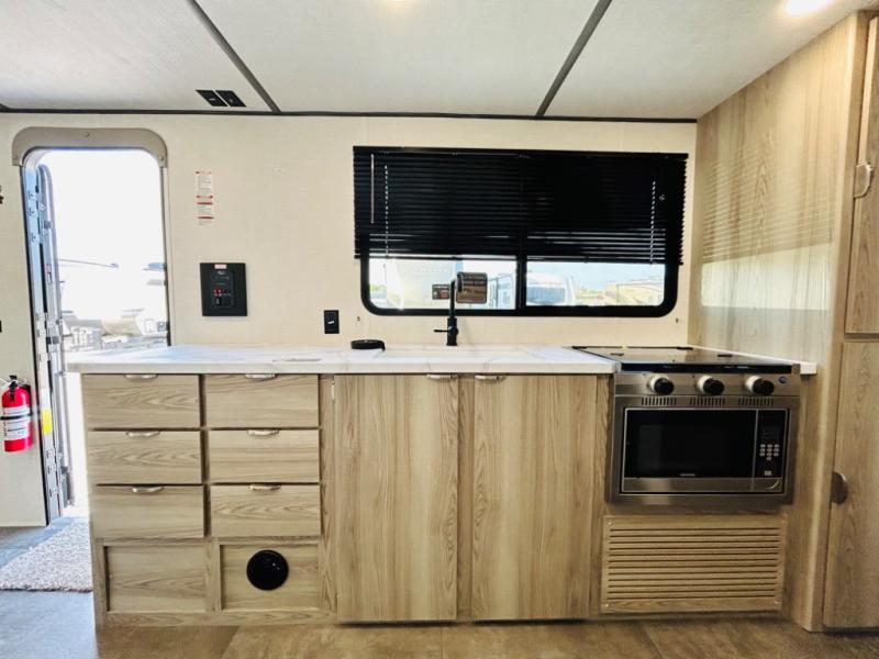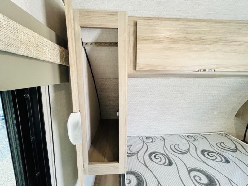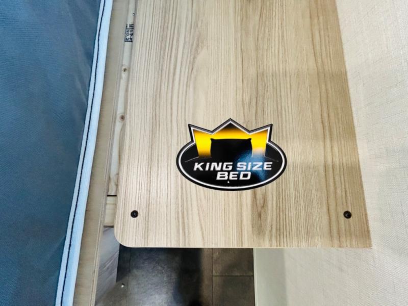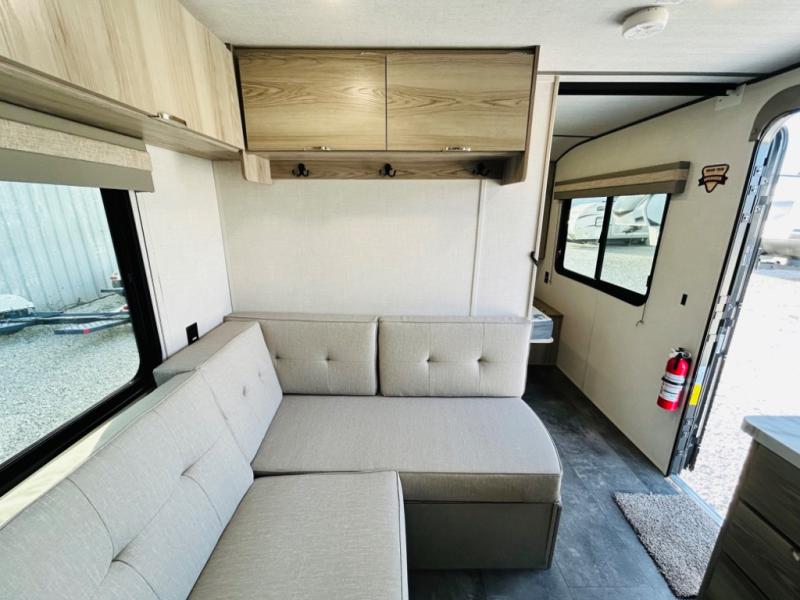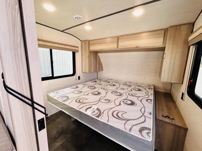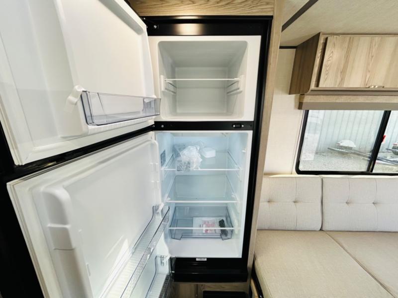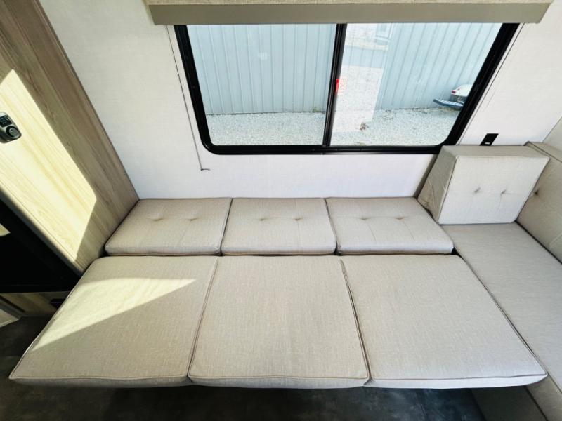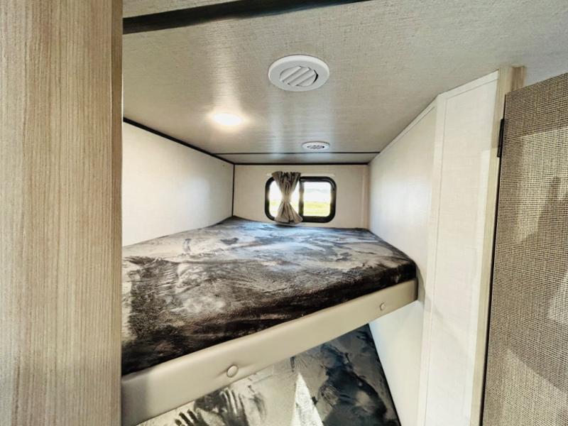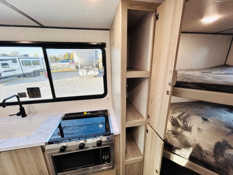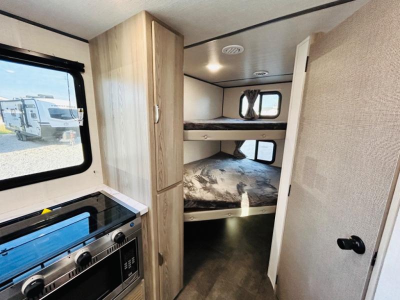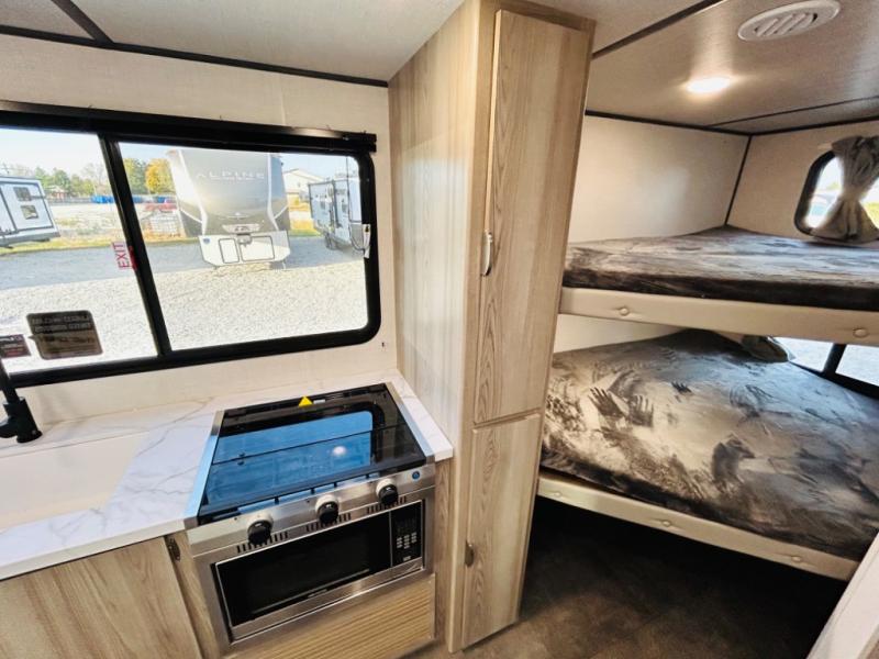 Camping is made easy in this travel trailer with more sleeping space and lots of comforts! The kids or your guests will enjoy the double-size bunks in the back, along with the full bath close by for easy nighttime use. You'll have the front private bedroom with a king bed all to yourselves, and there are dual bedroom wardrobes to keep your space neat and clean. Everyone can meet in the combined kitchen and living room to relax on the super U-lounge with a removable table while the chef of your group makes breakfast on the two burner cooktop. There is also a microwave oven for quick meals, plus a pantry and 4.5 cu. ft. refrigerator for food storage!