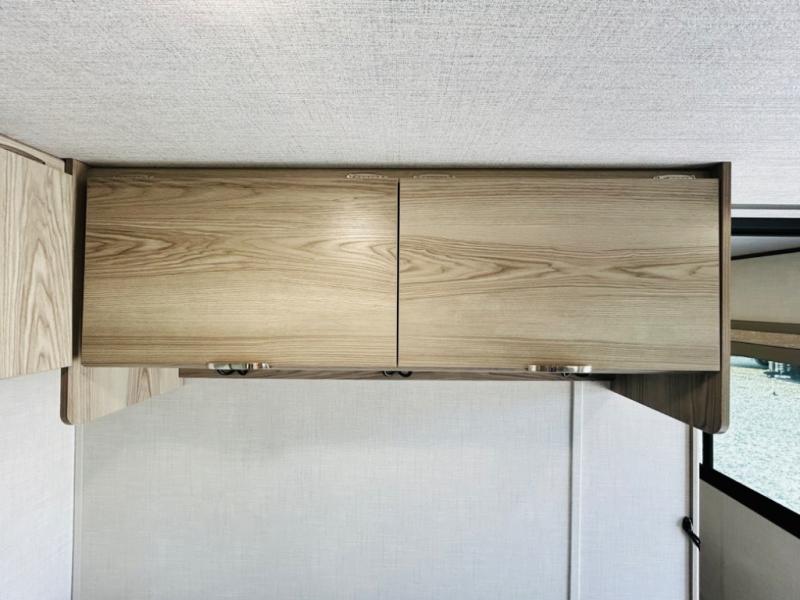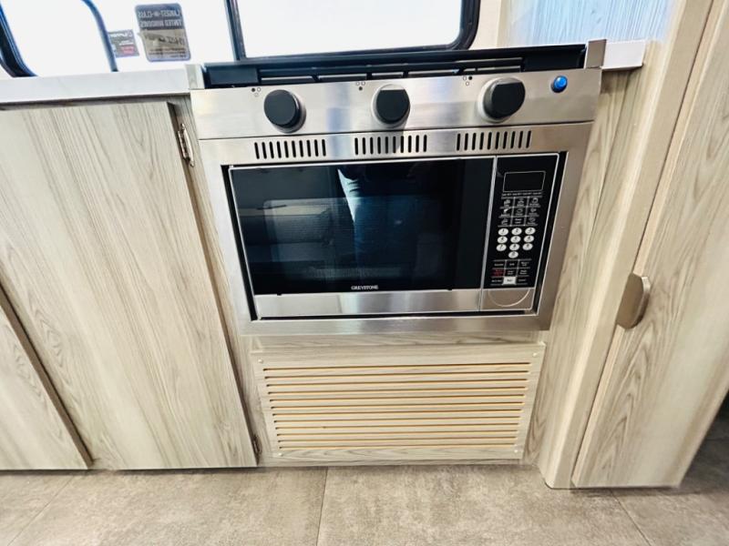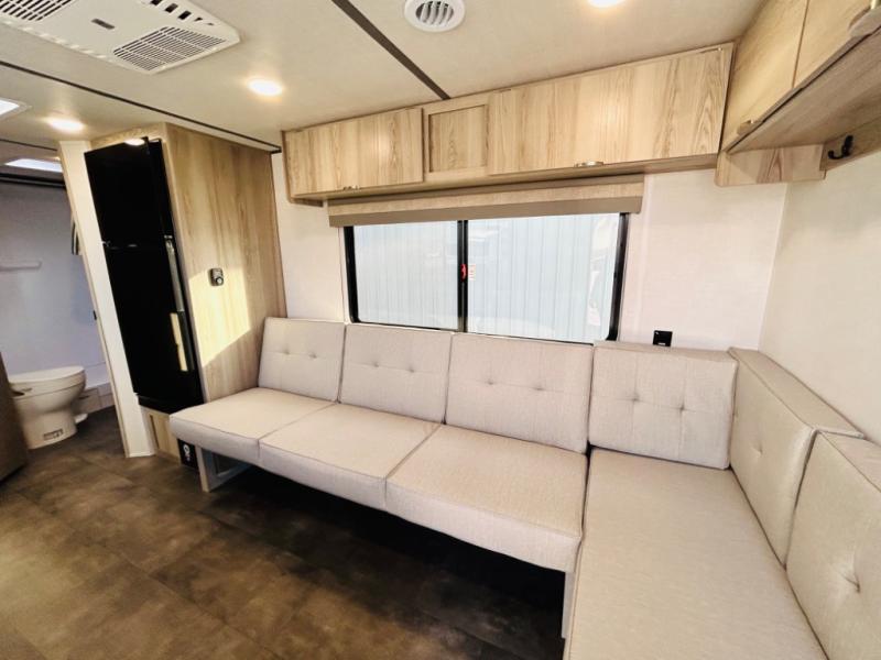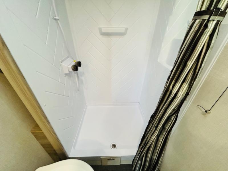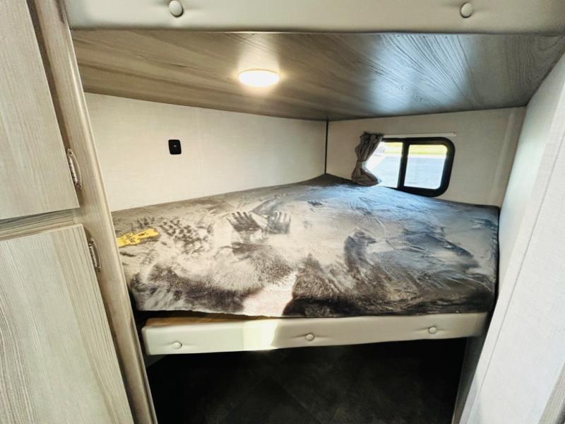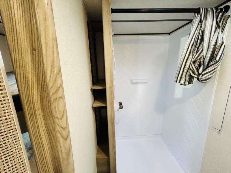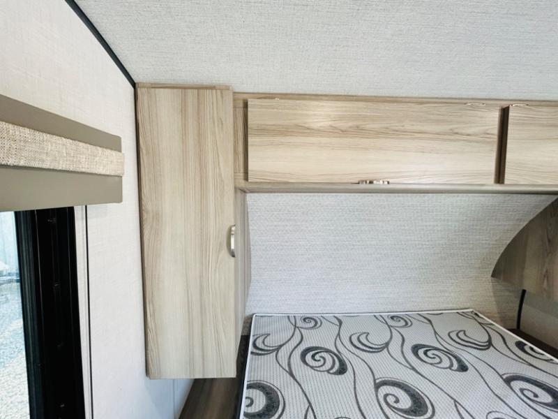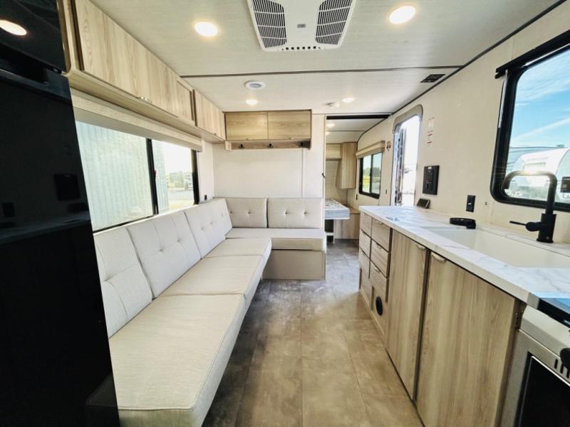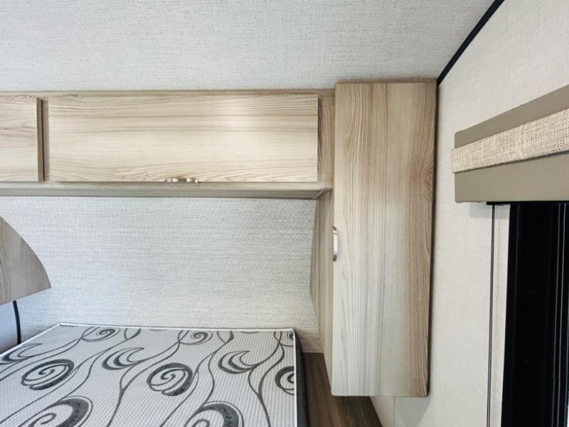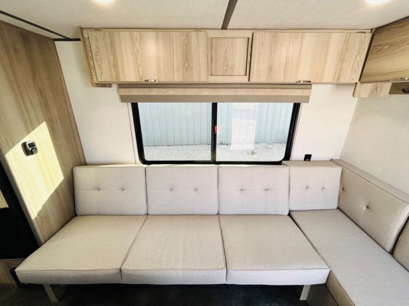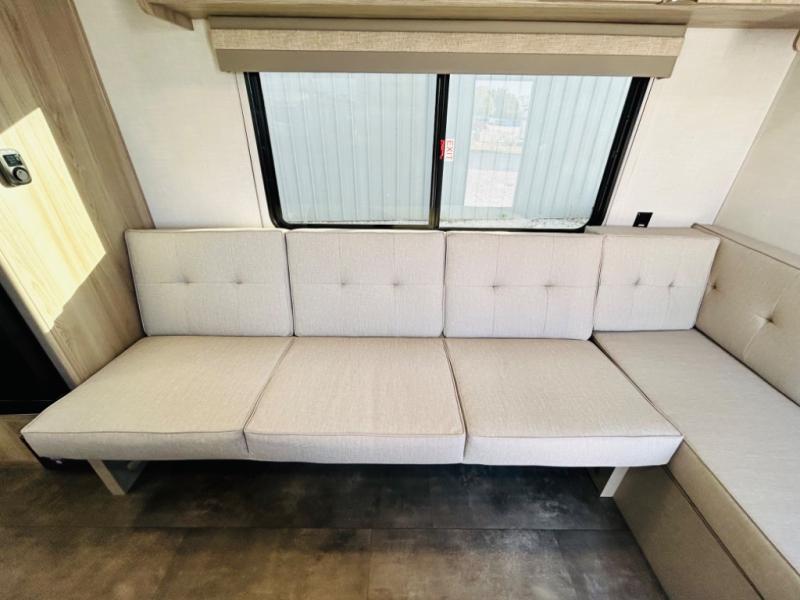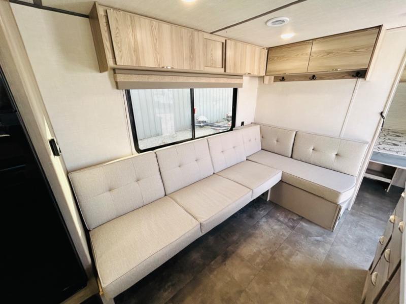 Camping is made easy in this travel trailer with more sleeping space and lots of comforts! The kids or your guests will enjoy the double-size bunks in the back, along with the full bath close by for easy nighttime use. You'll have the front private bedroom with a king bed all to yourselves, and there are dual bedroom wardrobes to keep your space neat and clean. Everyone can meet in the combined kitchen and living room to relax on the super U-lounge with a removable table while the chef of your group makes breakfast on the two burner cooktop. There is also a microwave oven for quick meals, plus a pantry and 4.5 cu. ft. refrigerator for food storage!