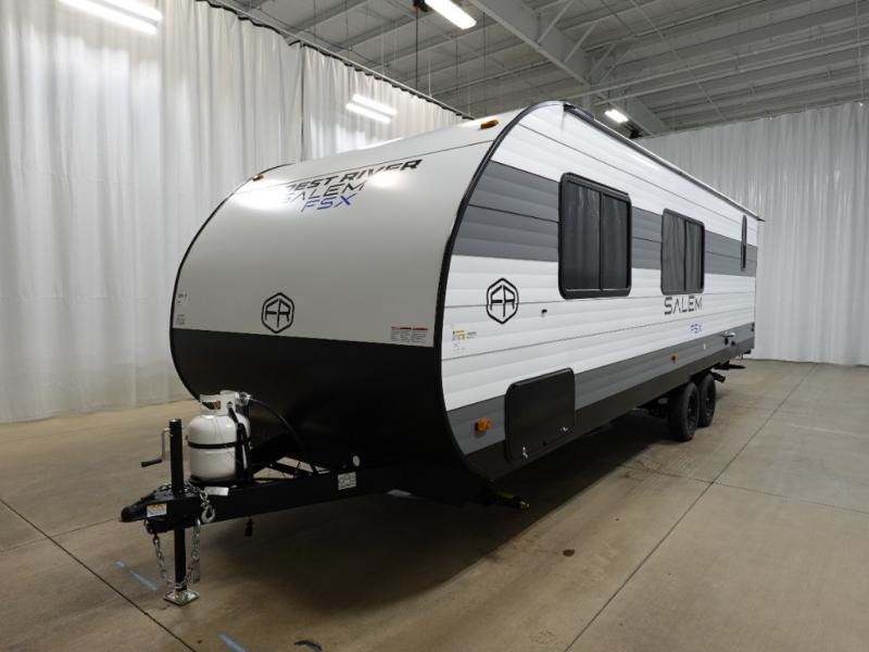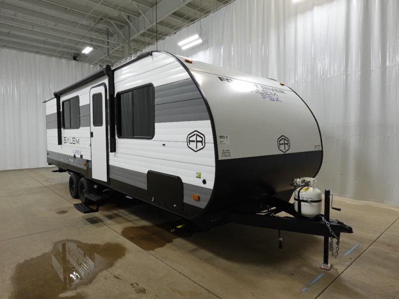 The Forest River Salem FSX travel trailers and toy hauler travel trailers are ultra comfortable and lightweight, perfect for first time or seasoned campers alike! You will love how easy it will be to relax with residential features that will make your space feel just like home, and the durable construction means you can enjoy your RV for years to come. There are a wide variety of floorplans to choose from, including couple's trailers, bunk models, and toy haulers, all with full bath and kitchen amenities and plenty of storage for all your gear!