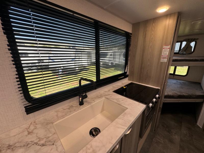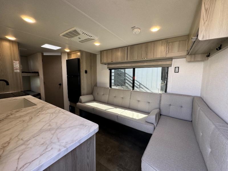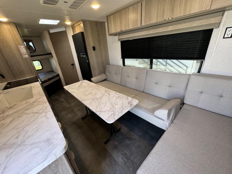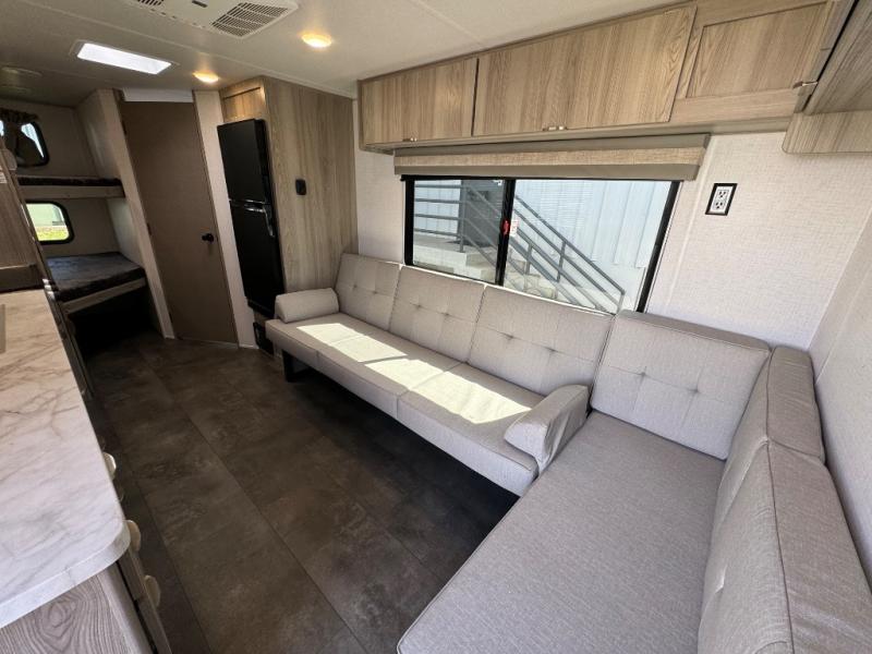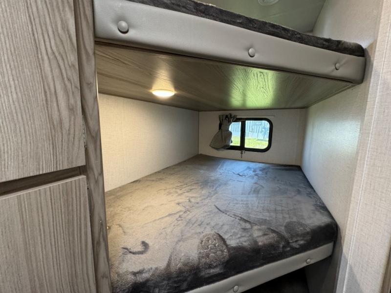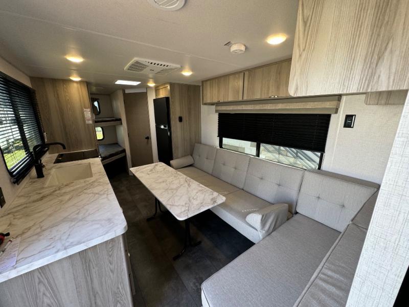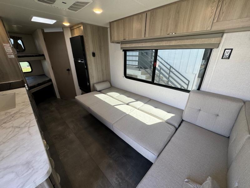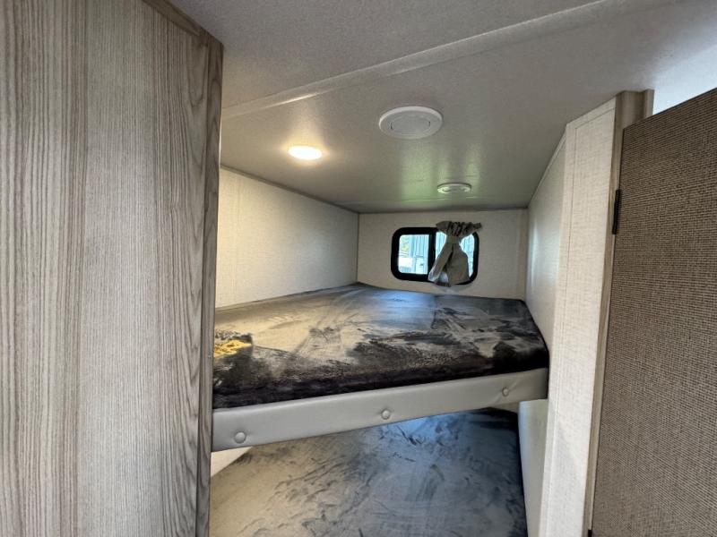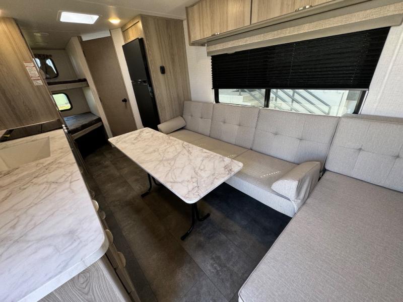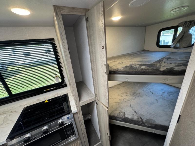 Camping is made easy in this travel trailer with more sleeping space and lots of comforts! The kids or your guests will enjoy the double-size bunks in the back, along with the full bath close by for easy nighttime use. You'll have the front private bedroom with a king bed all to yourselves, and there are dual bedroom wardrobes to keep your space neat and clean. Everyone can meet in the combined kitchen and living room to relax on the super U-lounge with a removable table while the chef of your group makes breakfast on the two burner cooktop. There is also a microwave oven for quick meals, plus a pantry and 4.5 cu. ft. refrigerator for food storage!
