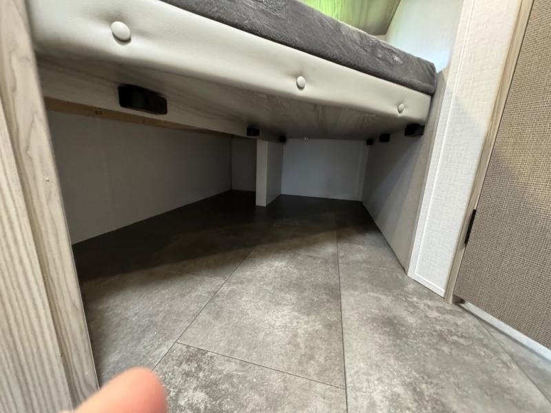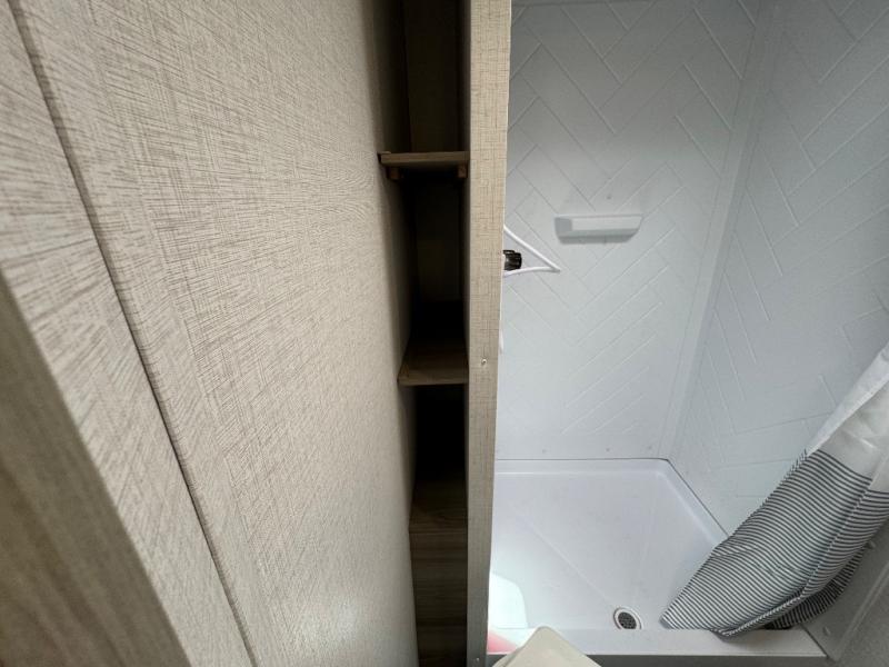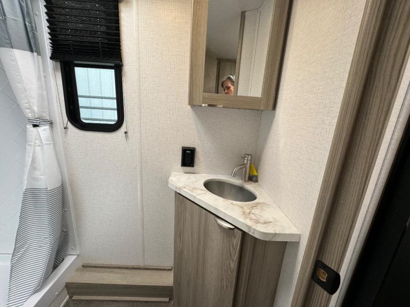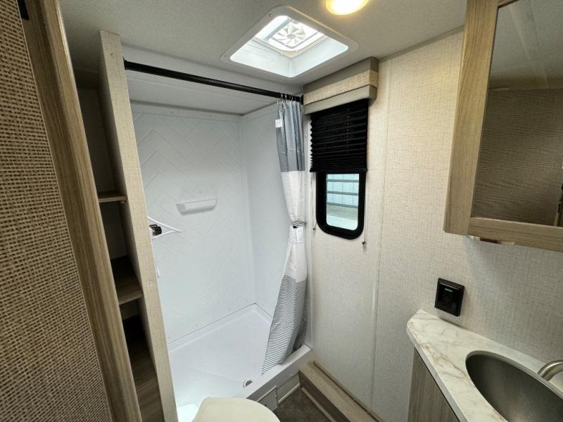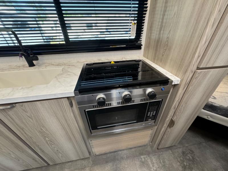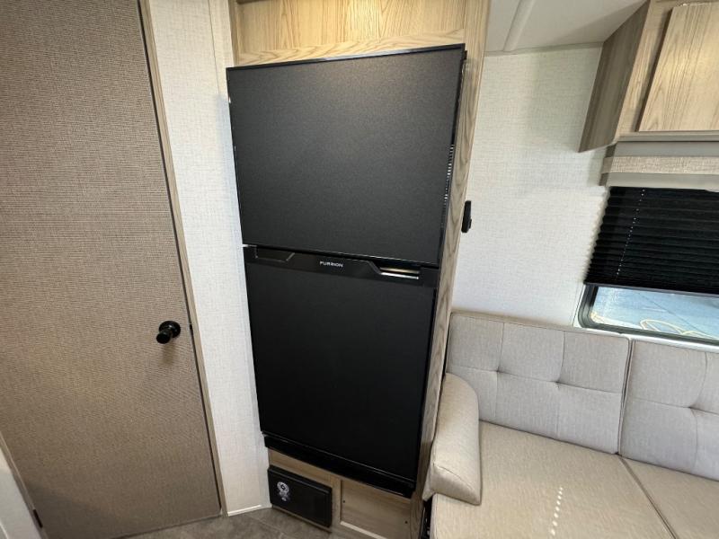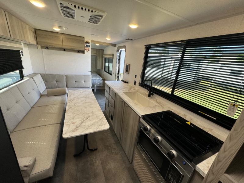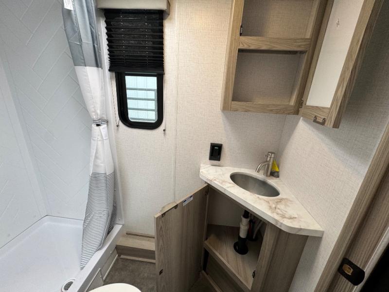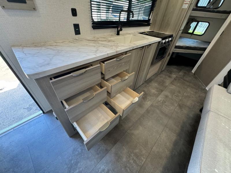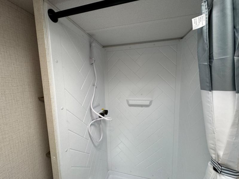 Camping is made easy in this travel trailer with more sleeping space and lots of comforts! The kids or your guests will enjoy the double-size bunks in the back, along with the full bath close by for easy nighttime use. You'll have the front private bedroom with a king bed all to yourselves, and there are dual bedroom wardrobes to keep your space neat and clean. Everyone can meet in the combined kitchen and living room to relax on the super U-lounge with a removable table while the chef of your group makes breakfast on the two burner cooktop. There is also a microwave oven for quick meals, plus a pantry and 4.5 cu. ft. refrigerator for food storage!