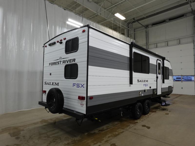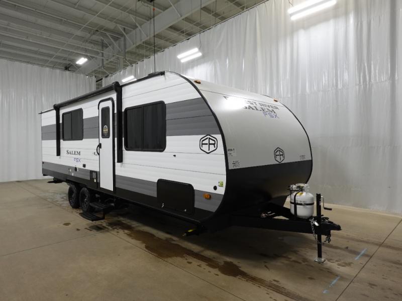 The Forest River Salem FSX travel trailers and toy hauler travel trailers are ultra comfortable and lightweight, perfect for first time or seasoned campers alike! You will love how easy it will be to relax with residential features that will make your space feel just like home, and the durable construction means you can enjoy your RV for years to come. There are a wide variety of floorplans to choose from, including couple's trailers, bunk models, and toy haulers, all with full bath and kitchen amenities and plenty of storage for all your gear!