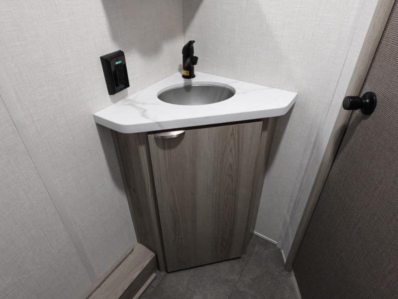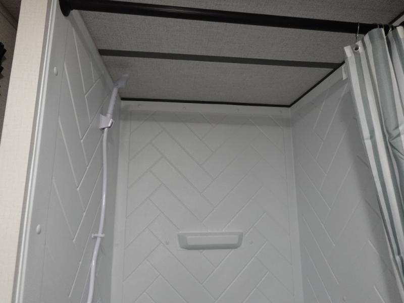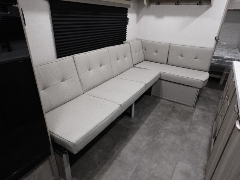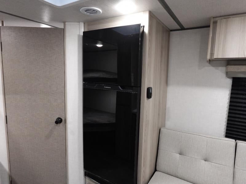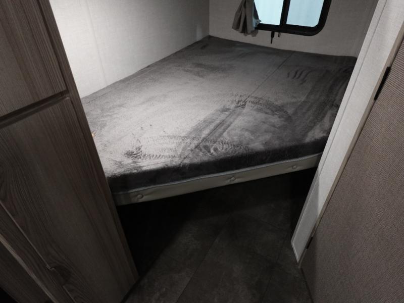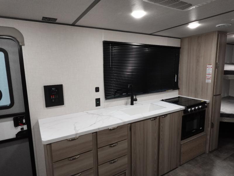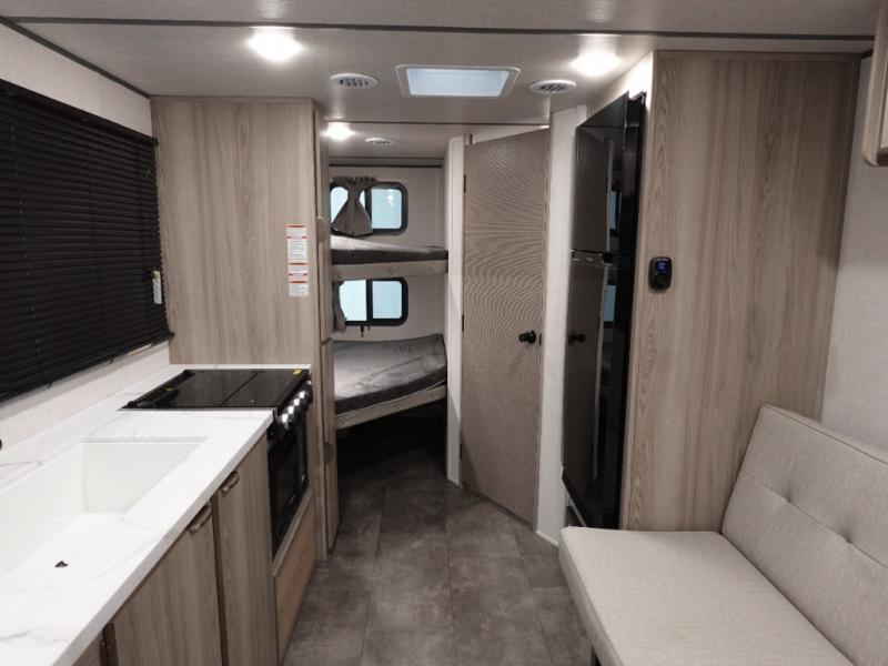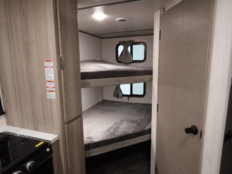 Camping is made easy in this travel trailer with more sleeping space and lots of comforts! The kids or your guests will enjoy the double-size bunks in the back, along with the full bath close by for easy nighttime use. You'll have the front private bedroom with a king bed all to yourselves, and there are dual bedroom wardrobes to keep your space neat and clean. Everyone can meet in the combined kitchen and living room to relax on the super U-lounge with a removable table while the chef of your group makes breakfast on the two burner cooktop. There is also a microwave oven for quick meals, plus a pantry and refrigerator for food storage!