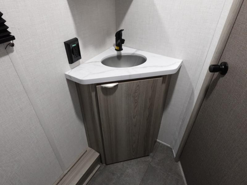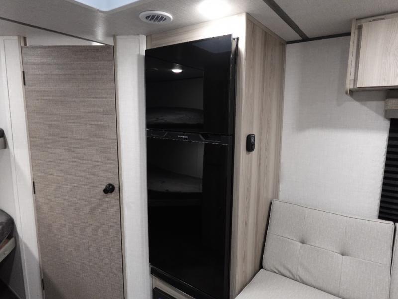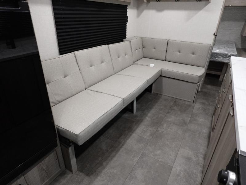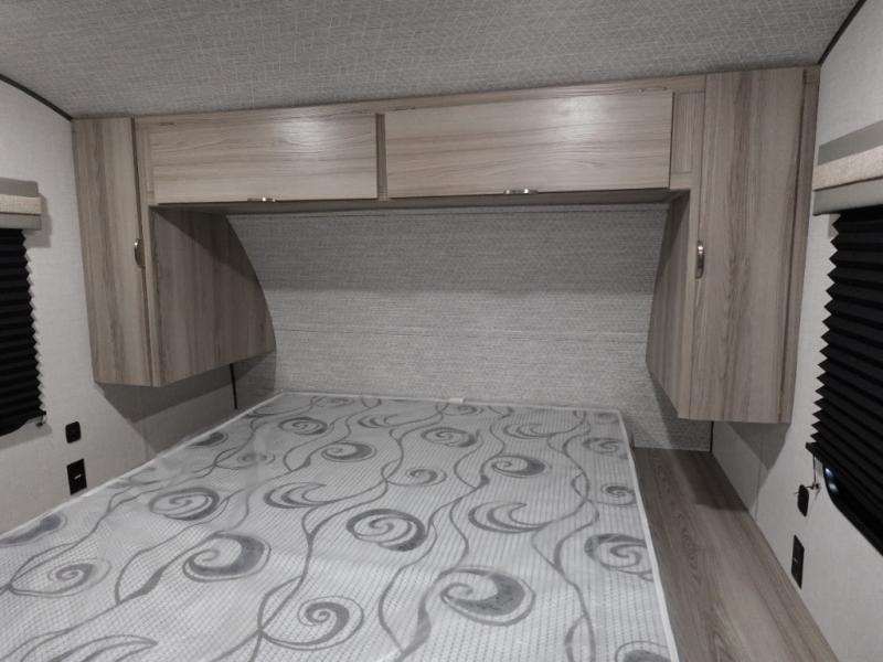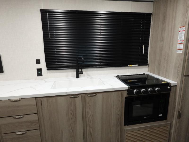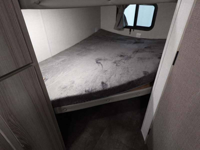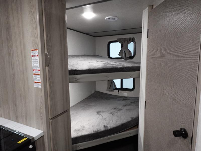 Camping is made easy in this travel trailer with more sleeping space and lots of comforts! The kids or your guests will enjoy the double-size bunks in the back, along with the full bath close by for easy nighttime use. You'll have the front private bedroom with a king bed all to yourselves, and there are dual bedroom wardrobes to keep your space neat and clean. Everyone can meet in the combined kitchen and living room to relax on the super U-lounge with a removable table while the chef of your group makes breakfast on the two burner cooktop. There is also a microwave oven for quick meals, plus a pantry and refrigerator for food storage!