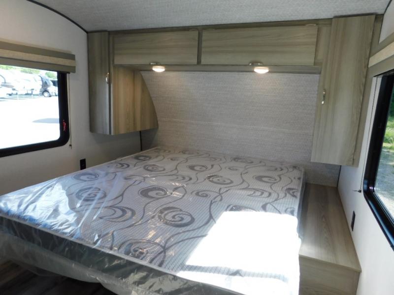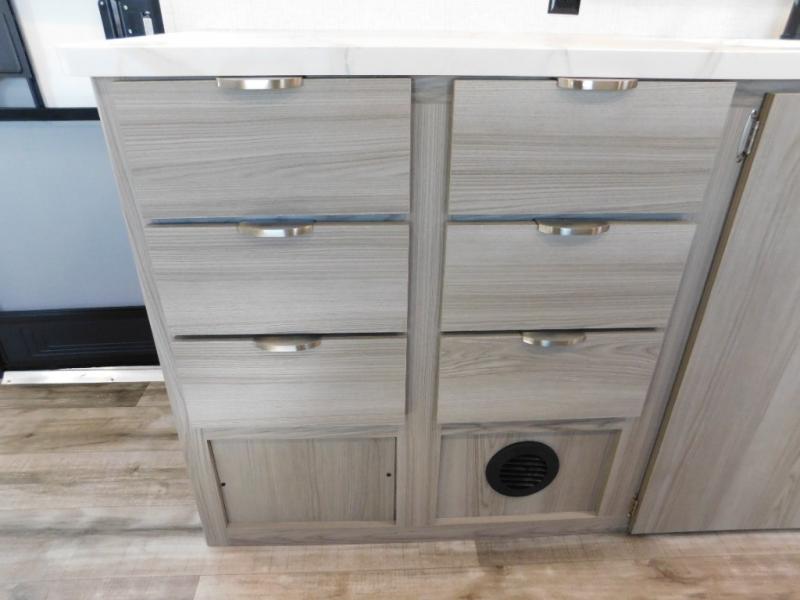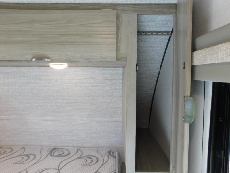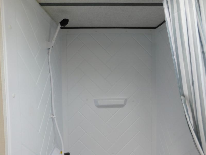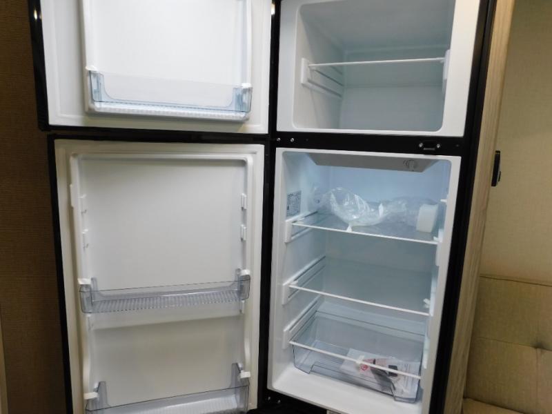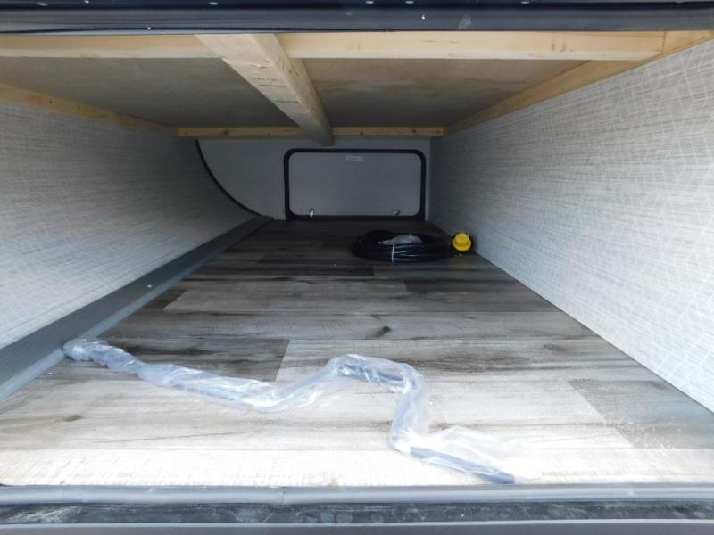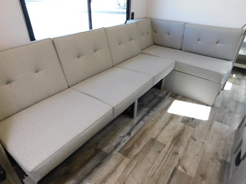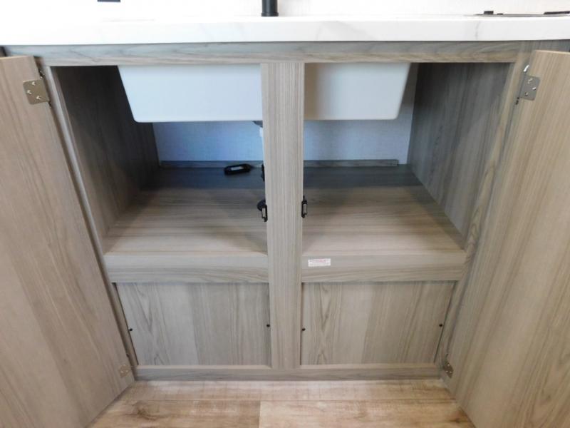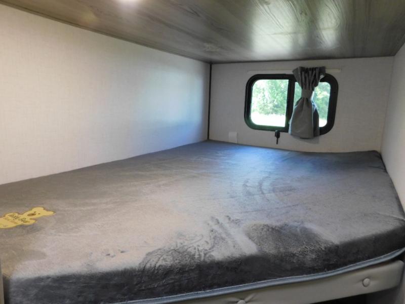 Camping is made easy in this travel trailer with more sleeping space and lots of comforts! The kids or your guests will enjoy the double-size bunks in the back, along with the full bath close by for easy nighttime use. You'll have the front private bedroom with a king bed all to yourselves, and there are dual bedroom wardrobes to keep your space neat and clean. Everyone can meet in the combined kitchen and living room to relax on the super U-lounge with a removable table while the chef of your group makes breakfast on the two burner cooktop. There is also a microwave oven for quick meals, plus a pantry and refrigerator for food storage!