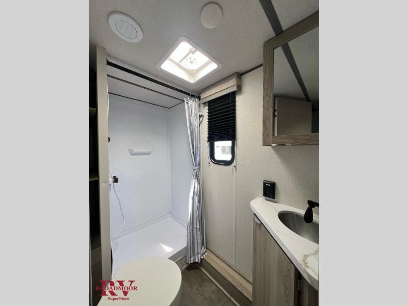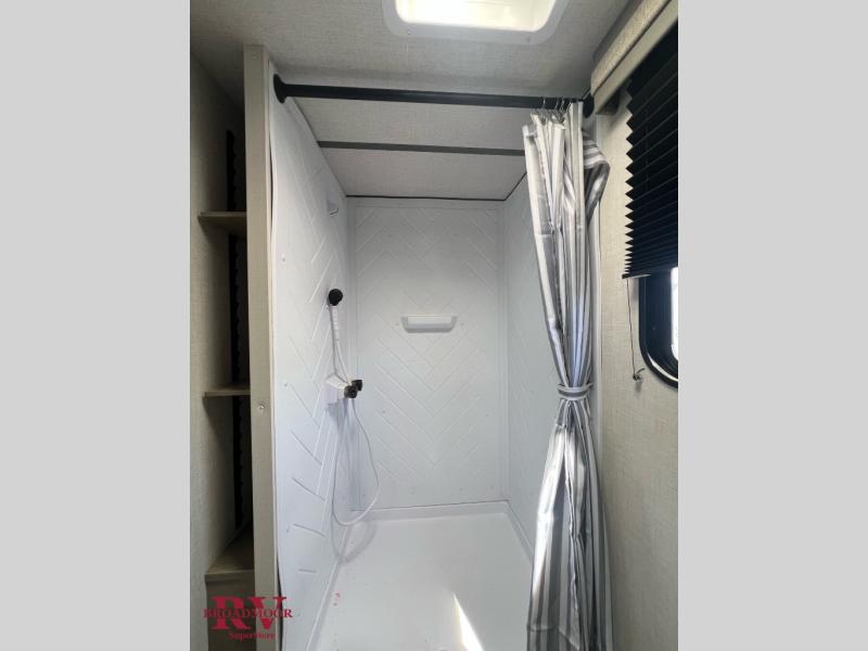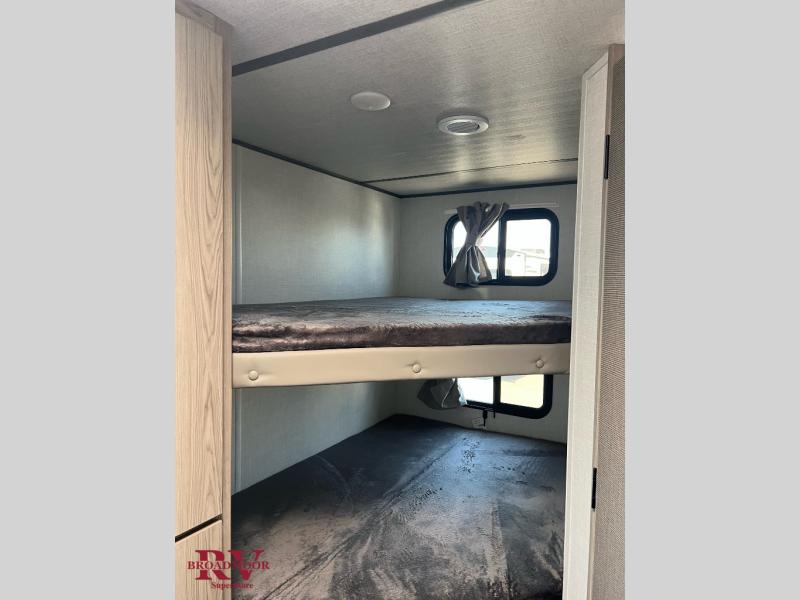 Camping is made easy in this travel trailer with more sleeping space and lots of comforts! The kids or your guests will enjoy the double-size bunks in the back, along with the full bath close by for easy nighttime use. You'll have the front private bedroom with a king bed all to yourselves, and there are dual bedroom wardrobes to keep your space neat and clean. Everyone can meet in the combined kitchen and living room to relax on the super U-lounge with a removable table while the chef of your group makes breakfast on the two burner cooktop. There is also a microwave oven for quick meals, plus a pantry and refrigerator for food storage!