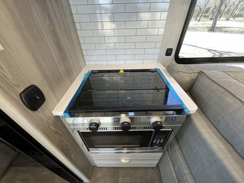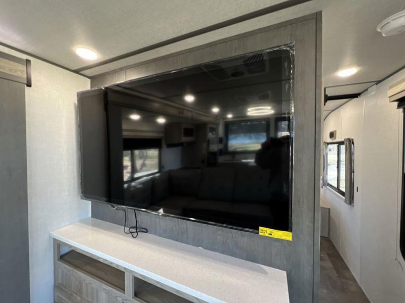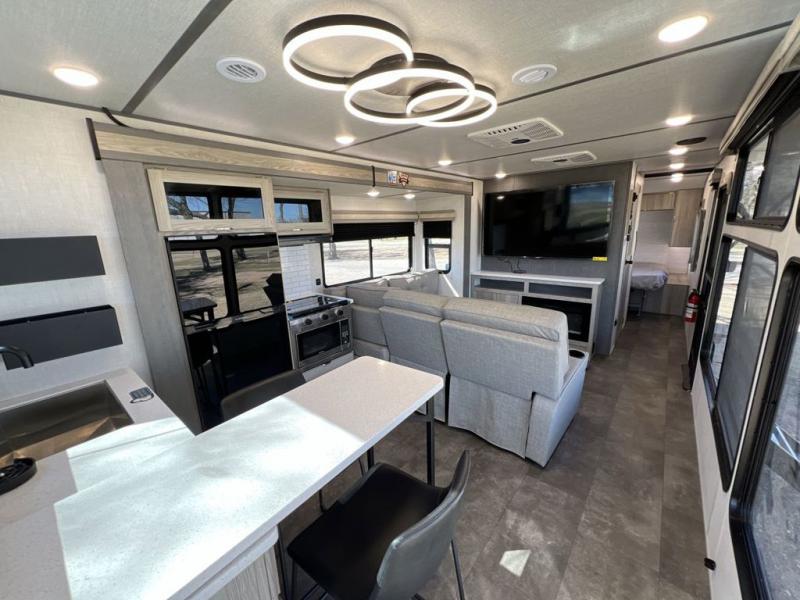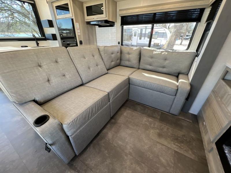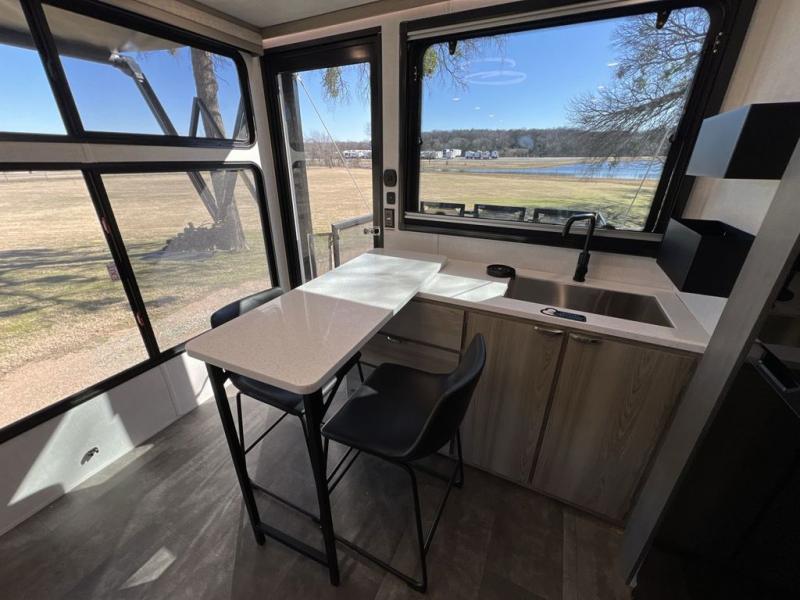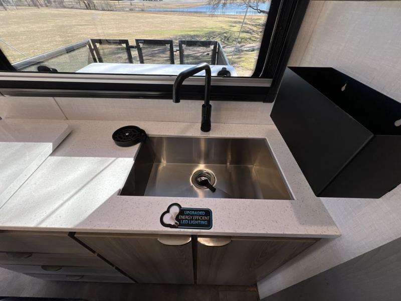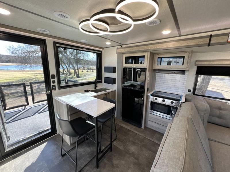This toy hauler is one to remember! There is a ramp door to easily load in gear, a large slide out for more interior space, plus a front private bedroom just like at home. Your crew can relax on the super lounge across from the entertainment center or head outdoors to visit under the awning. The chef of your group will love cooking in the kitchen with ample counter space, including a bar top with two stools.