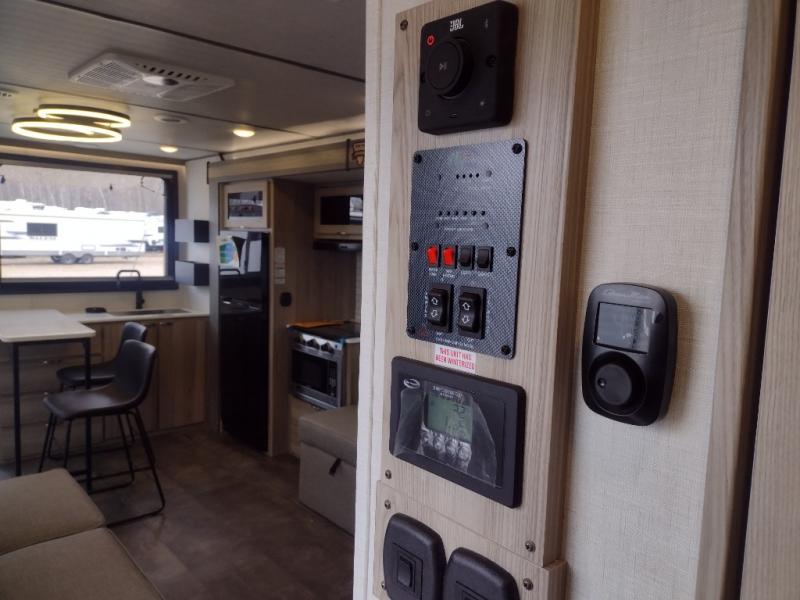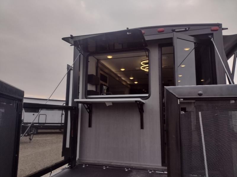 This toy hauler is one to remember! There is a ramp door to easily load in gear, a large slide out for more interior space, plus a front private bedroom just like at home. Your crew can relax on the super lounge across from the entertainment center or head outdoors to visit under the awning. The chef of your group will love cooking in the kitchen with ample counter space, including a bar top with two stools.