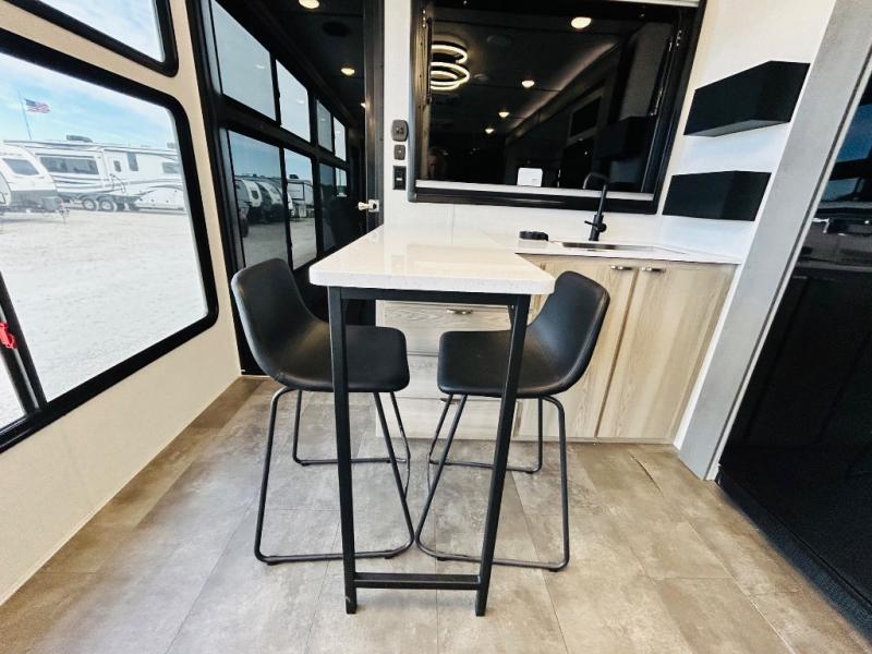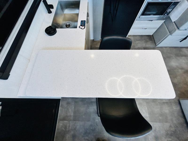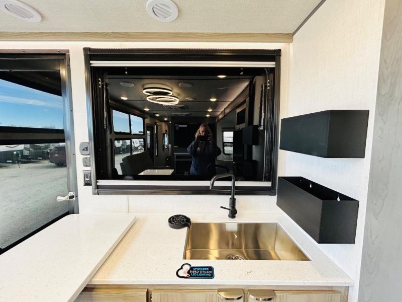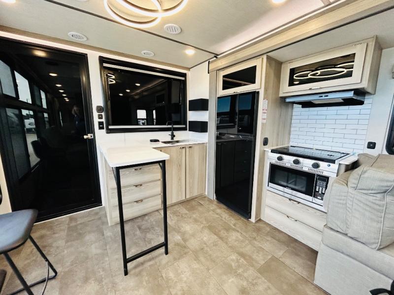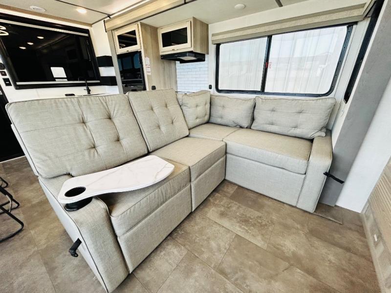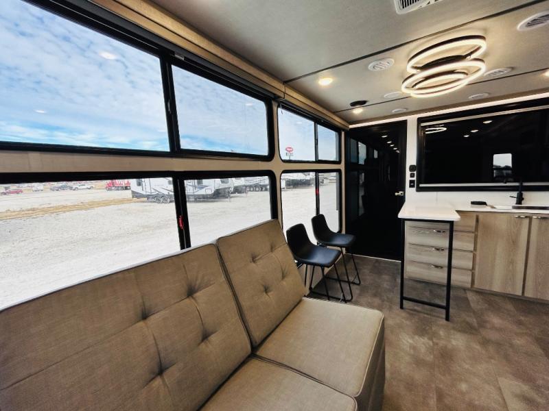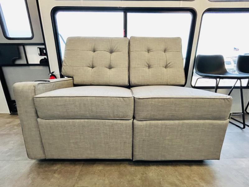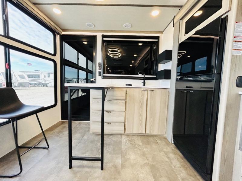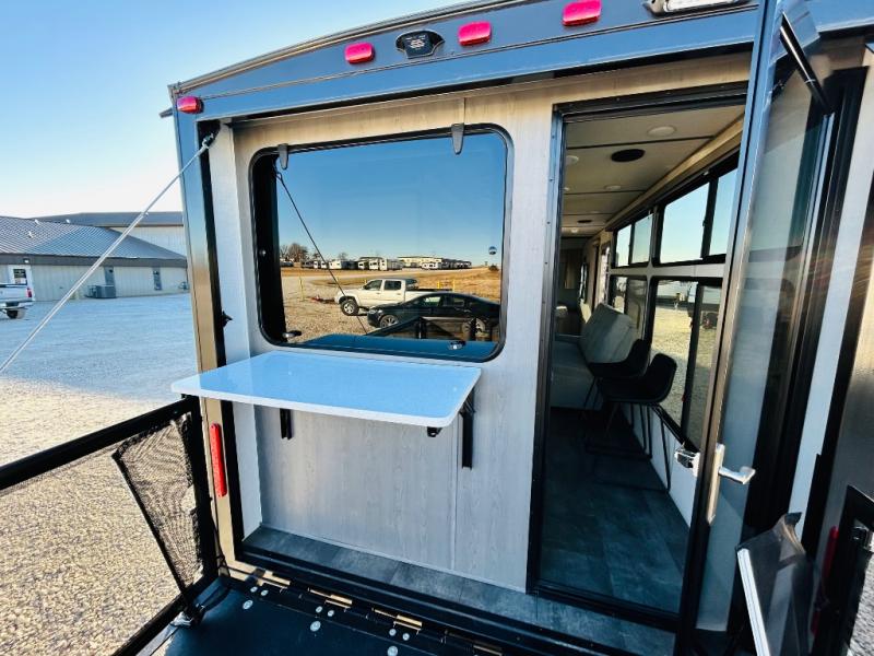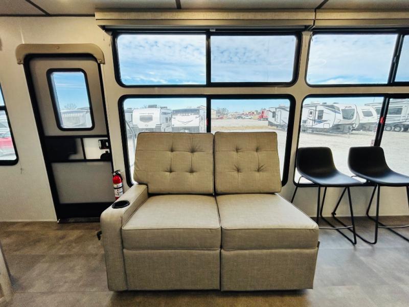 This toy hauler is one to remember! There is a ramp door that converts to a patio, a large slide out for more interior space, plus a front private bedroom just like at home. Your crew can relax on the super lounge across from the entertainment center or head outdoors to visit under the awning. The chef of your group will love cooking in the kitchen with ample counter space, including a bar top with two stools. There is also a kitchen bar window that will allow the cook to visit with those sitting on the patio, and if you need to bring bicycles along, you can easily load them in through the ramp door!