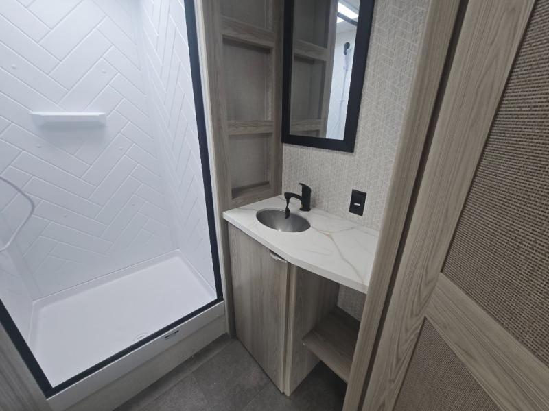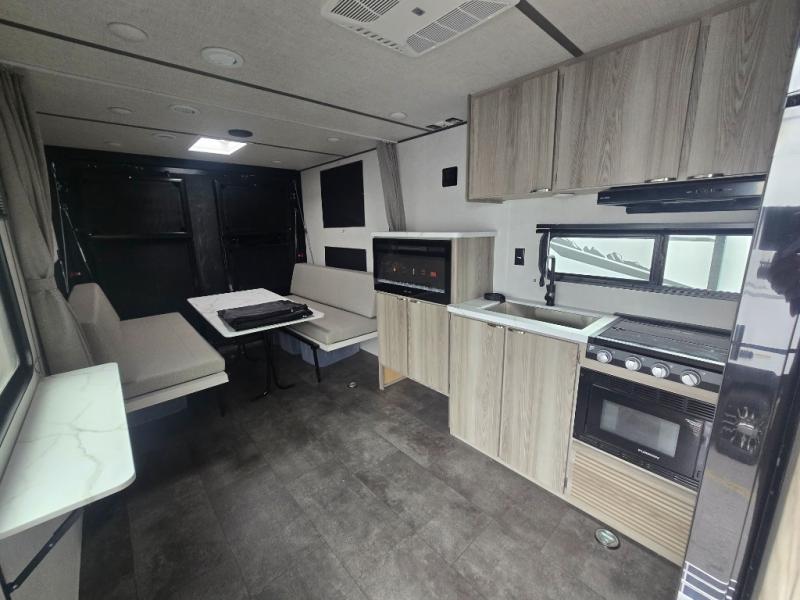 Make the most of your vacations with this MAX toy hauler! The 14' garage area includes dual sofa sleepers with a table in between to dine at, plus a 3,000 lb. ramp door for easy unloading. Enjoy the fireplace for a cozy evening indoors while your dinner is cooking on the three burner cooktop or being heated up in the microwave. After a fun day of trail riding, you can clean the mud out of your hair with the 30" x 36" shower with a skylight in the full bathroom. The front private bedroom has a king bed to lay your head on at night, shoe storage under the bed, a walk-in closet, and wardrobes on either side of the bed for even more clothing storage space.