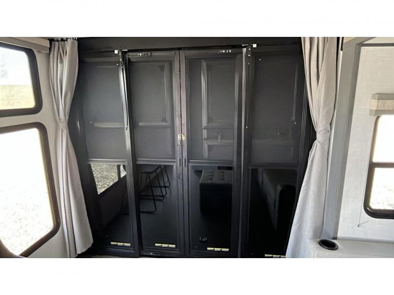 There is a lot to love about this versatile cargo trailer! Starting with the 1,500 lb. patio with a three seasons door that leads into the main living area. The large slide out here features theater seating with a chaise lounge, a dual swinging 12V refrigerator, and cooktop. The kitchen also has a hutch and island with sink and flip-up countertop. You even have a movie theater projector with premium sound to watch your favorite movies in style. The set of bunk beds have their own privacy with a secret door to access them and a bike door for outside access. Everyone can freshen up with the large shower in the full bathroom. The front private bedroom has a king bed with Versa tilt, wardrobes on either side of the bed, and another wardrobe to keep your clothes looking their best! This unit can be designed with optional space to carry larger toys if needed; see dealer for more details.