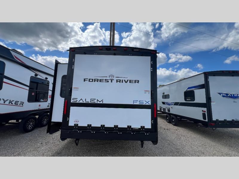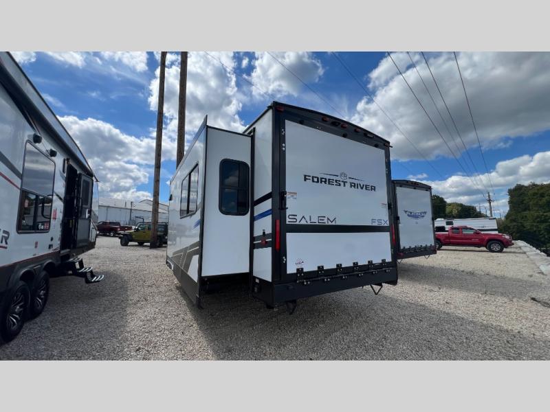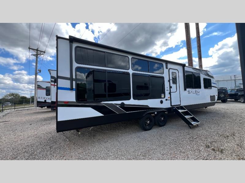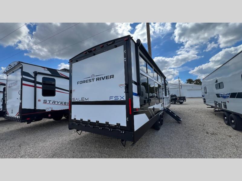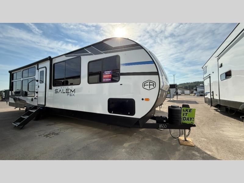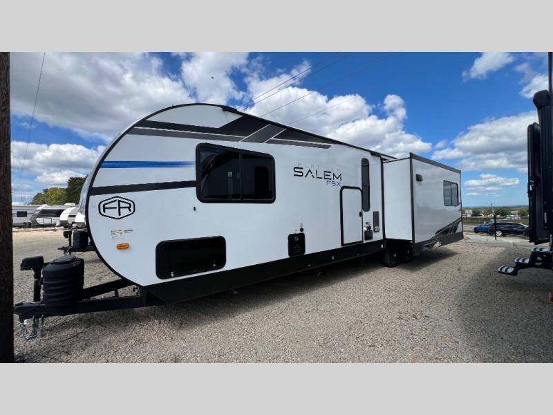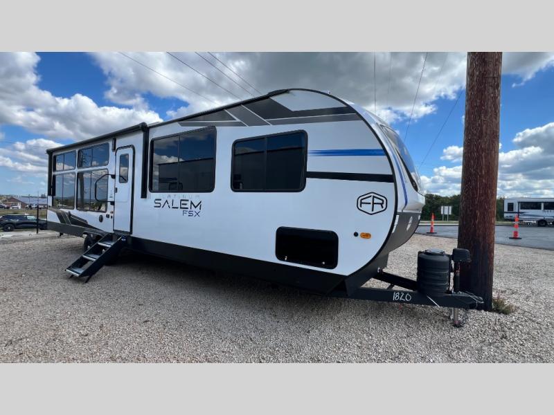 The Forest River Salem FSX travel trailers and toy hauler travel trailers are ultra comfortable and lightweight, perfect for first time or seasoned campers alike! You will love how easy it will be to relax with residential features that will make your space feel just like home, and the durable construction means you can enjoy your RV for years to come. There are a wide variety of floorplans to choose from, including couple's trailers, bunk models, and toy haulers, all with full bath and kitchen amenities and plenty of storage for all your gear!