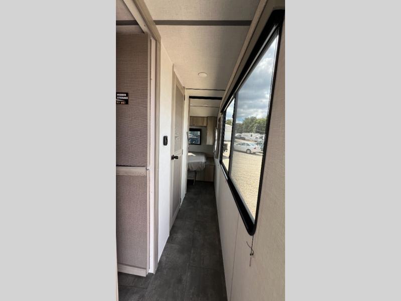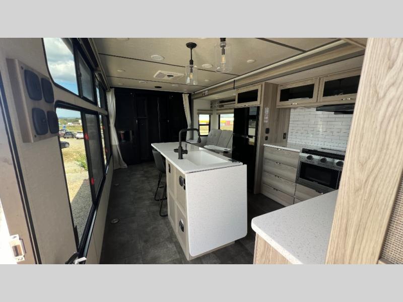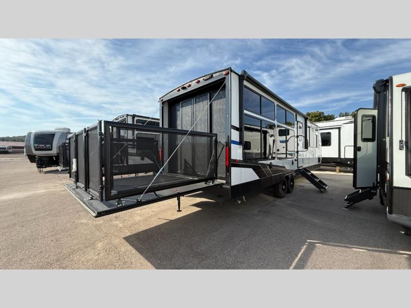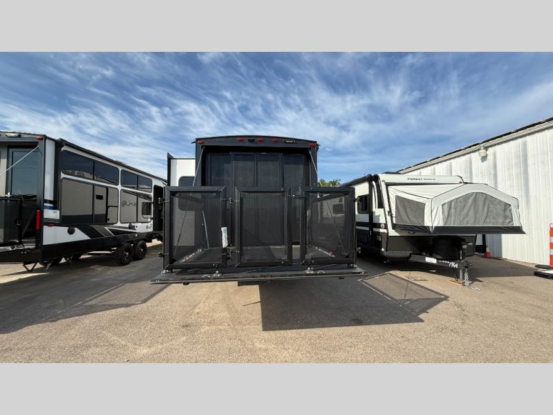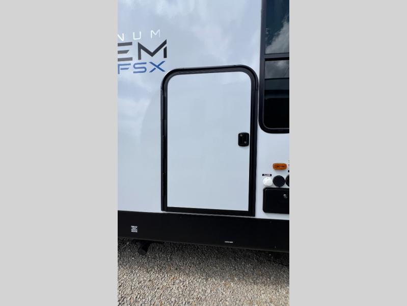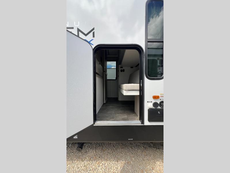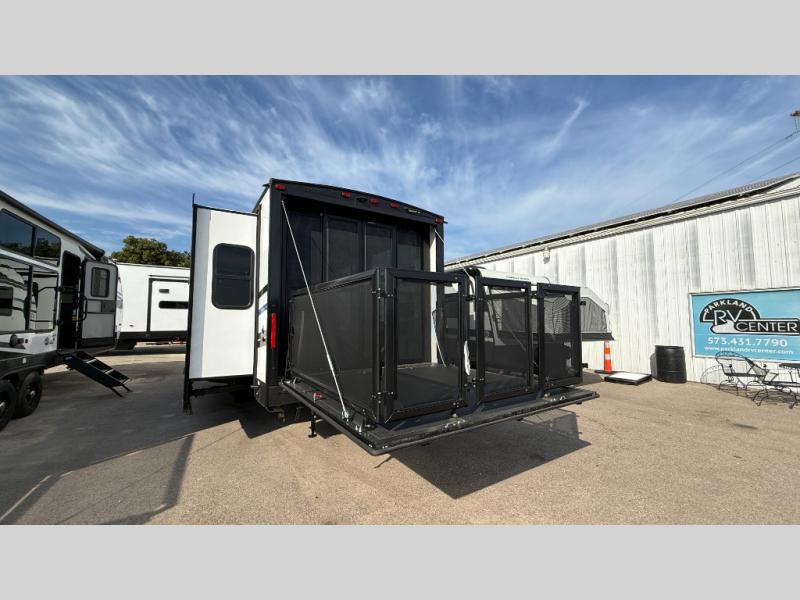 There is a lot to love about the FSX 30VCVIEWX toy hauler! Starting with the 1,500 lb. patio with a three-seasons door that leads into the garage area. Once you remove your off-road toy from the 1,500 lb. tie downs, you can open up the slide and enjoy the open area with a hide a bed sofa ottoman and wall storage with area to mount a TV. The kitchen includes a 12-volt refrigerator, three-burner cooktop, and convection microwave. The kitchen also has an island with sink and flip-up countertop extension on each side. One flip-up countertop serves as a breakfast bar, and comes with two bar stool seats. You even have a movie theater projector with premium sound to watch your favorite movies in style. The bunk area is private with a secret door to access it--and includes one bunk and a jackknife sofa, as well as a flip-up desk. There is also a bike door for outside access. The full bath has a roomy shower, vanity with sink, and toilet. The front bedroom has a Versa-Tilt king bed, wardrobes on either side of the bed, a storage area with baskets and shelving, and underbed storage. Enjoy the outdoors with the 22' power awning with LED lighting and pass-through storage!
